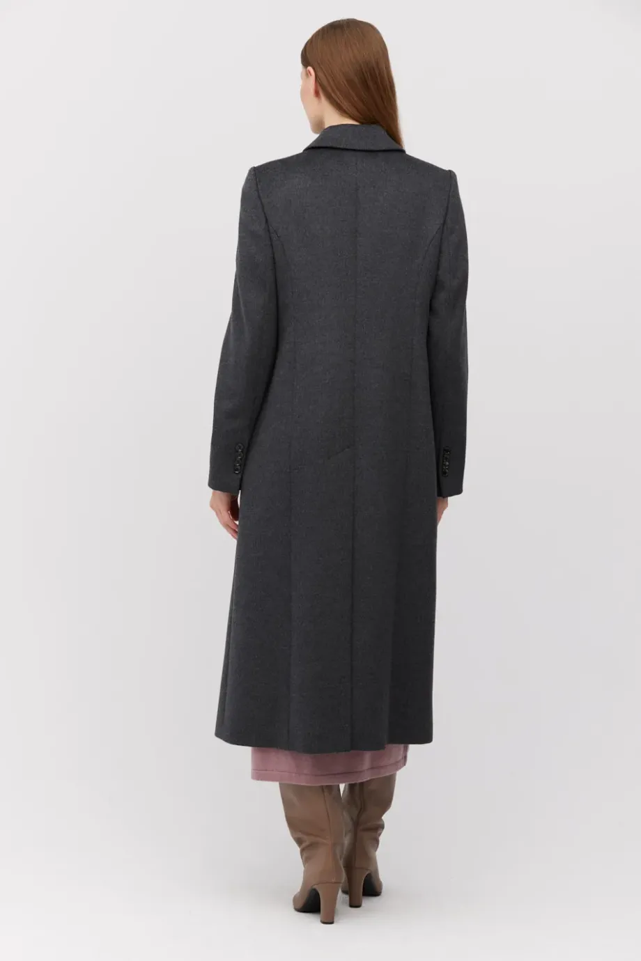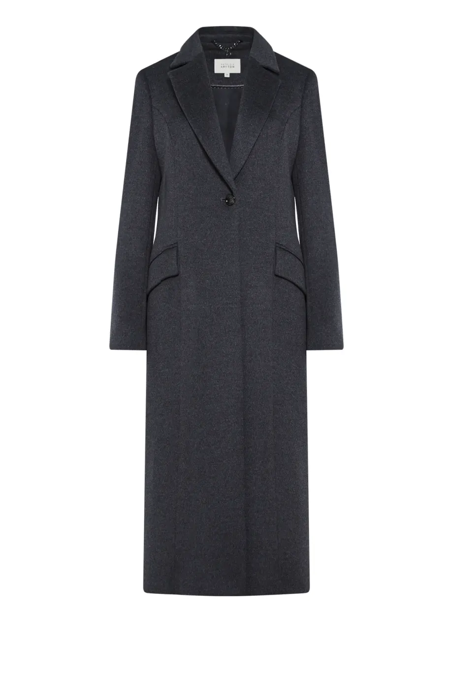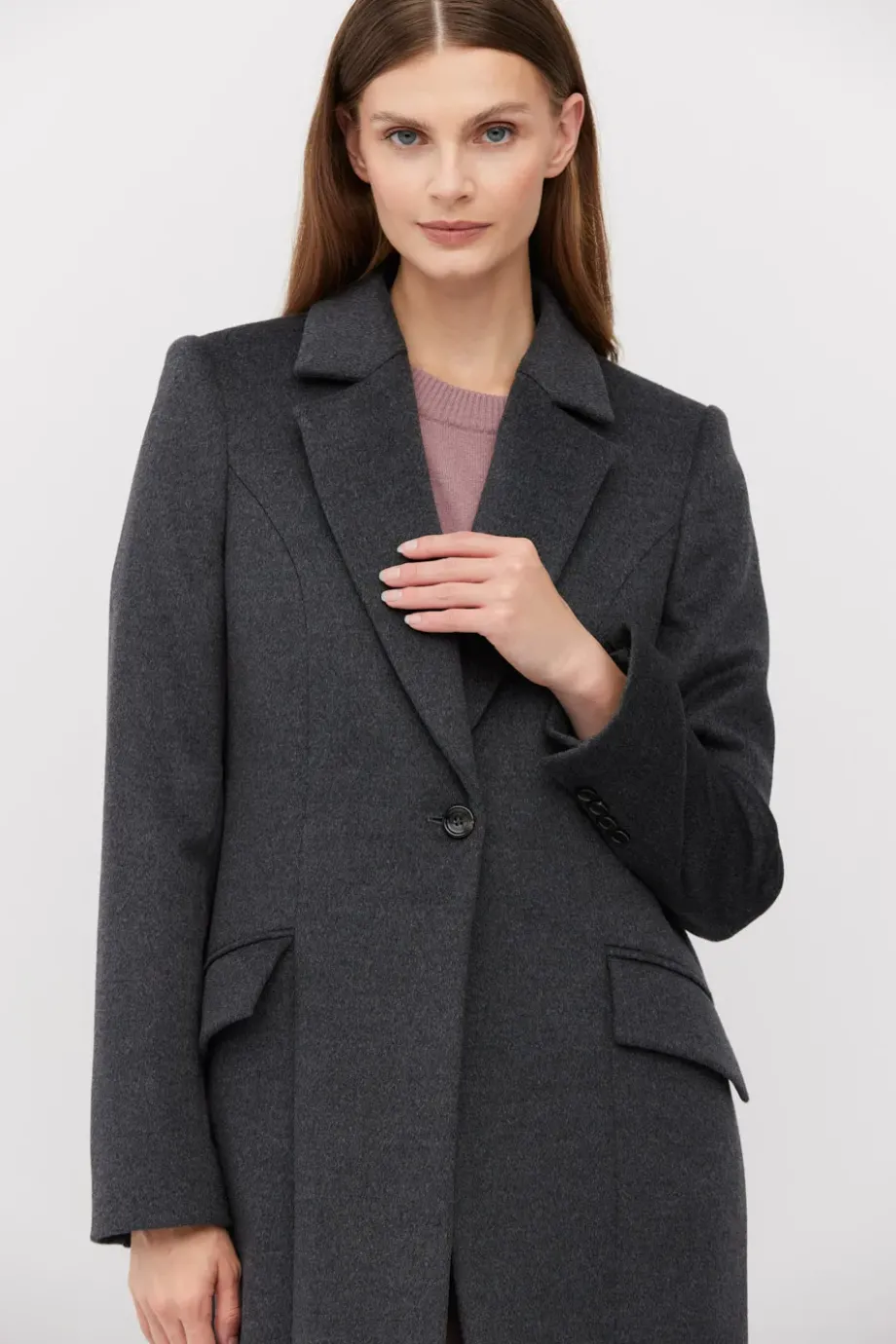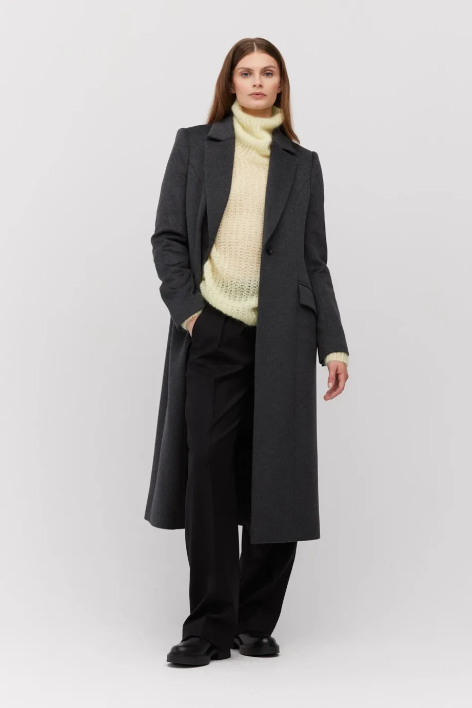 Tmavě šedý vlněný plášť klasického střihu, zapínaný na jeden knoflík. Model na podšívce, s kapsami s klopou. Délka midi.