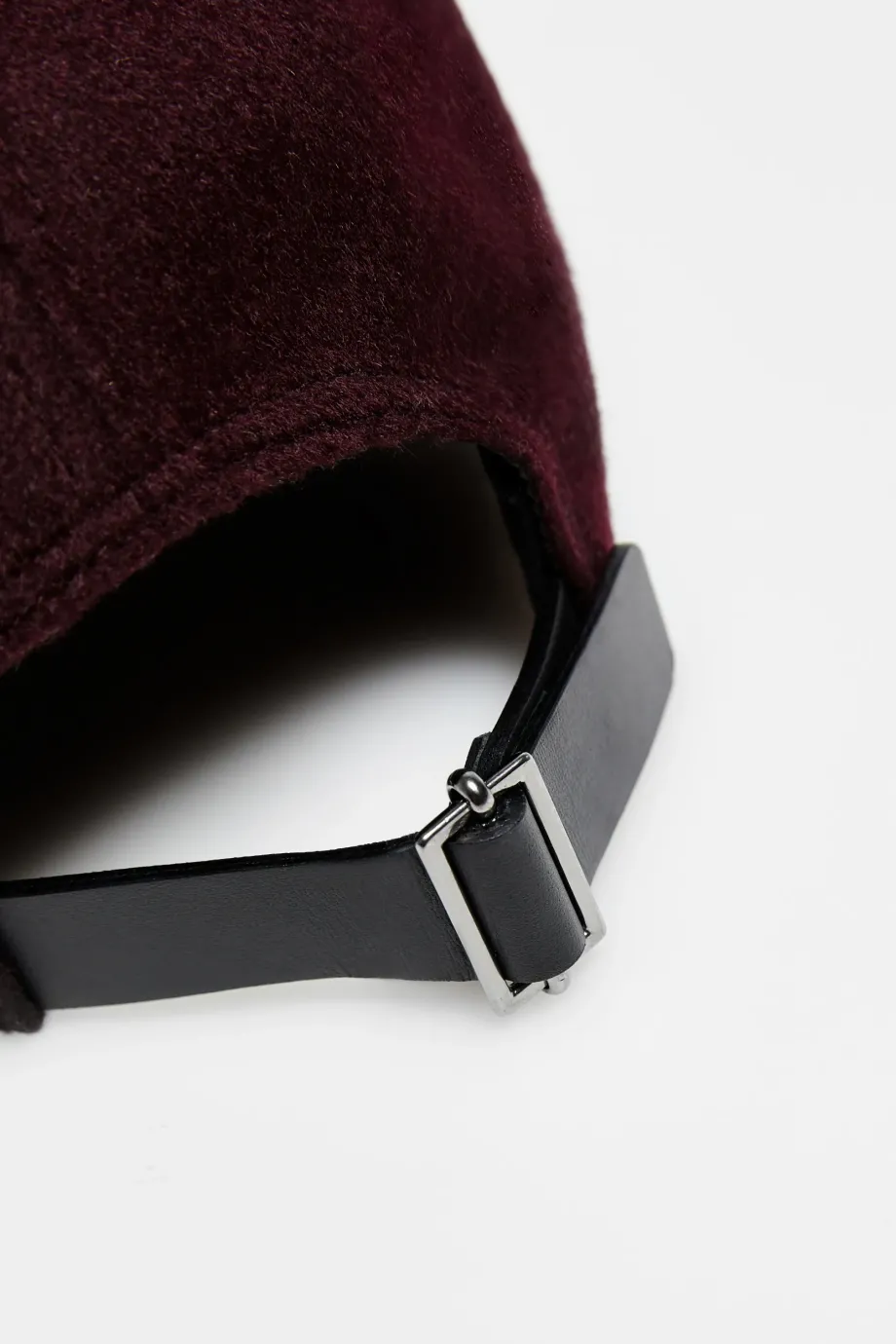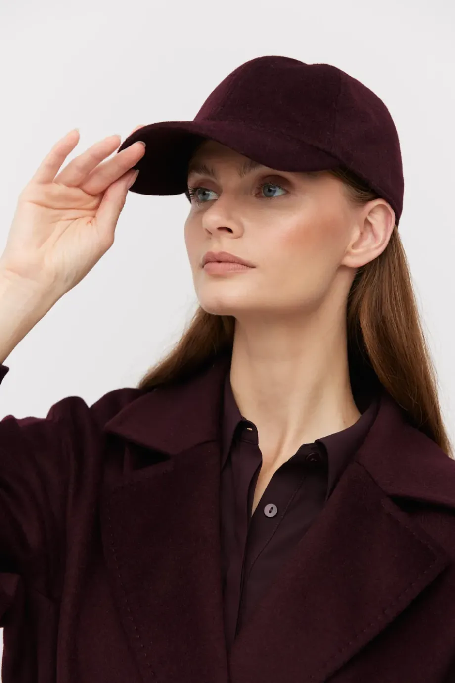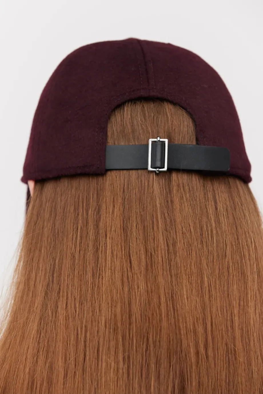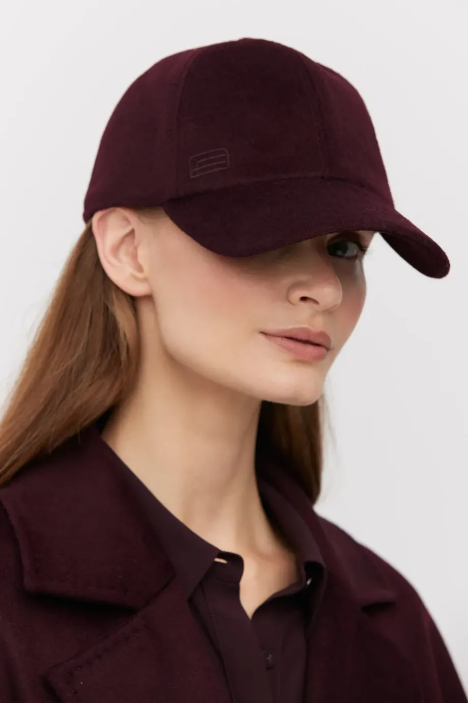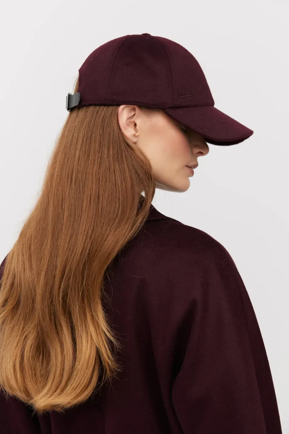 Kšiltovka v barvě lilek. Vyrobena z vlny s příměsí kašmíru a hedvábí. Na zadní straně s nastavitelným zapínáním.
