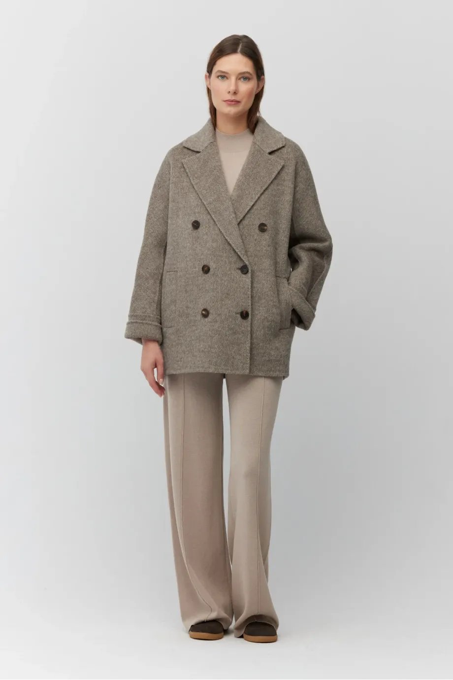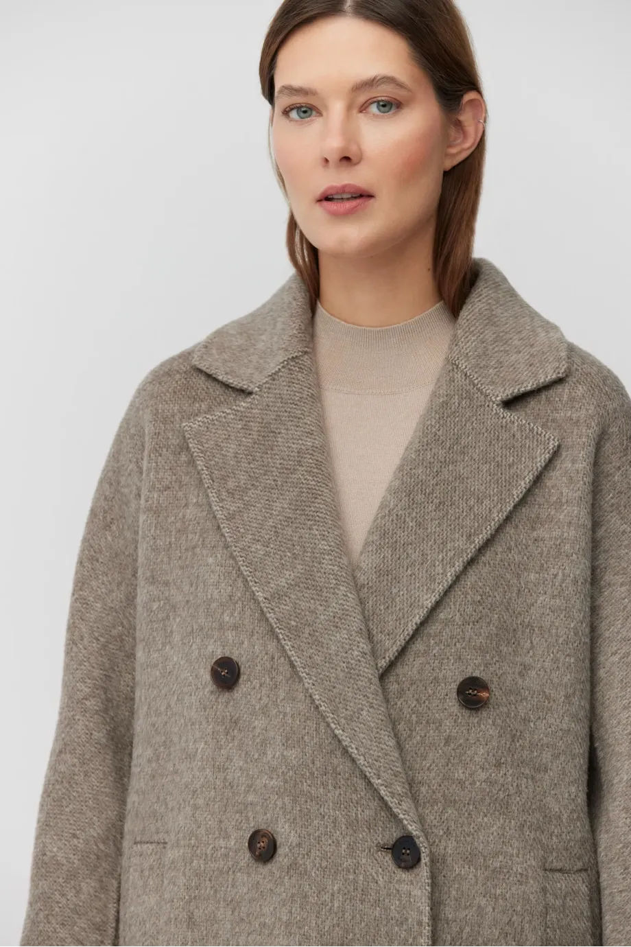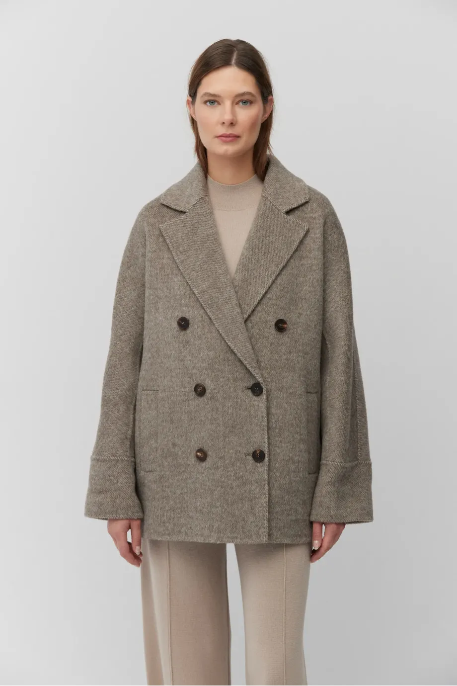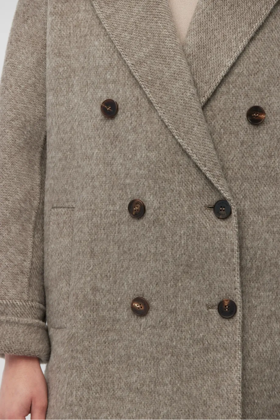 Dvojitá kabát z vlny s příměsí alpak, volného střihu, nevyšívaný, dvouřadý, s límcem a kapsami. Barva hnědá, v houndstooth vzoru.