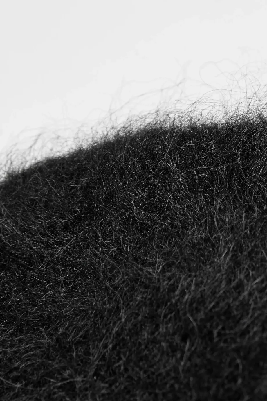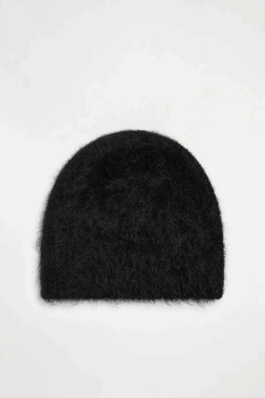 Čepice z alpaky. Pletenina s delšími vlákny s volným jednolícním úpletem, vyrobená na stroji s jemností 3 GG. Barva černá.