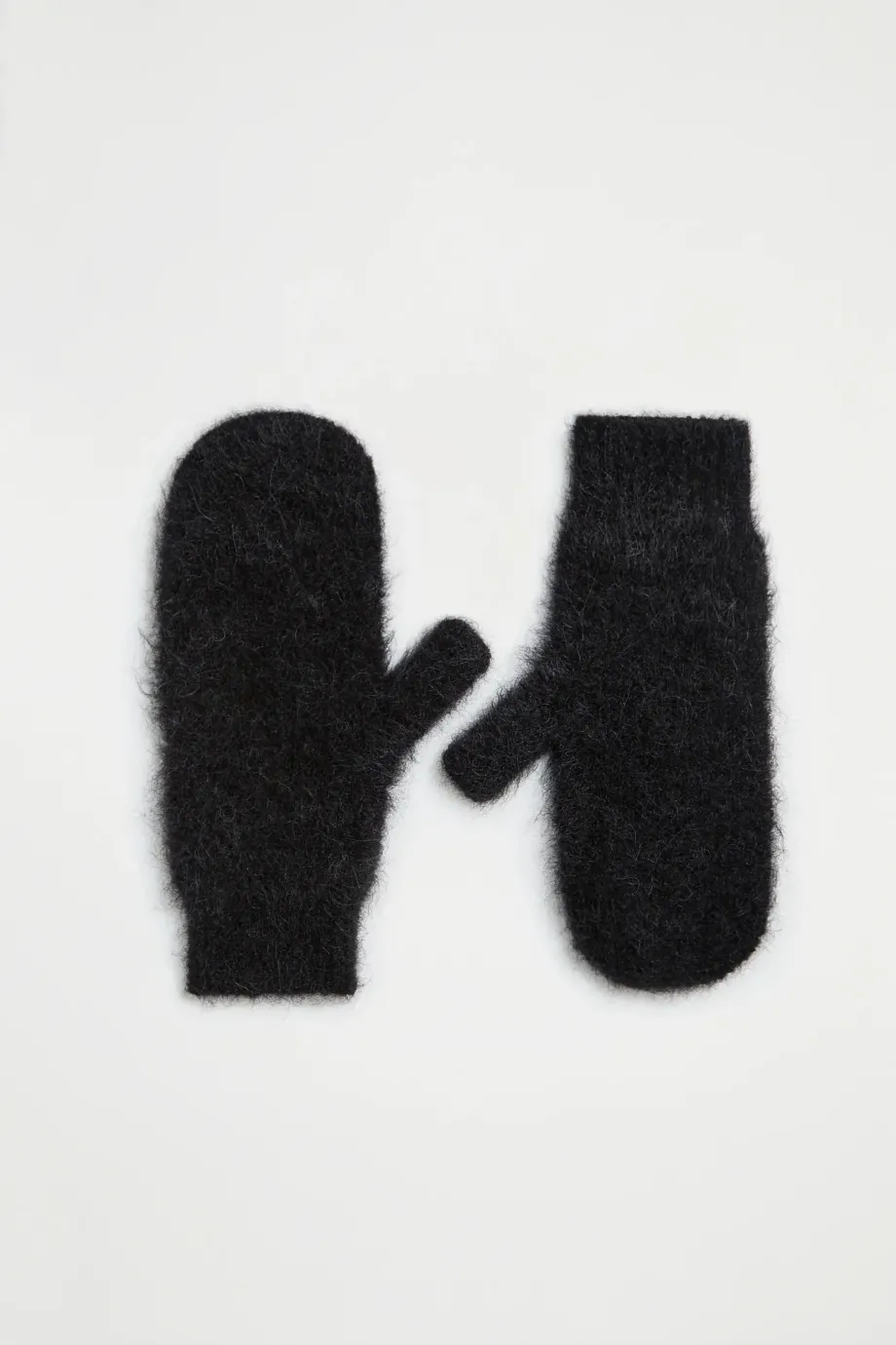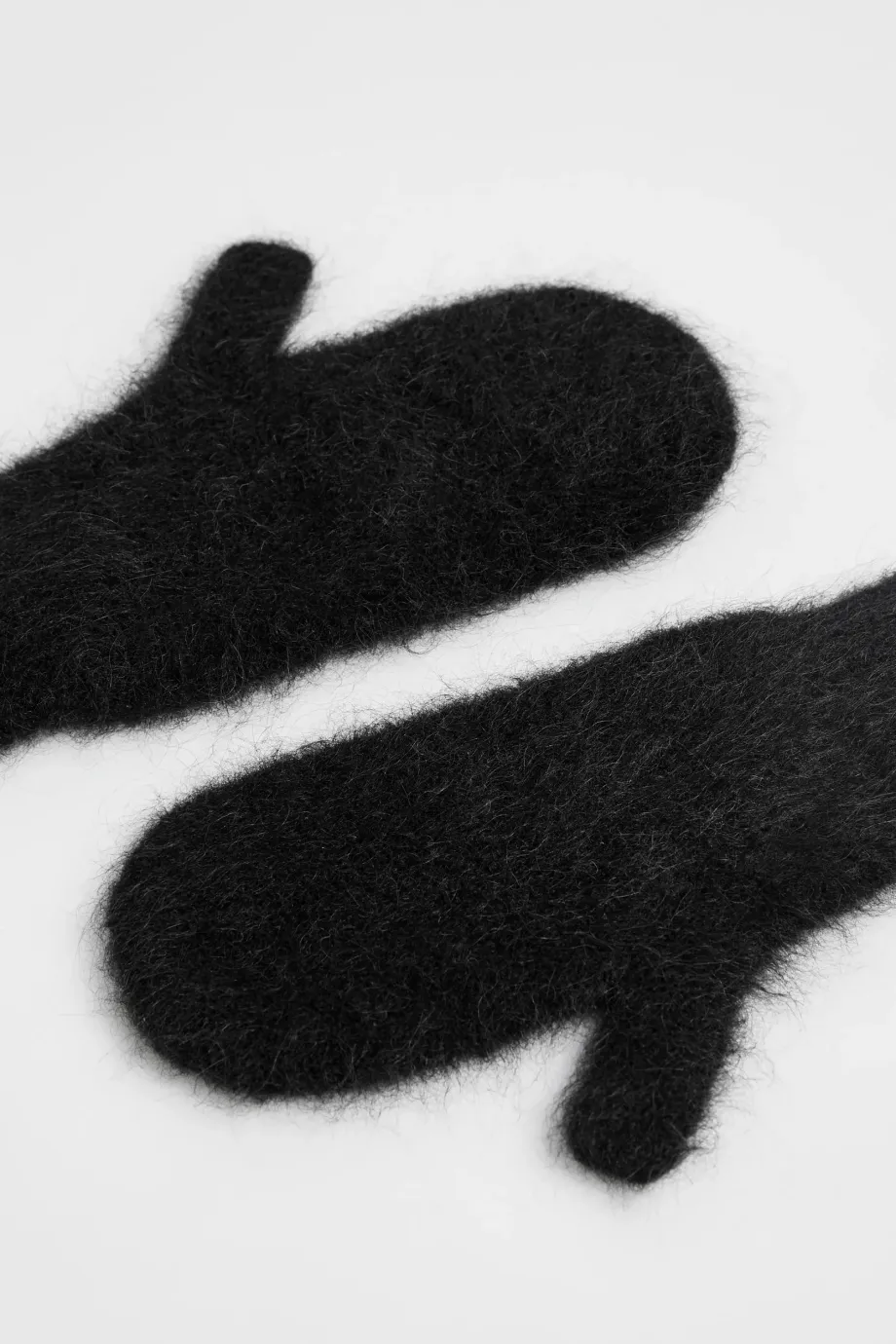 Rukavice s vlnou suri alpaky. Pletenina s delšími chlupy, s volným úpletem single jersey, vyrobená na stroji s upletem 3 GG. Barva černá.