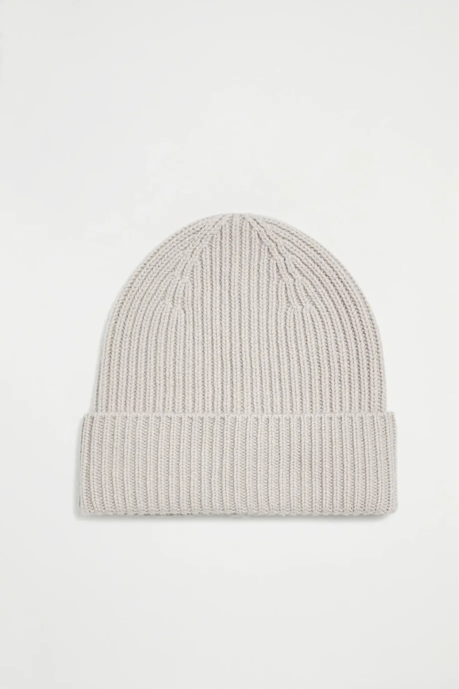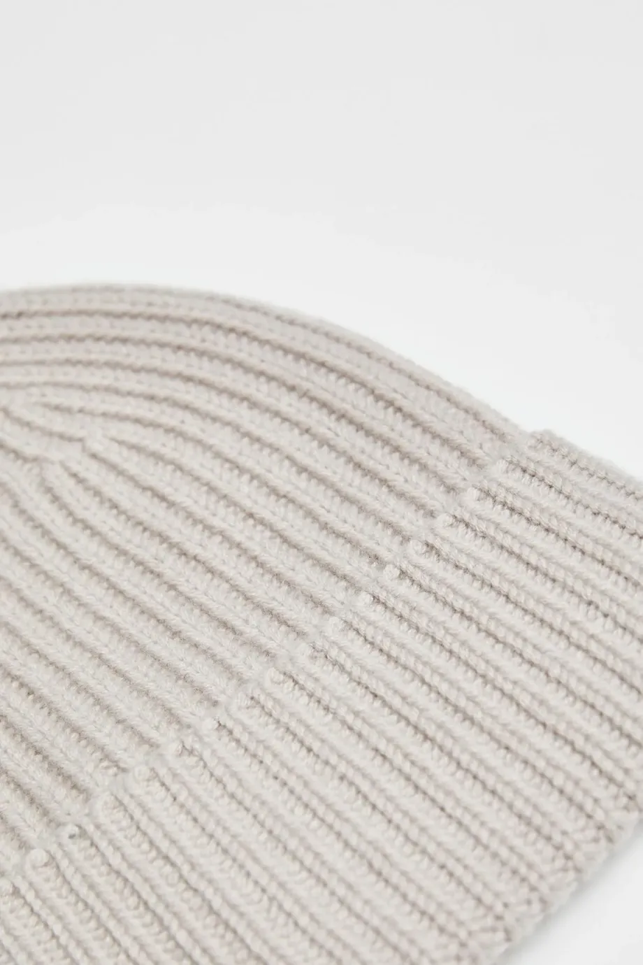 Čepice s příměsí kašmíru. Měkká pletenina, anglický žerzej. Barva studená béžová.