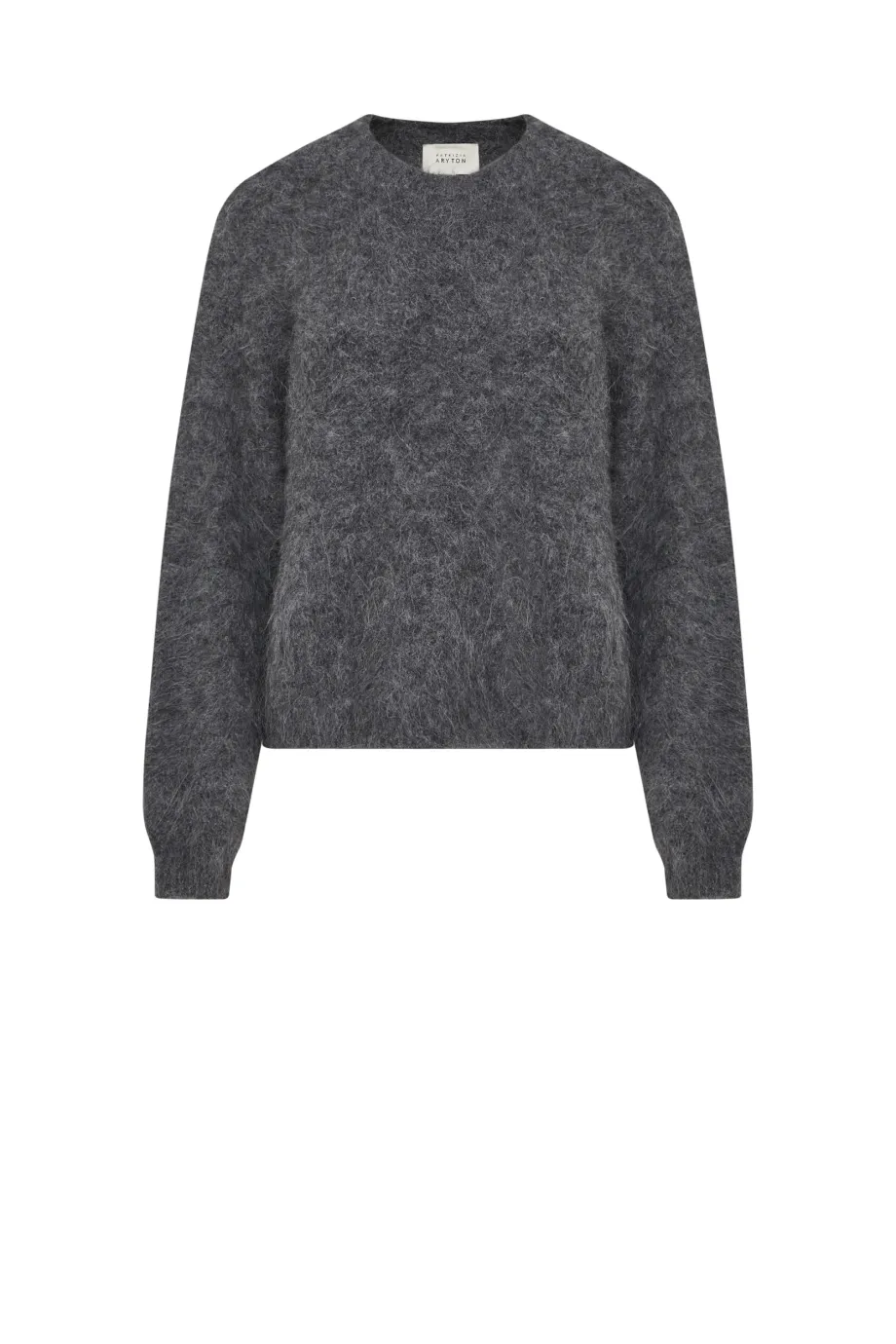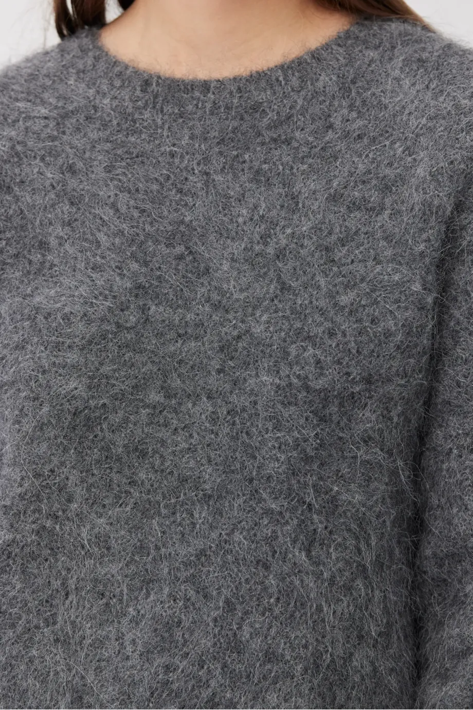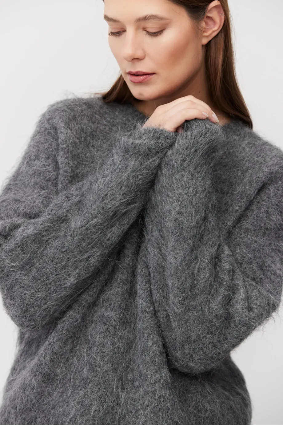 Šedý svetr s alpaka vlnou. Kulatý výstřih, dlouhý rukáv. Měkká, teplá pletenina s delšími vlákny. Volná vazba single jersey, připravená na stroji s uiglením 3 GG.