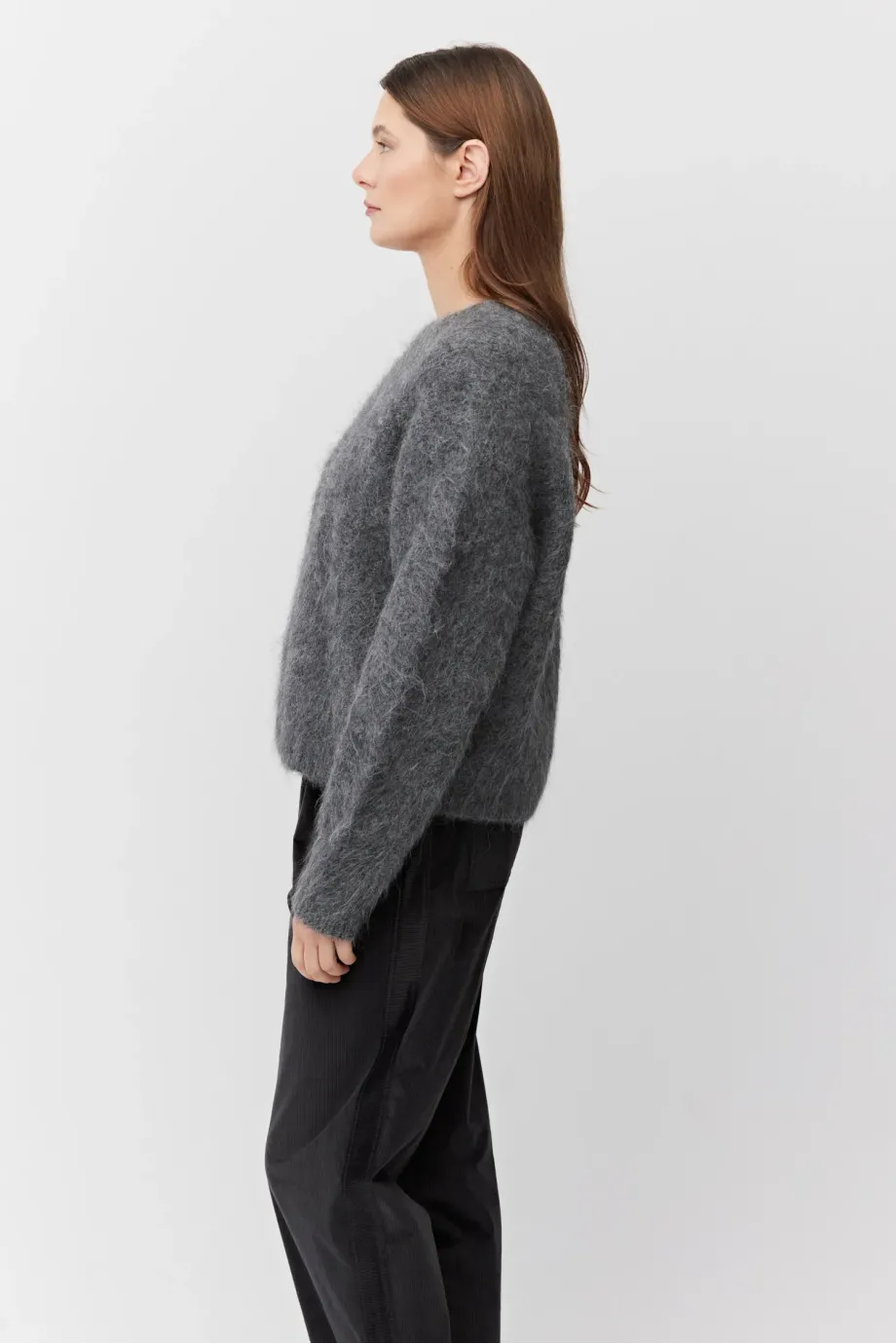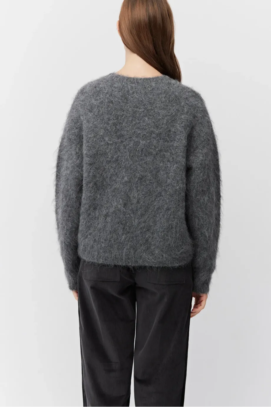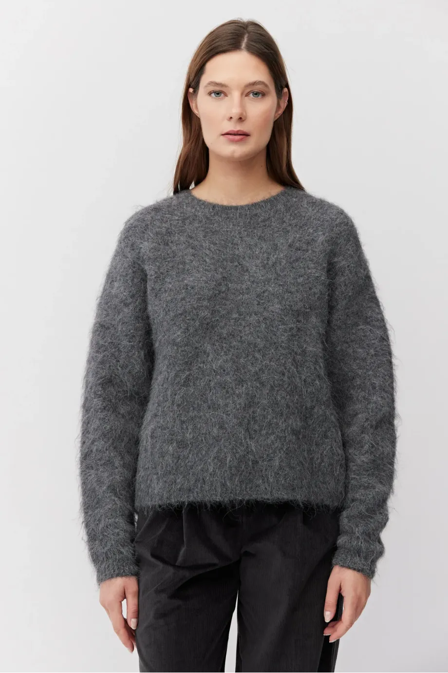 Šedý svetr s alpaka vlnou. Kulatý výstřih, dlouhý rukáv. Měkká, teplá pletenina s delšími vlákny. Volná vazba single jersey, připravená na stroji s uiglením 3 GG.