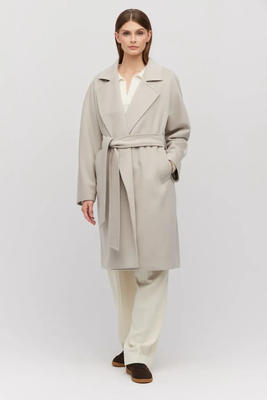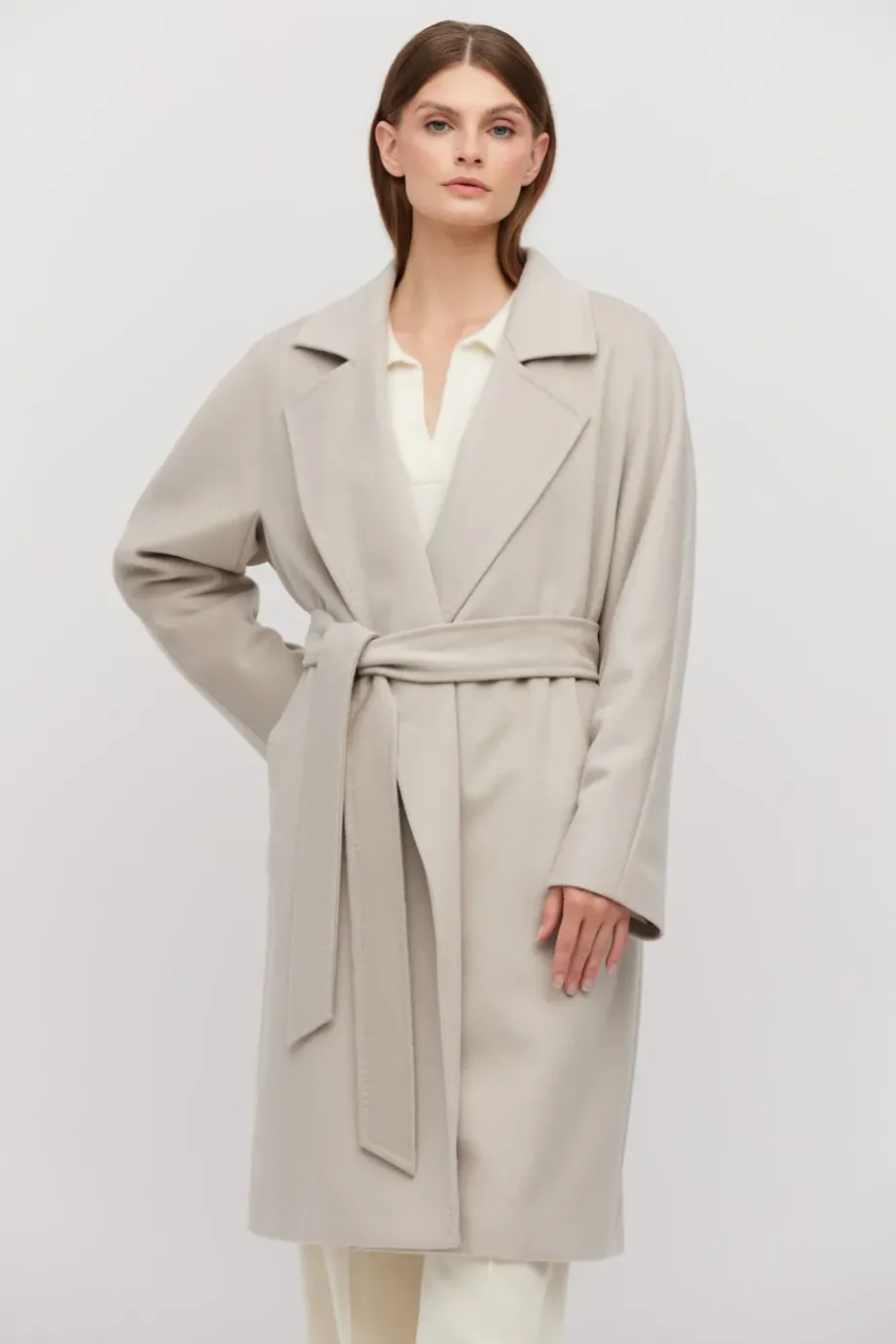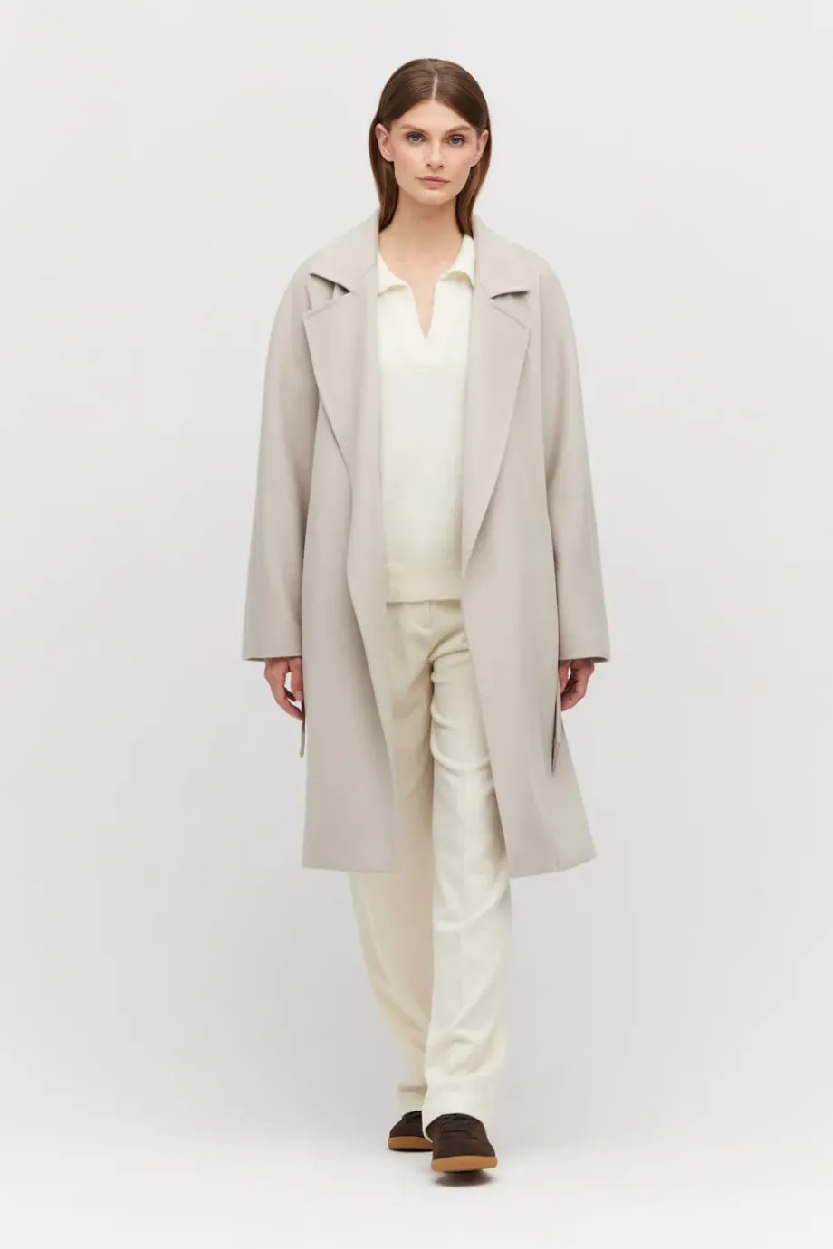 Vlněný kabát s páskem, bez zapínání. Jednoduchý tvar, blíže k tělu, s kimono rukávem vpředu a raglánem vzadu. Podšívka, s ozdobným paspule. Délka lehce nad kolena.