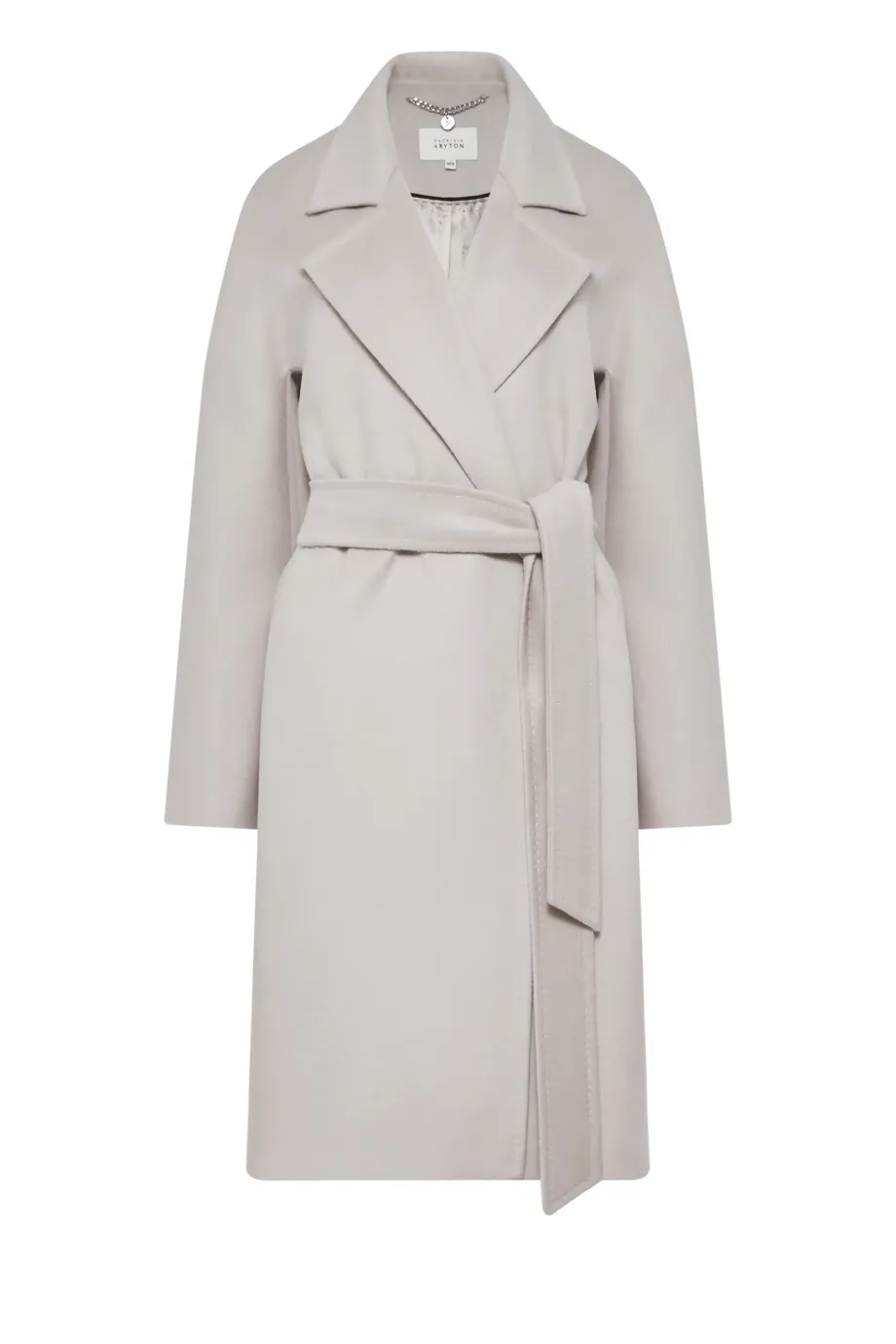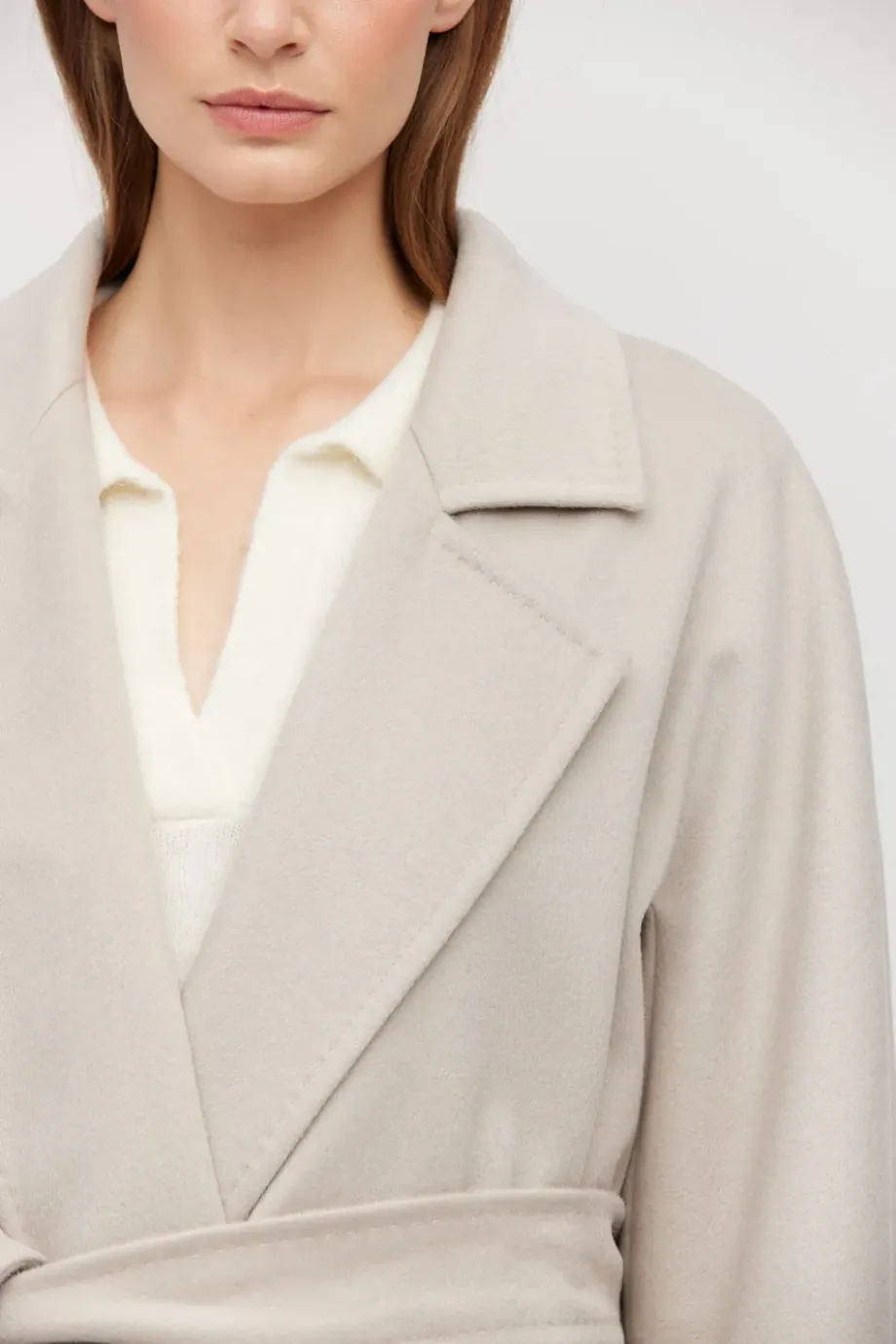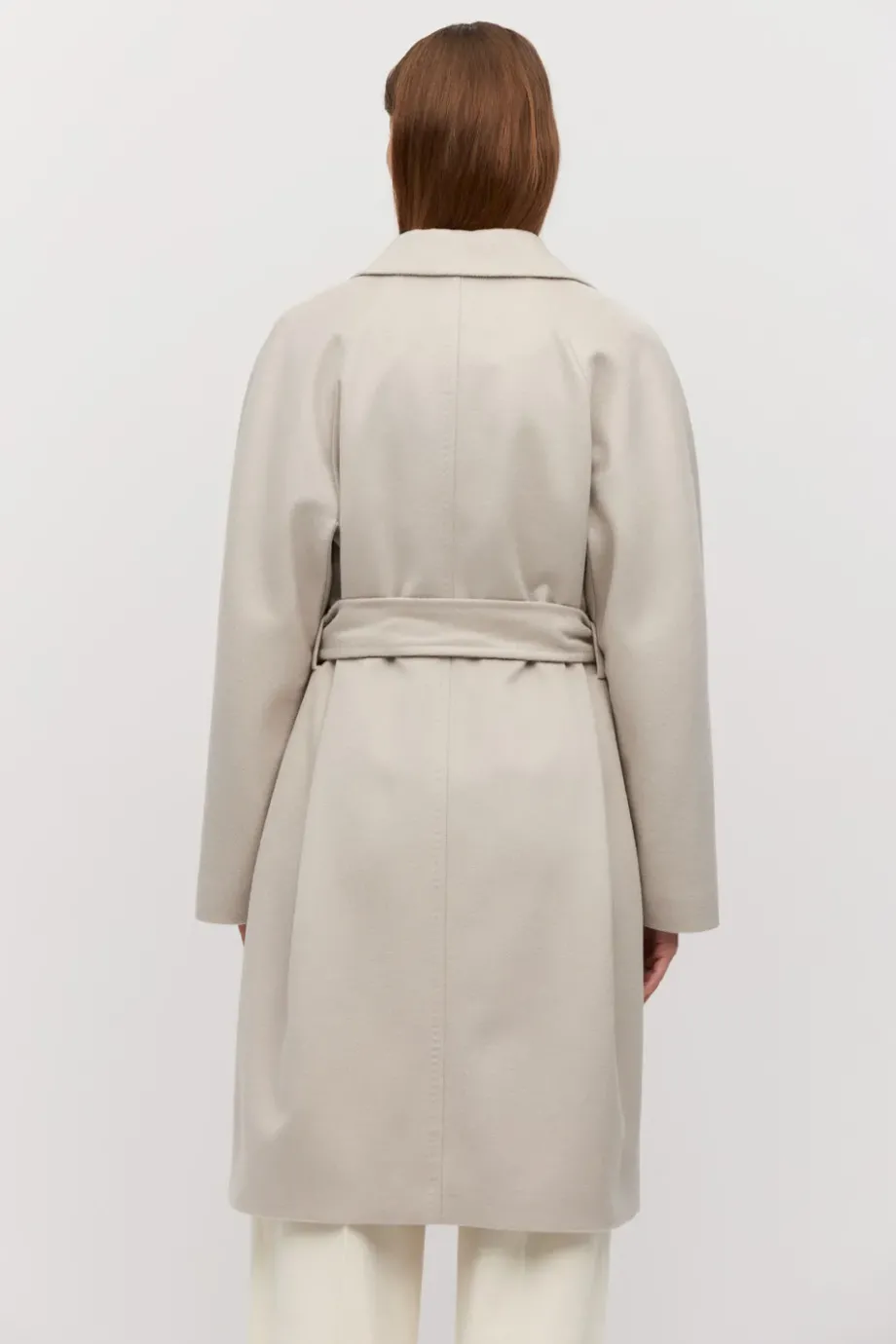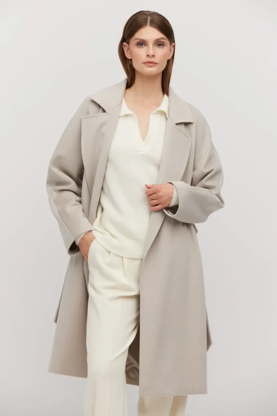 Vlněný kabát s páskem, bez zapínání. Jednoduchý tvar, blíže k tělu, s kimono rukávem vpředu a raglánem vzadu. Podšívka, s ozdobným paspule. Délka lehce nad kolena.