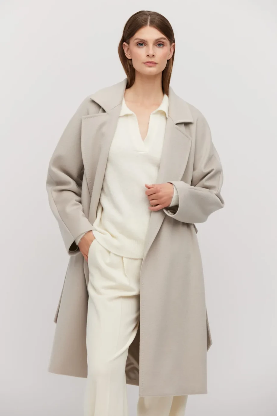 Béžový vlněný kabát s páskem