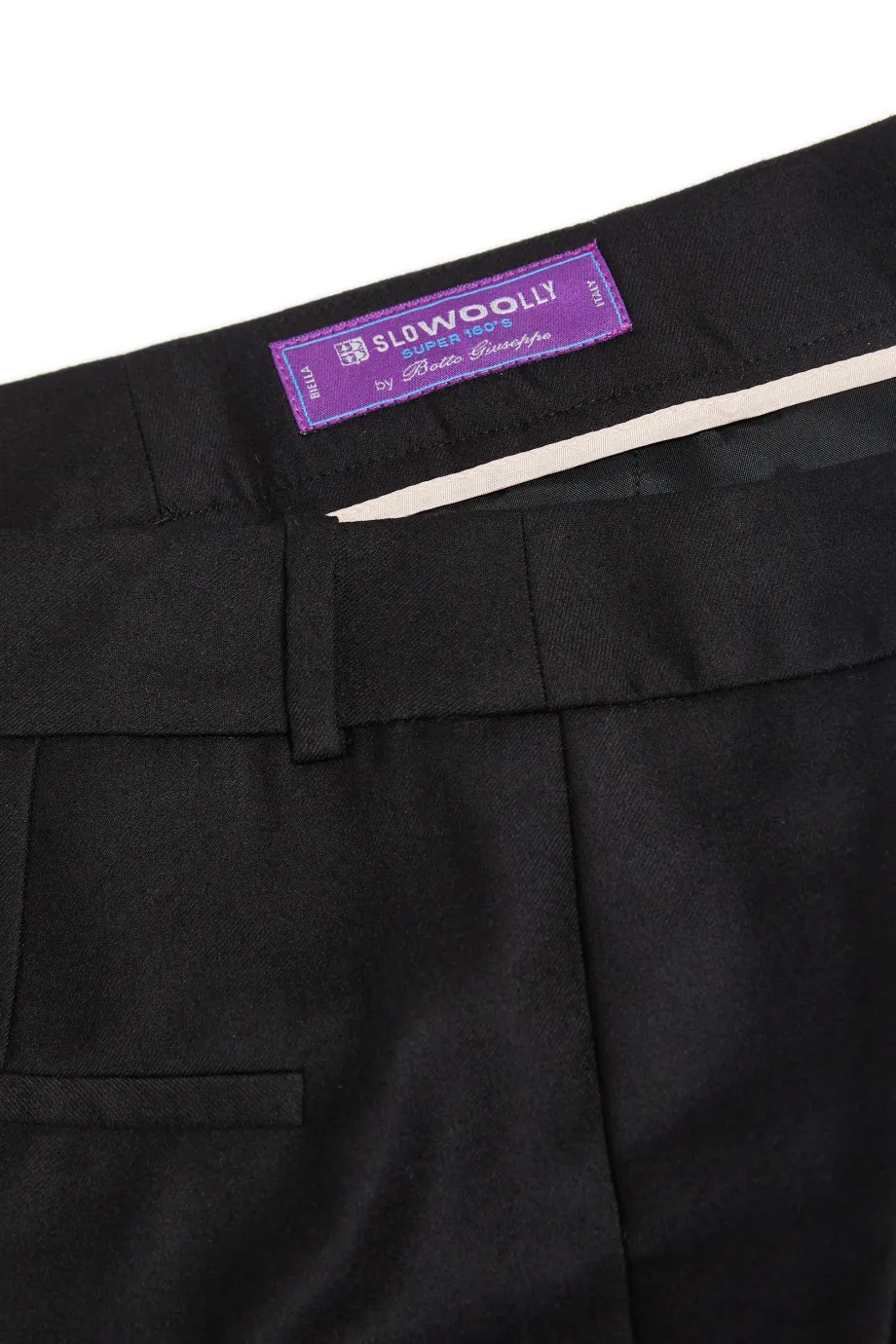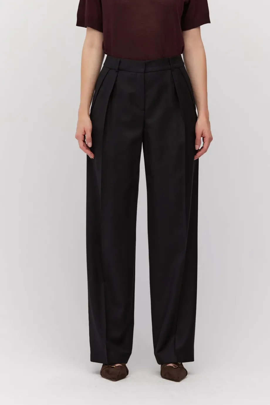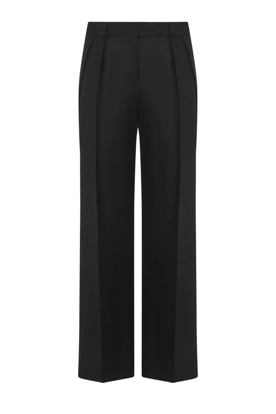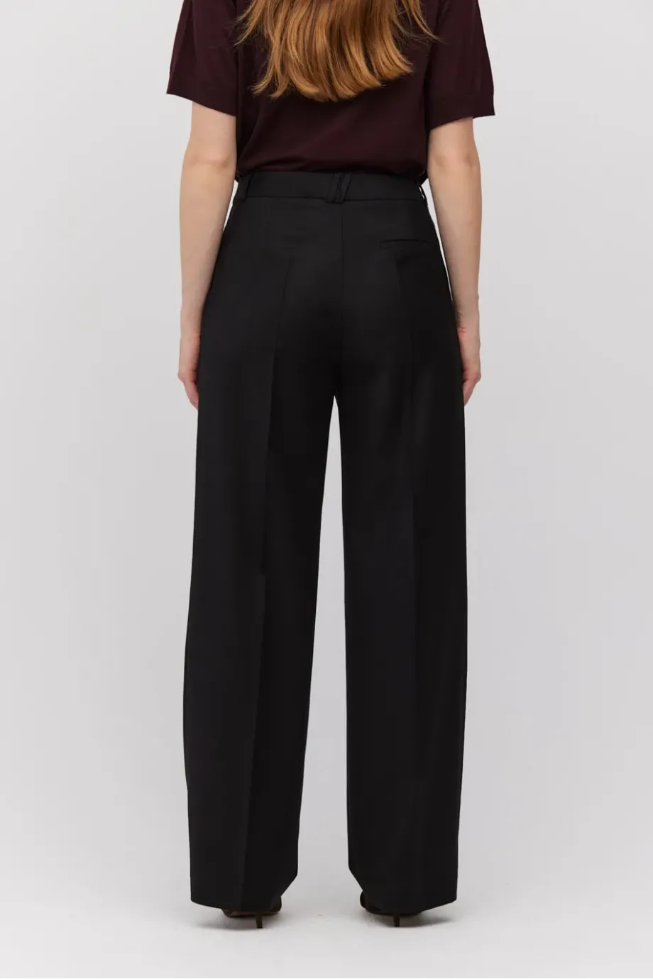 Vlněné kalhoty s záhyby. Široká nohavice, kapsy, poutka. Zapínání na skrytý zip, háček, vnitřní knoflík z korozového ořechu. Z vnitřní strany ozdobná paspulka. Barva černá.