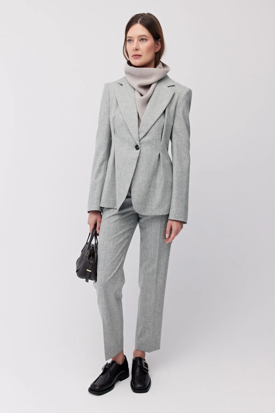 Kalturowé kalhoty s kašmírem. Lehce zúžený střih nohavic, se skrytým zipem na háček a corozo knoflíkem uvnitř. Uvnitř s dekorativním lemováním. Kapsy a poutka na pásek. Barva šedá. Pro doplnění soupravy sako ze stejného materiálu.