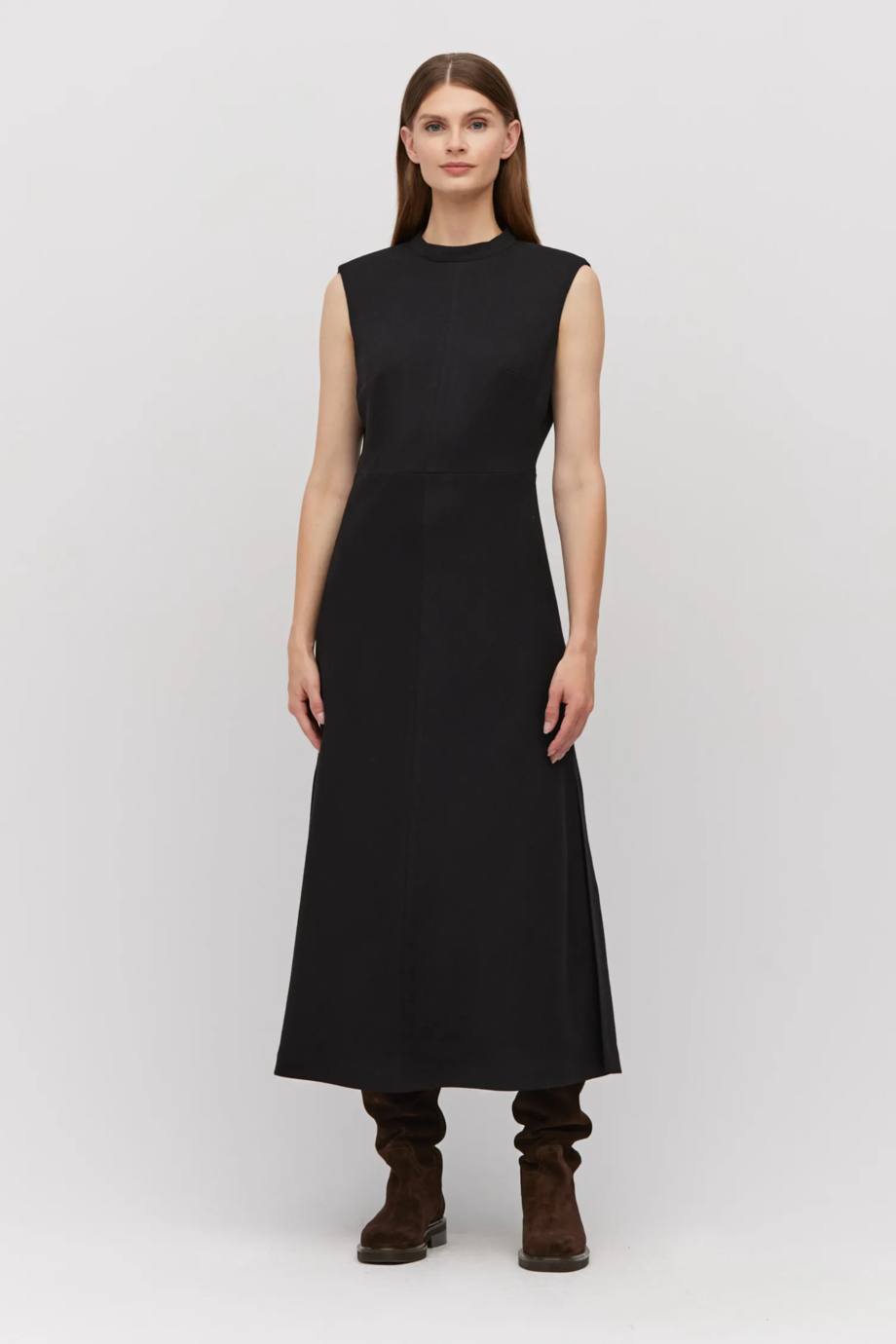 Šaty z ovčí vlny na podšívce, s trapézovým dole vykrojeným na šikmo a s rozparky po stranách. Ramena jemně vyztužená tenkou poduškou ukrytou mezi tkaninou a podšívkou. Barva černá. Délka midi.