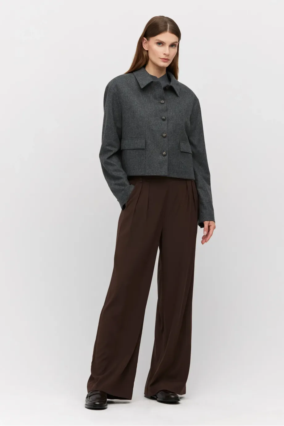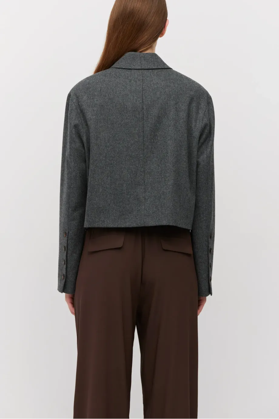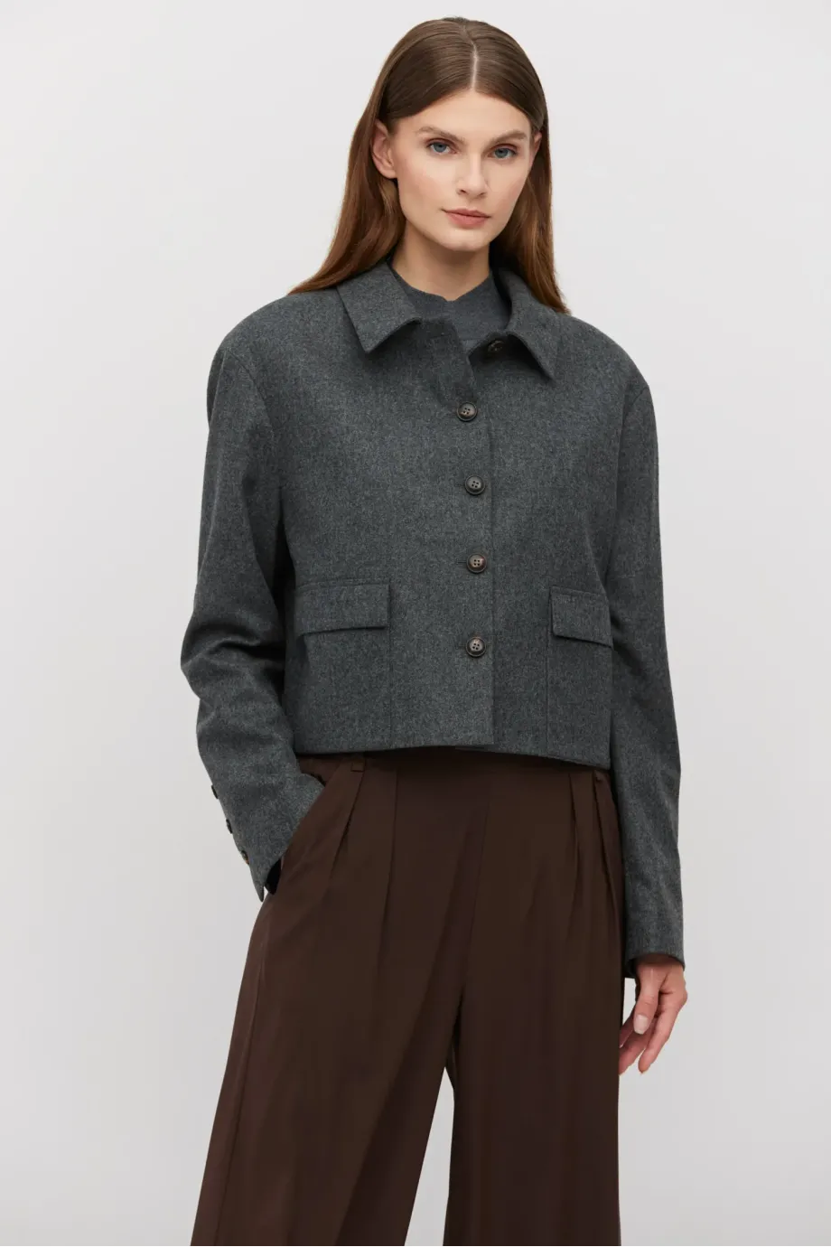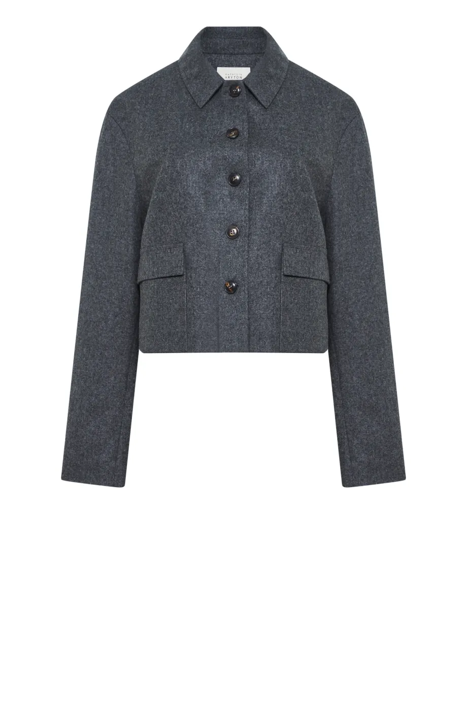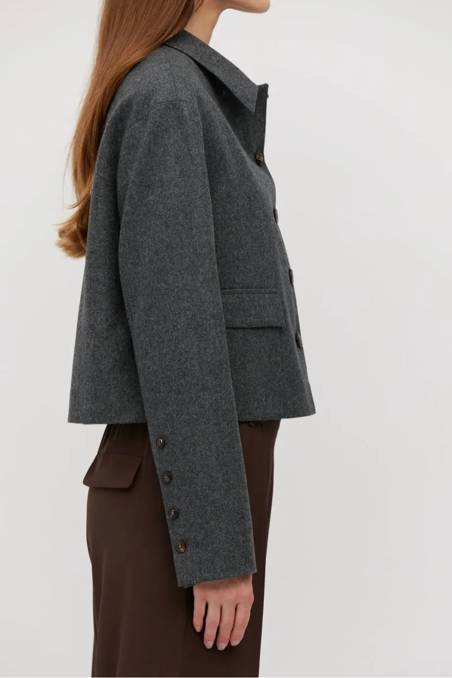 Šedý blejzr s příměsí kašmíru. Boxový střih. Zapínání na knoflíky. Celý podšitý, s ozdobným lemováním. Kapsy.