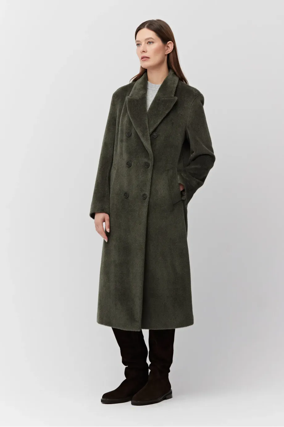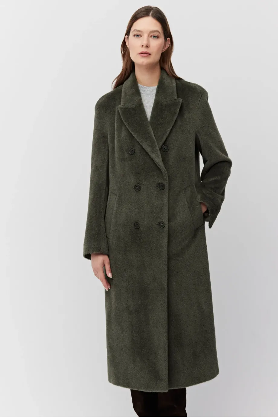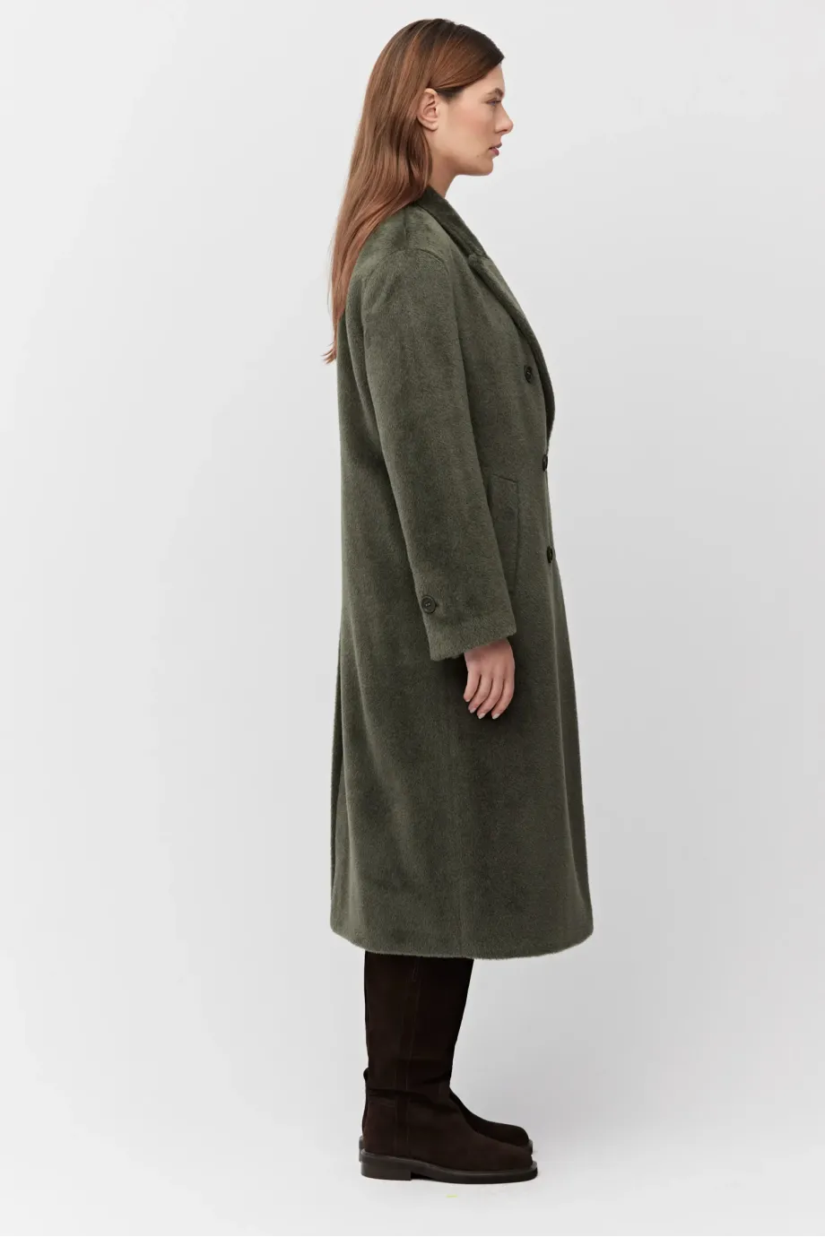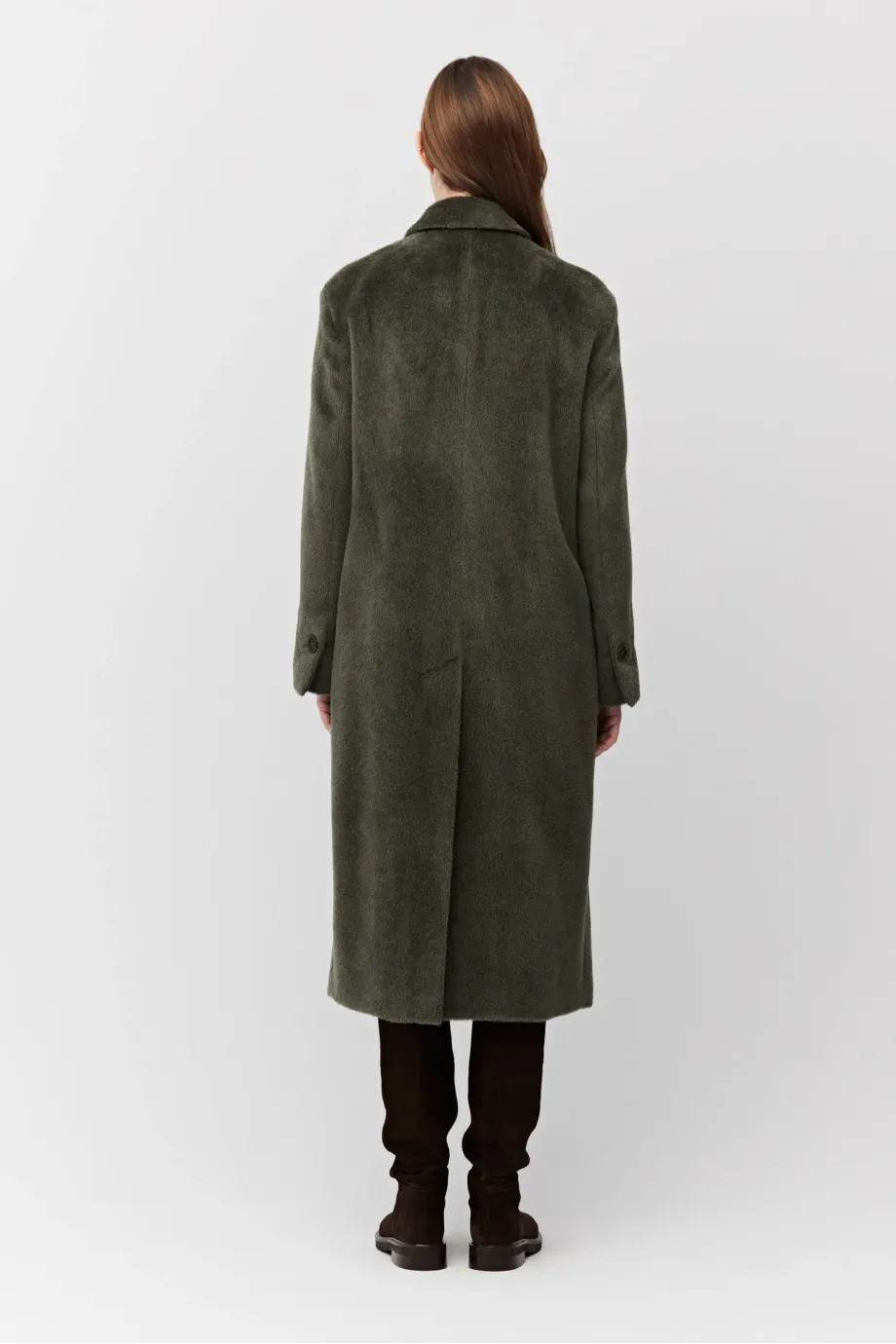 Kabát v odstínu vojenské zelené s baby suri alpaku. Volná, jednoduchá forma, dvouřadové zapínání na přírodní knoflíky. Rukáv kimono, vzadu rozparek. Model na podšívce zakončené ozdobným paspule. Délka midi.
