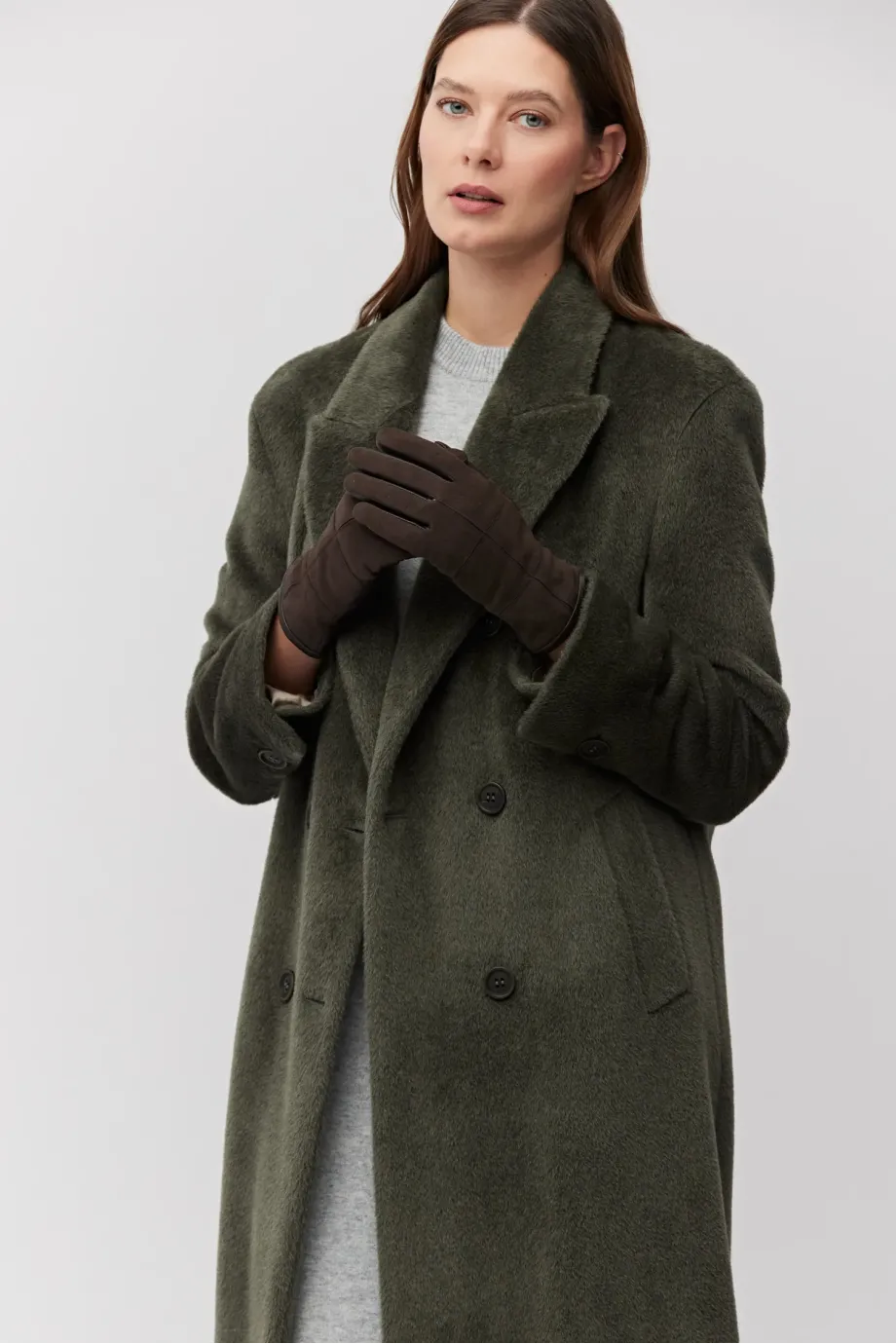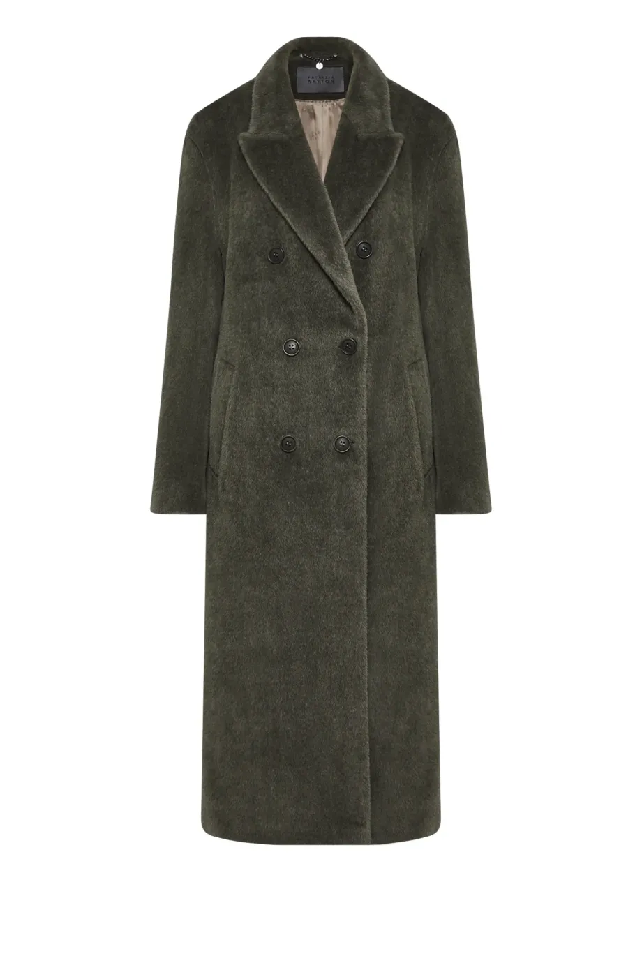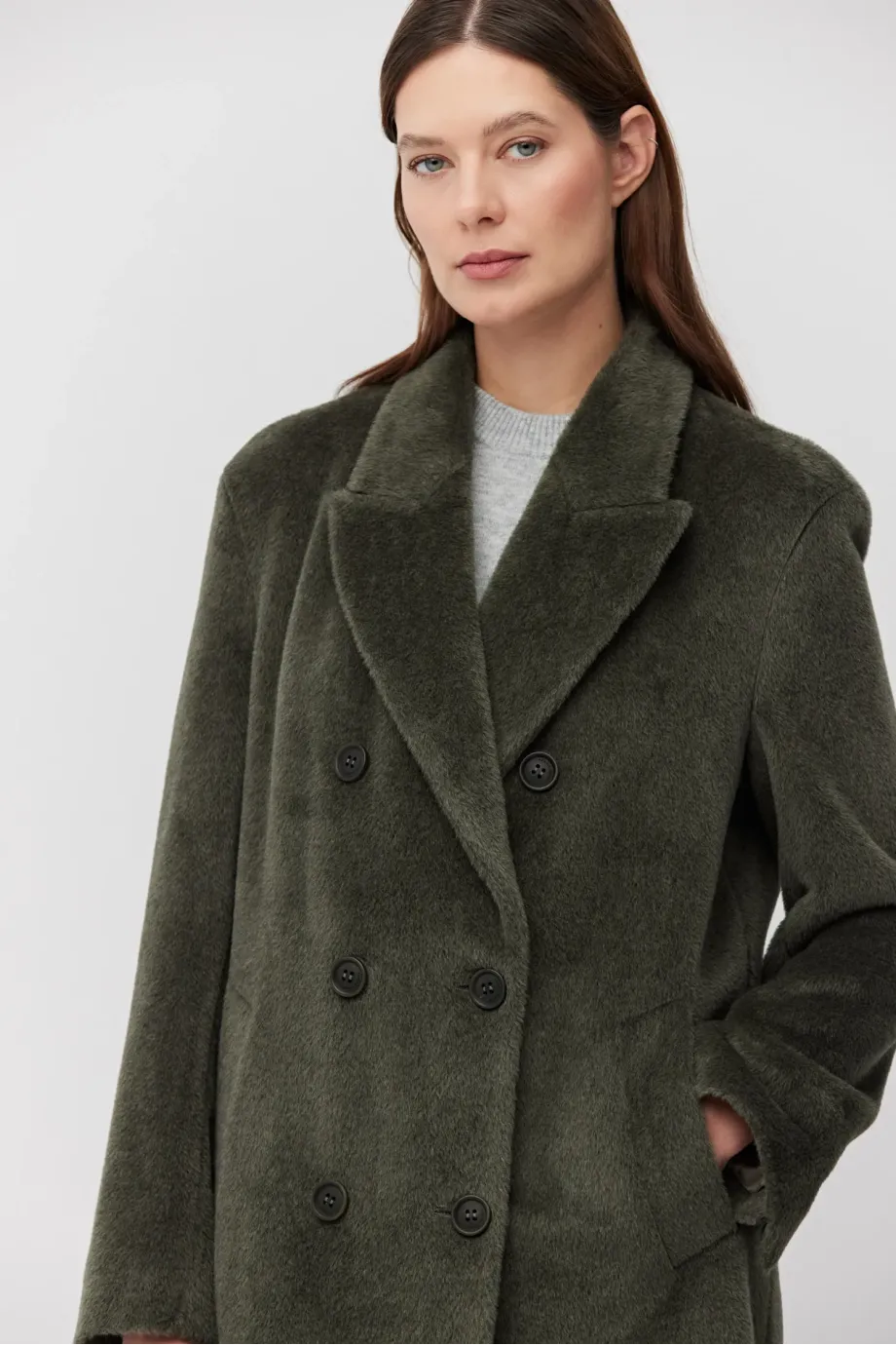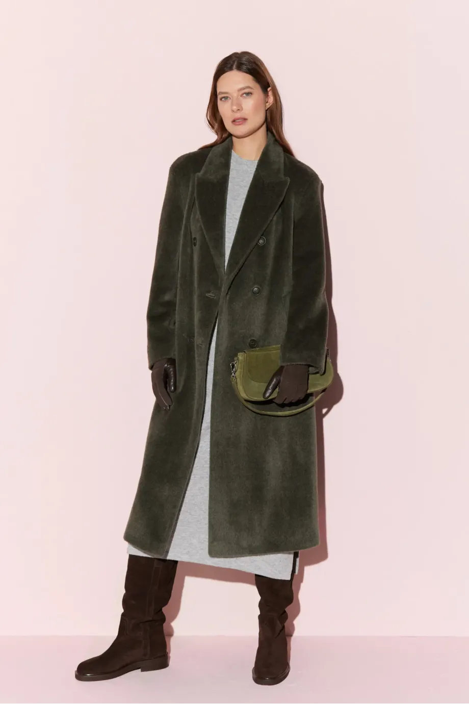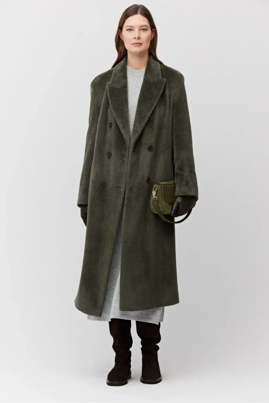 Kabát v odstínu vojenské zelené s baby suri alpaku. Volná, jednoduchá forma, dvouřadové zapínání na přírodní knoflíky. Rukáv kimono, vzadu rozparek. Model na podšívce zakončené ozdobným paspule. Délka midi.
