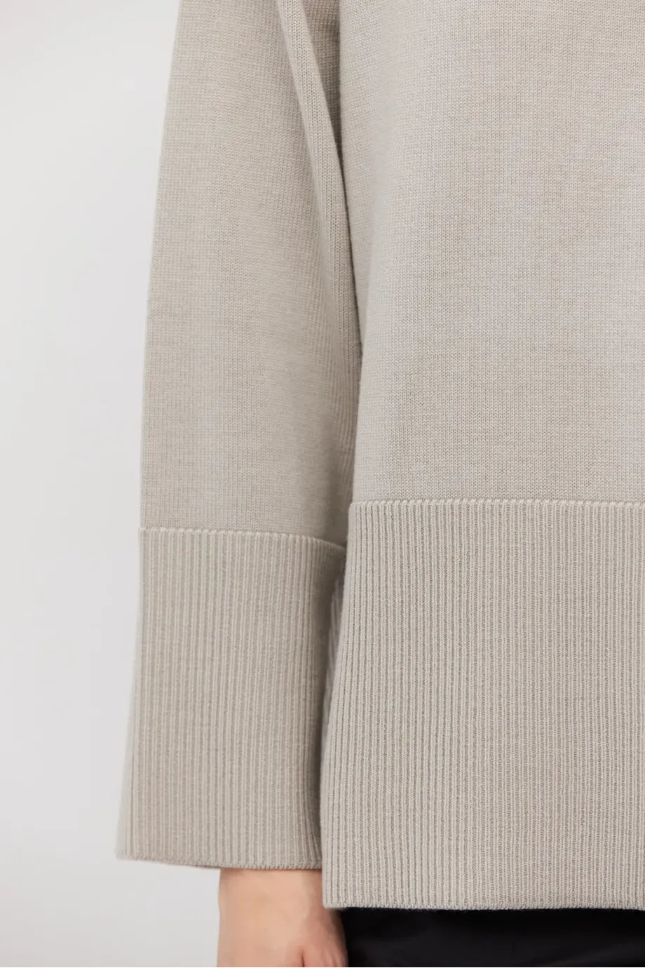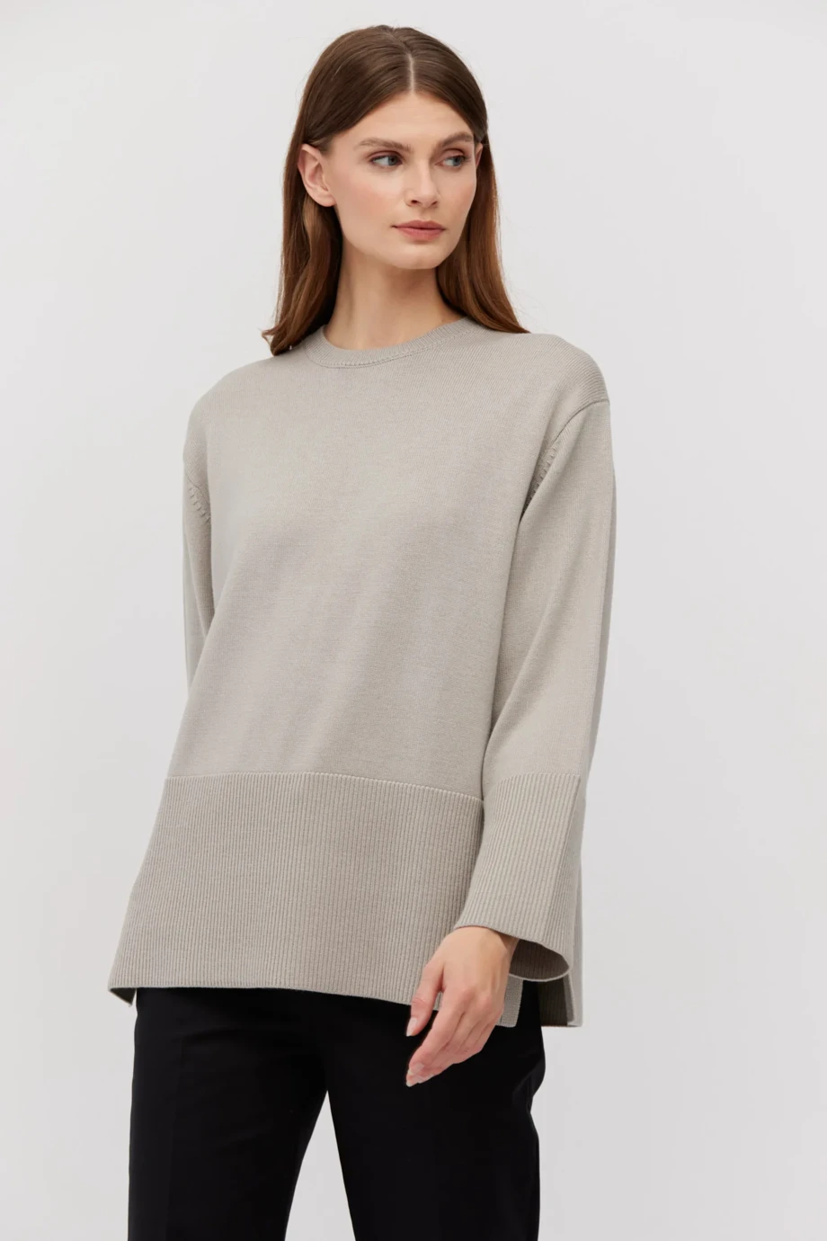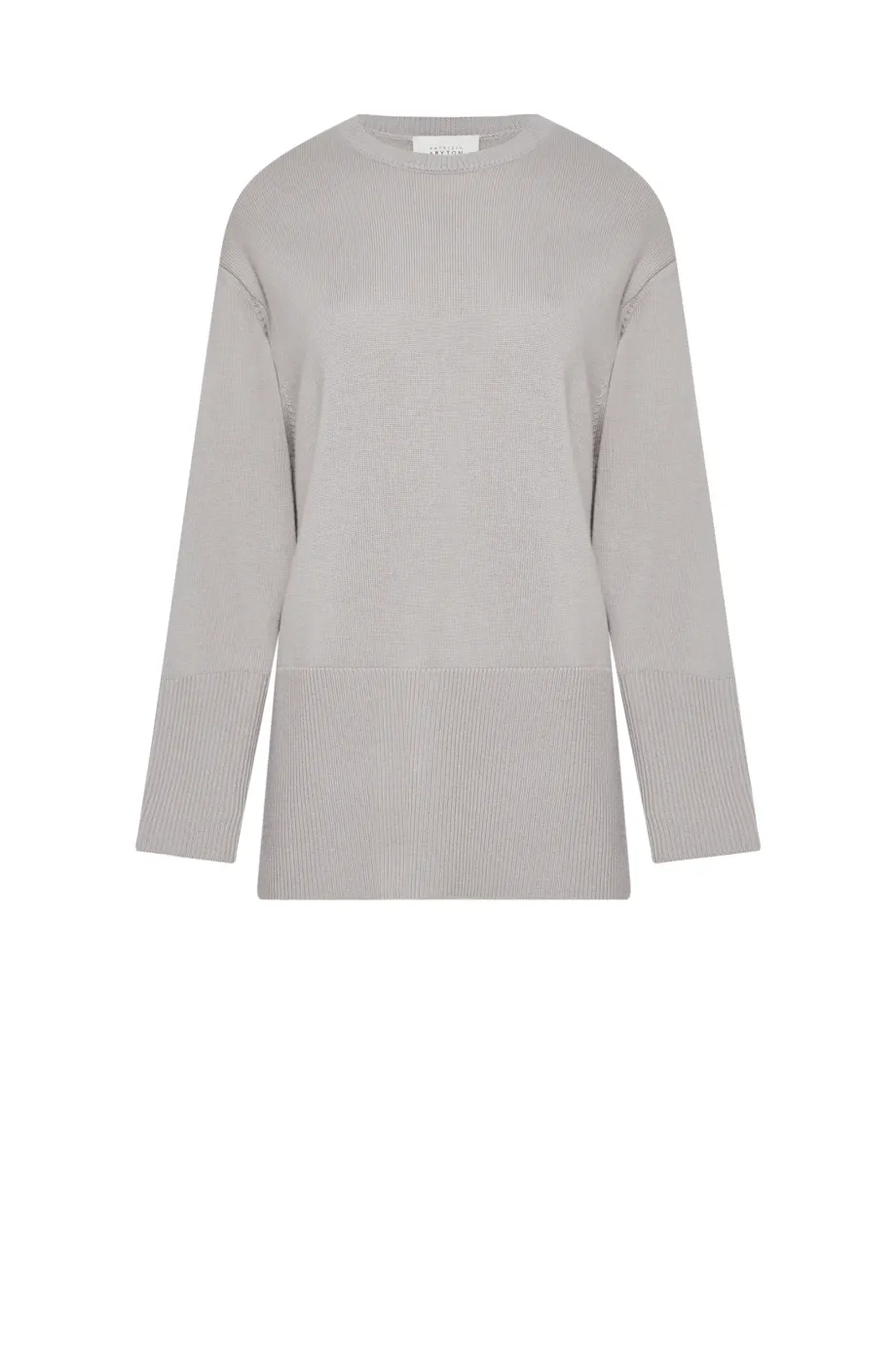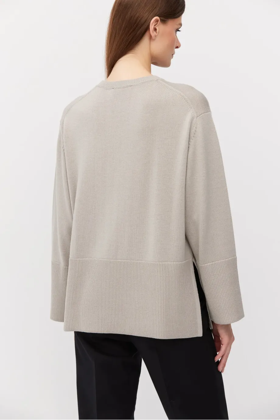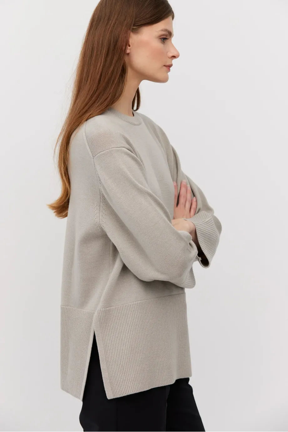 Béžový svetr volnějšího střihu z merino vlny. Dlouhý rukáv, kulatý výstřih, na bocích rozparky. Měkká pletenina se single jersey vazbou vyrobená na stroji s uiglením 9 GG.