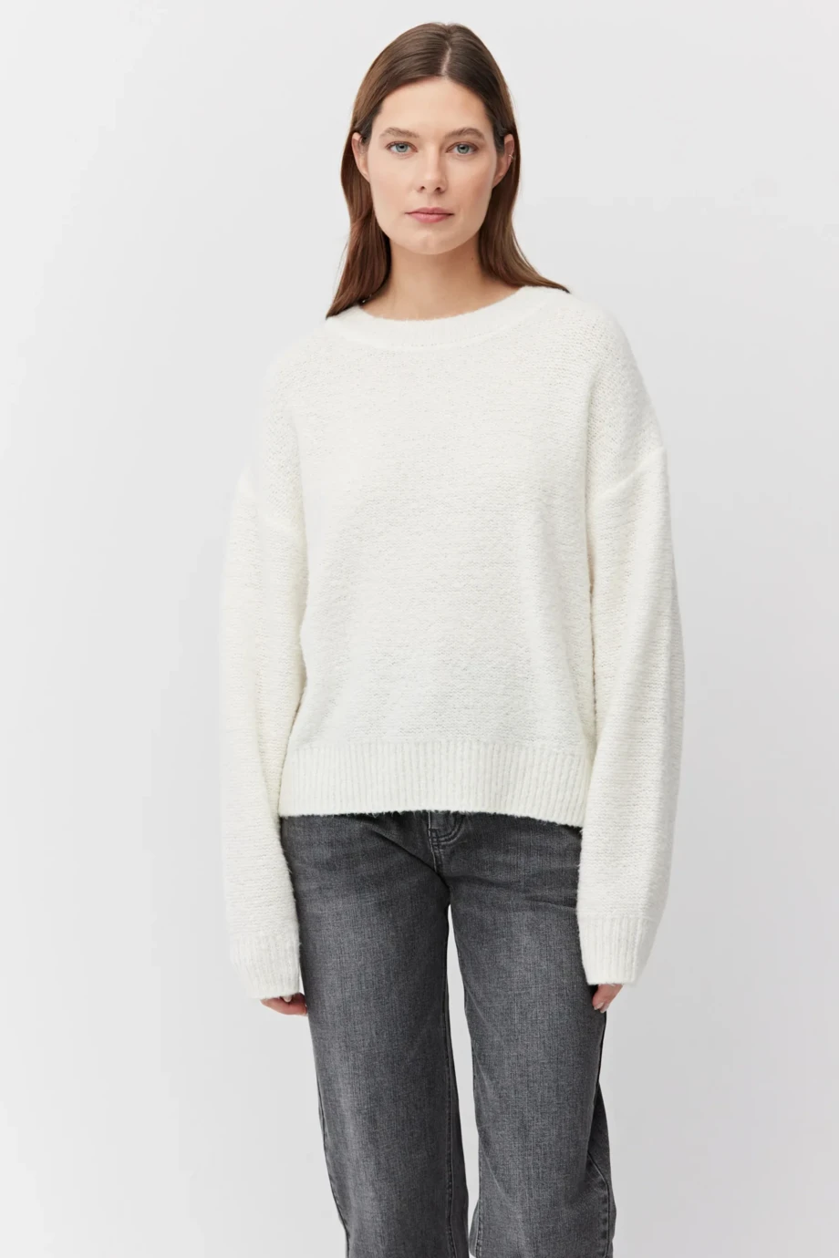Svetr z merinovlny. Kulatý výstřih, dlouhý rukáv. Měkká pletenina s volnou vazbou single jersey, vyrobená na stroji s úpletem 7 GG. Barva smetanová. Střih volný.