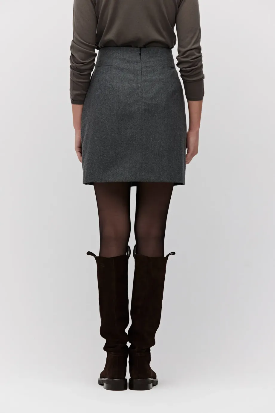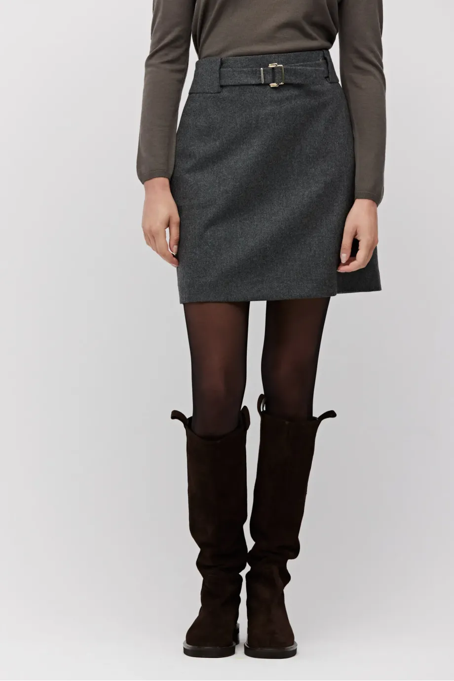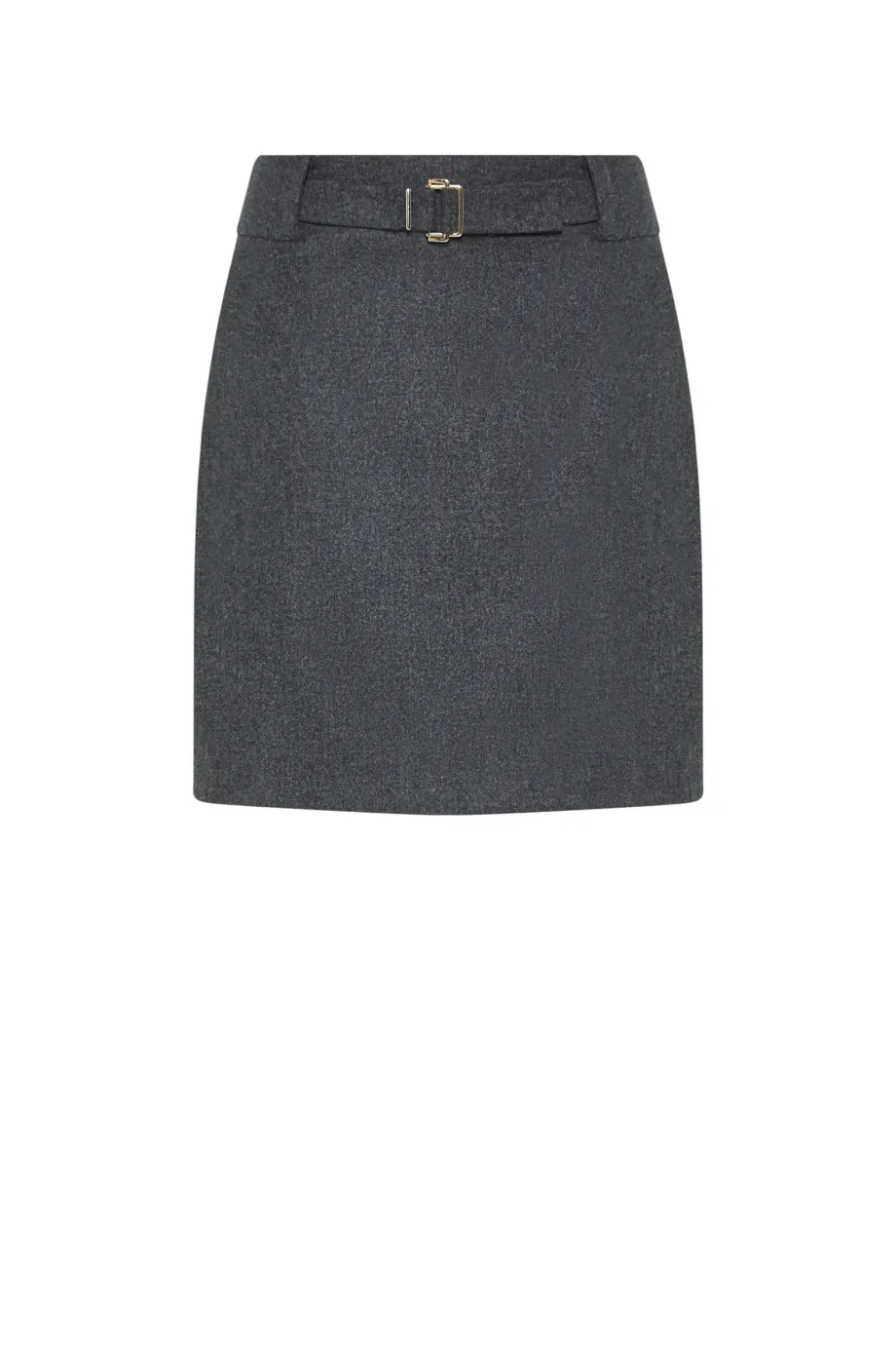 Tmavě šedá mini sukně na podšívce. Tkanina s příměsí kašmíru. V pase pásek. Zapínání na zip vzadu.