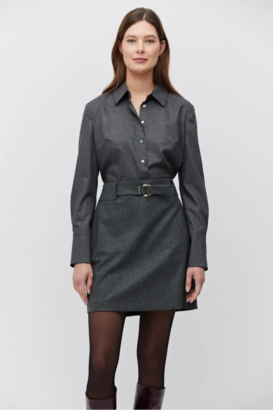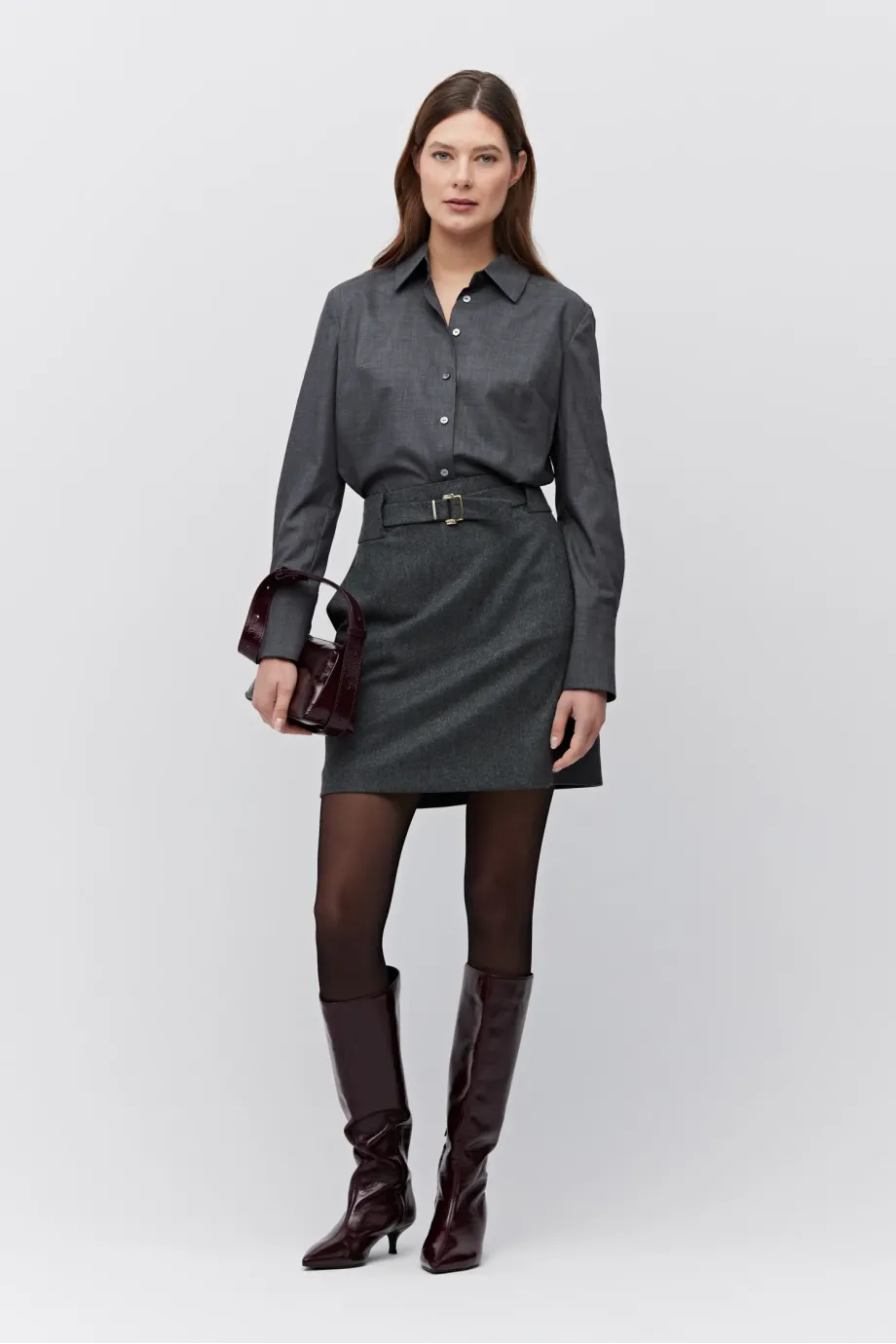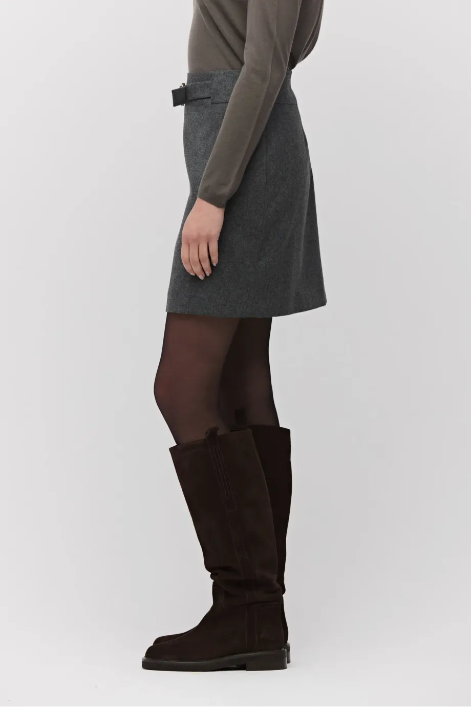Tmavě šedá mini sukně na podšívce. Tkanina s příměsí kašmíru. V pase pásek. Zapínání na zip vzadu.