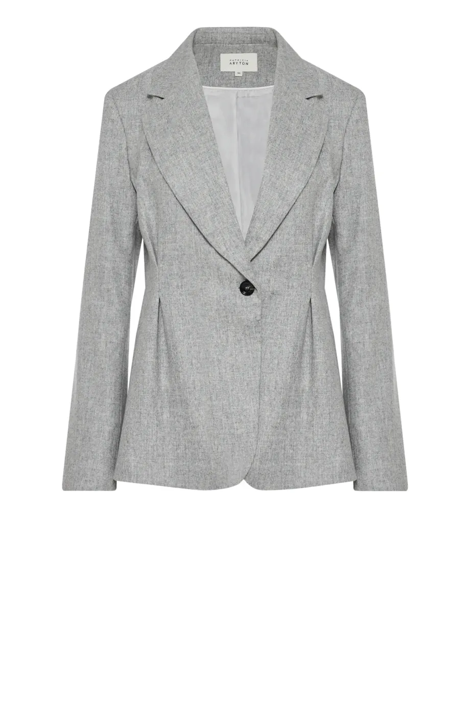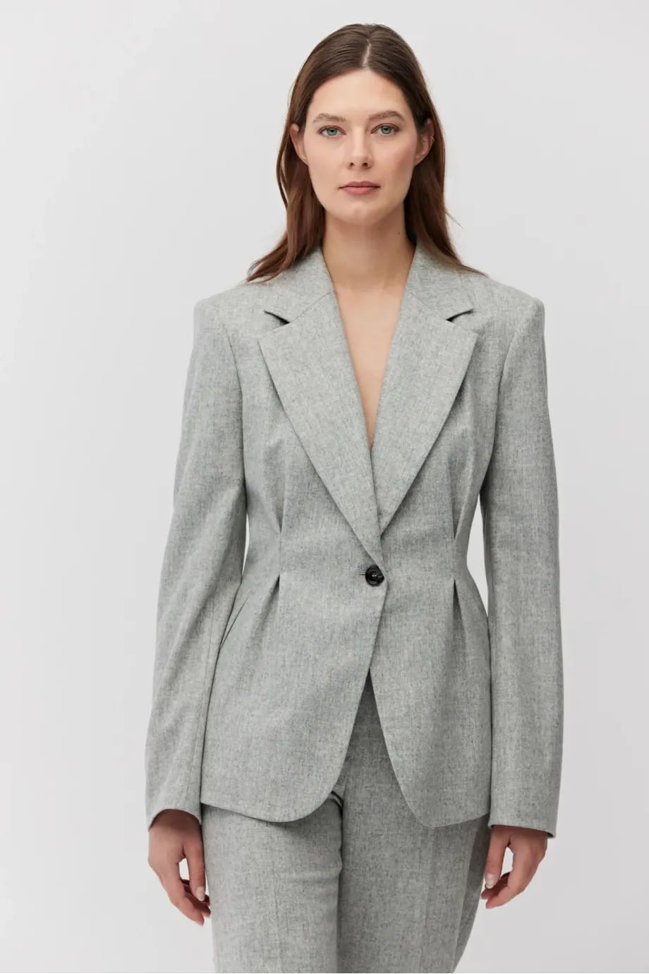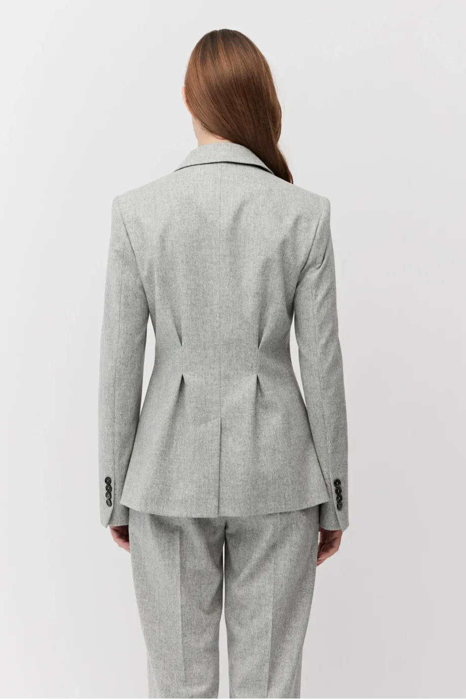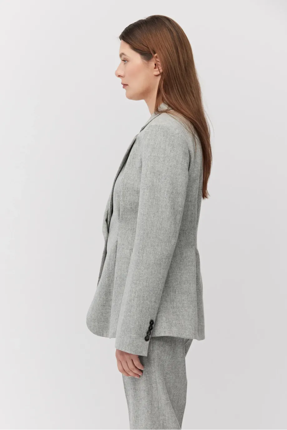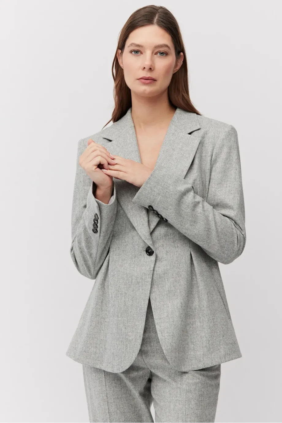 Sako k obleku z kašmírem. Jednoduché, přiléhavé, s výraznou linií ramen. Dlouhý rukáv. Model na podšívce, s ozdobným paspulováním. Šedá barva. K sadě kalhoty ze stejné tkaniny.