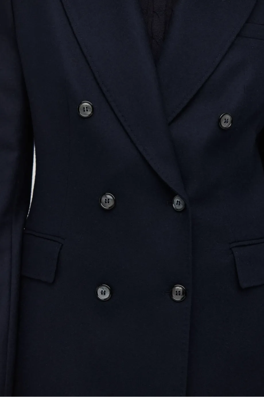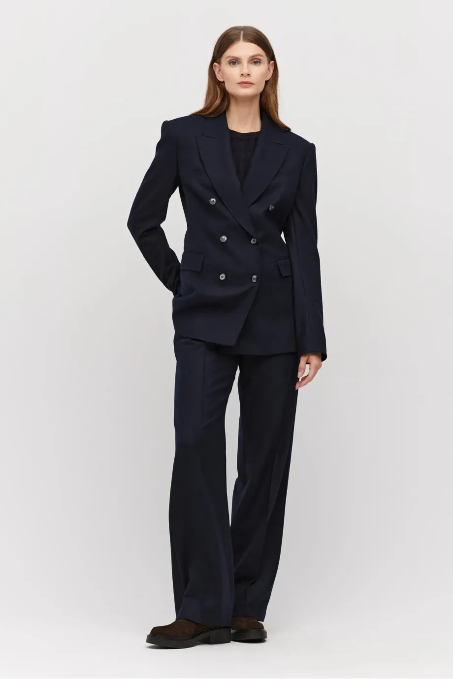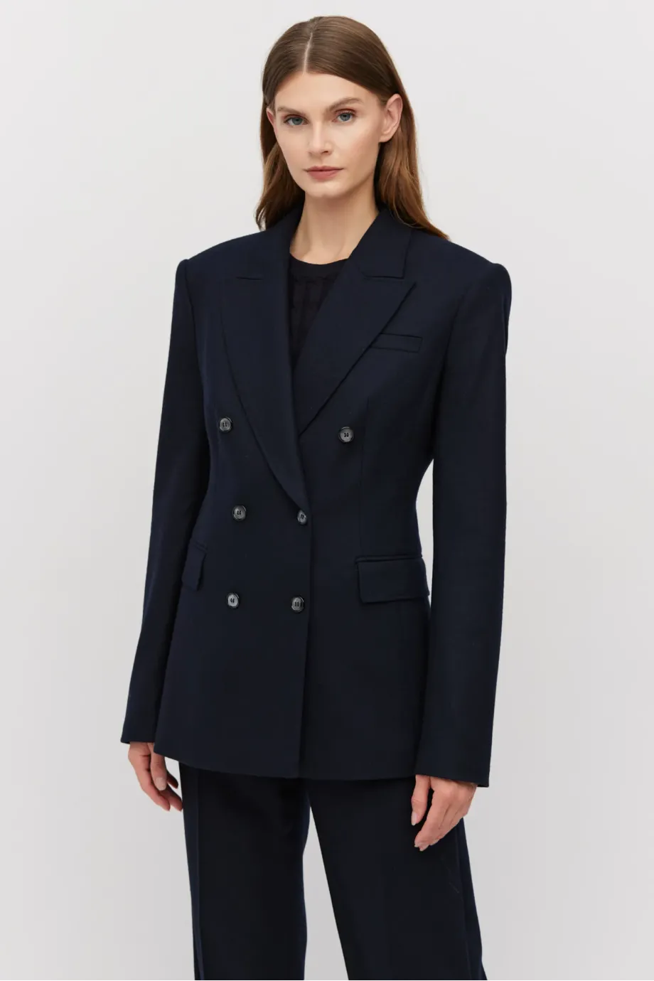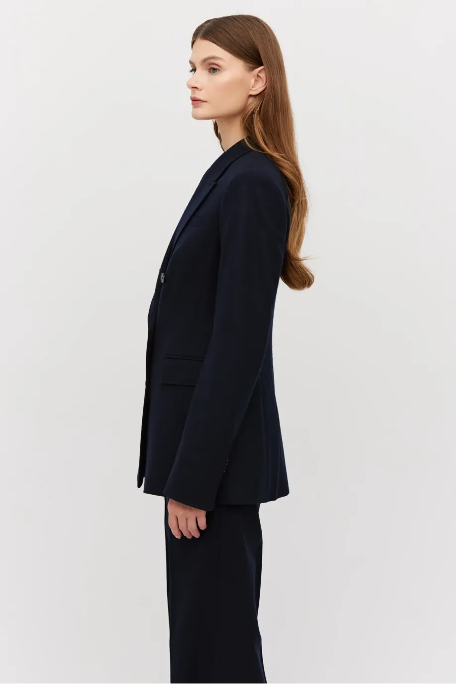 Sakó k obleku s kašmírem. Dvoubarevné, přiléhavé, se zvýrazněnými rameny. Dlouhý rukáv, kapsy. Model na podšívce, s ozdobným páskem. Barva tmavě modrá. K sadě kalhoty ze stejné tkaniny.