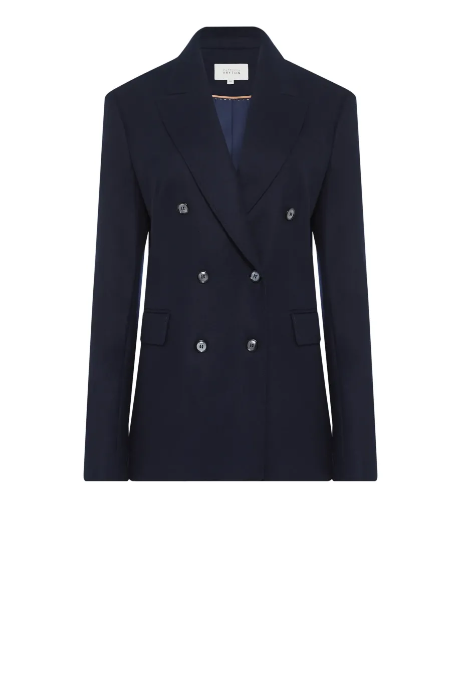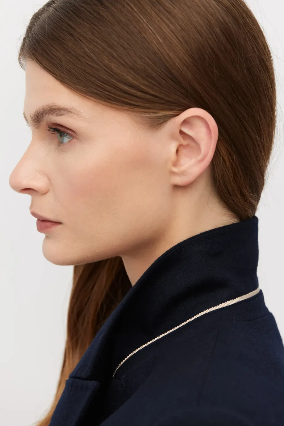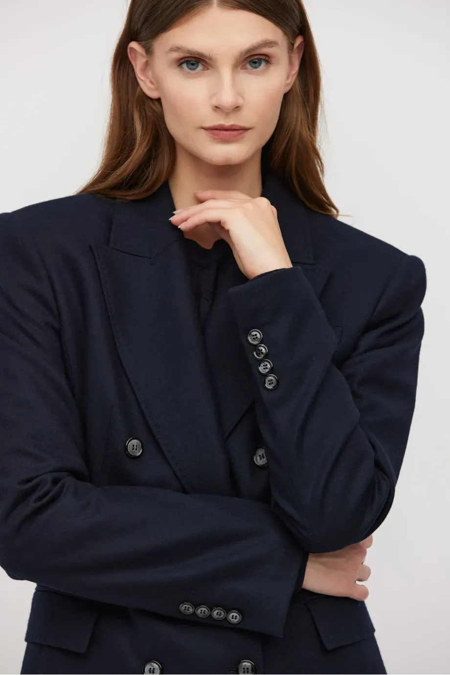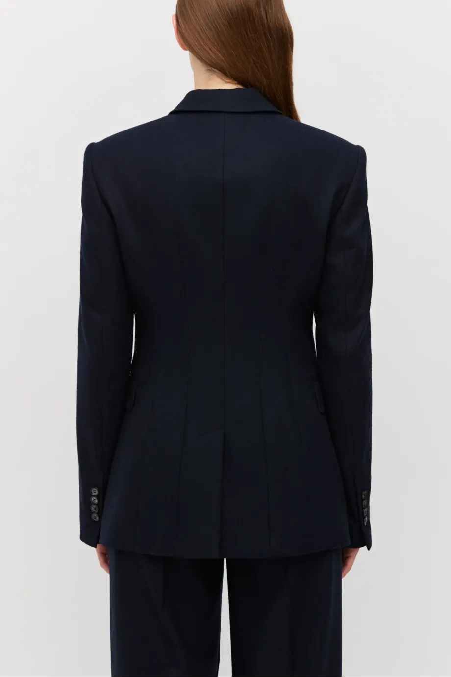 Sakó k obleku s kašmírem. Dvoubarevné, přiléhavé, se zvýrazněnými rameny. Dlouhý rukáv, kapsy. Model na podšívce, s ozdobným páskem. Barva tmavě modrá. K sadě kalhoty ze stejné tkaniny.