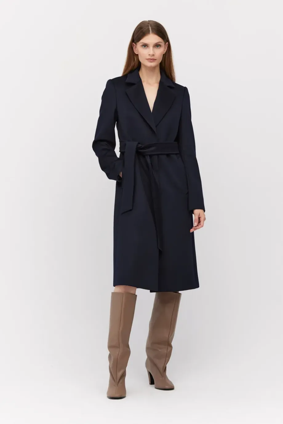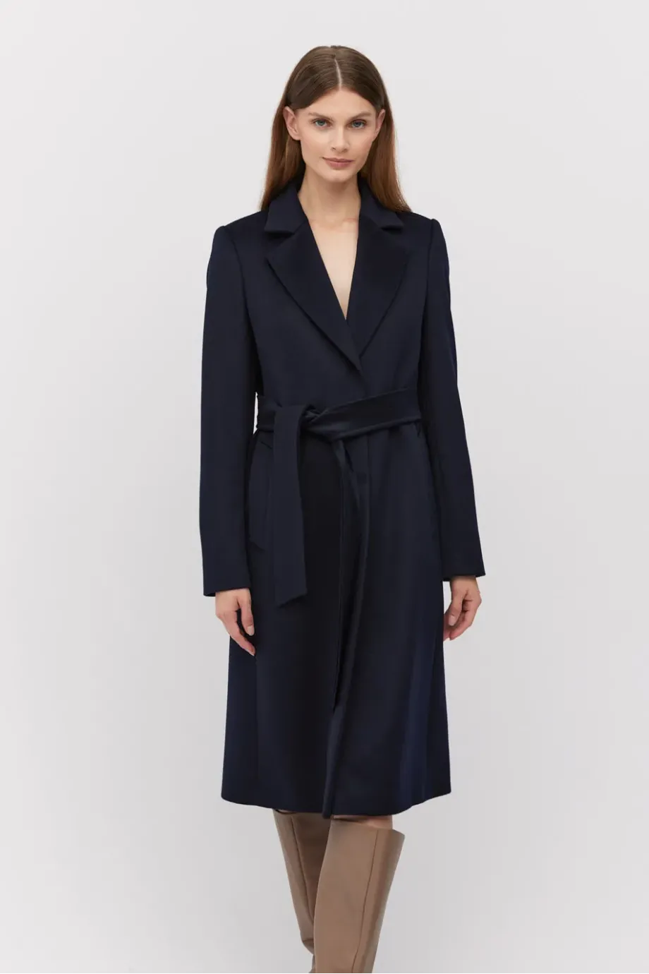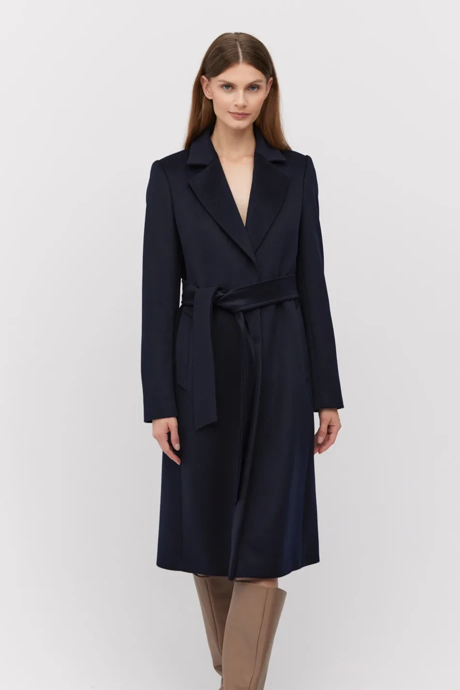 Tmavě modrý kabát s páskem. Střih blíže tělu, na podšívce s ozdobným lemem. Vsazený rukáv, kapsy.