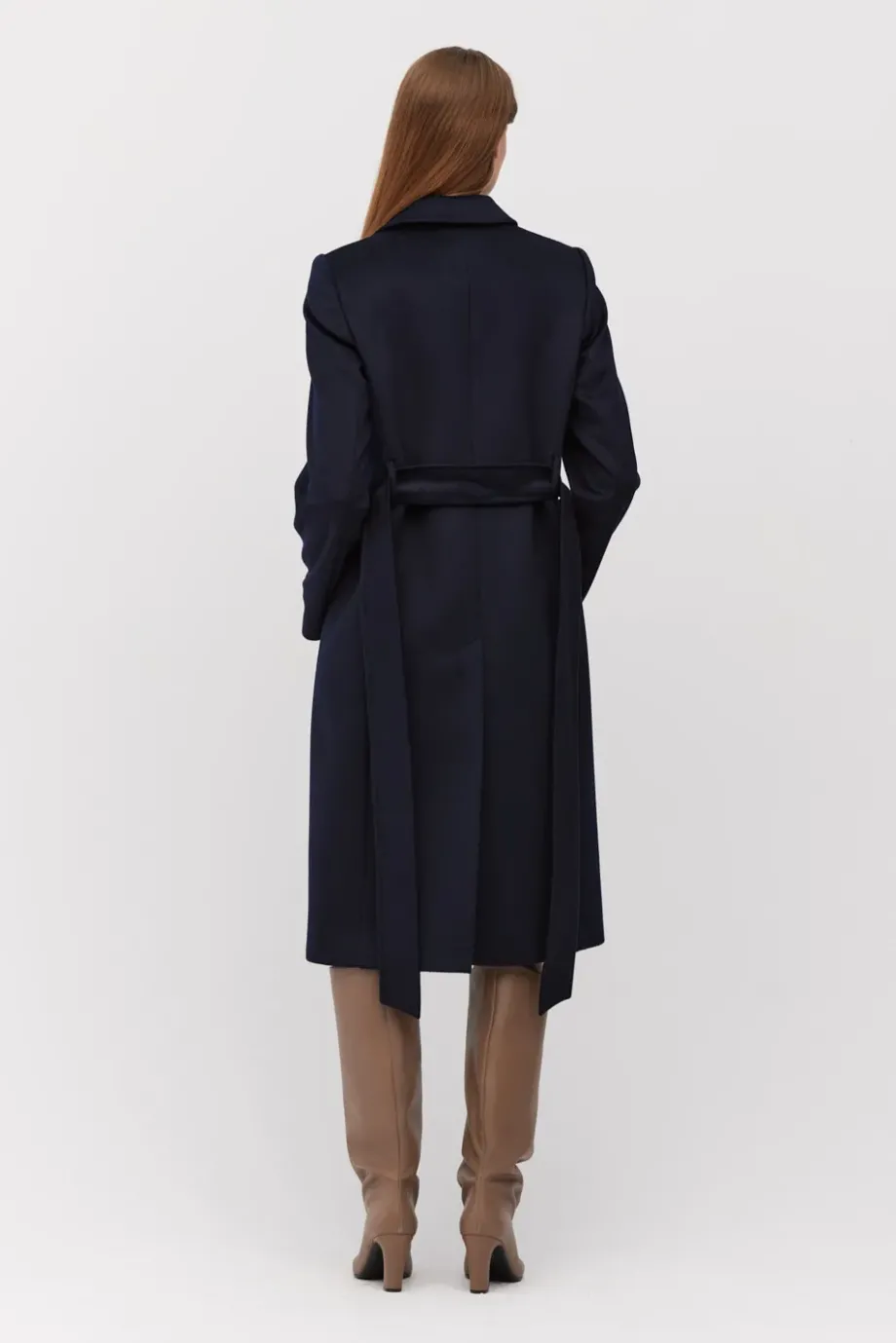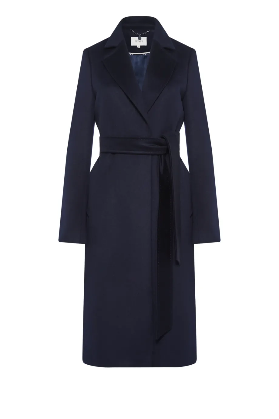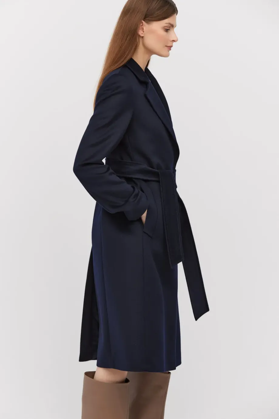 Tmavě modrý kabát s páskem. Střih blíže tělu, na podšívce s ozdobným lemem. Vsazený rukáv, kapsy.