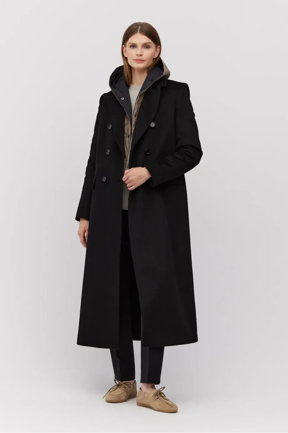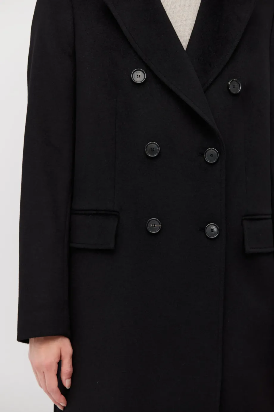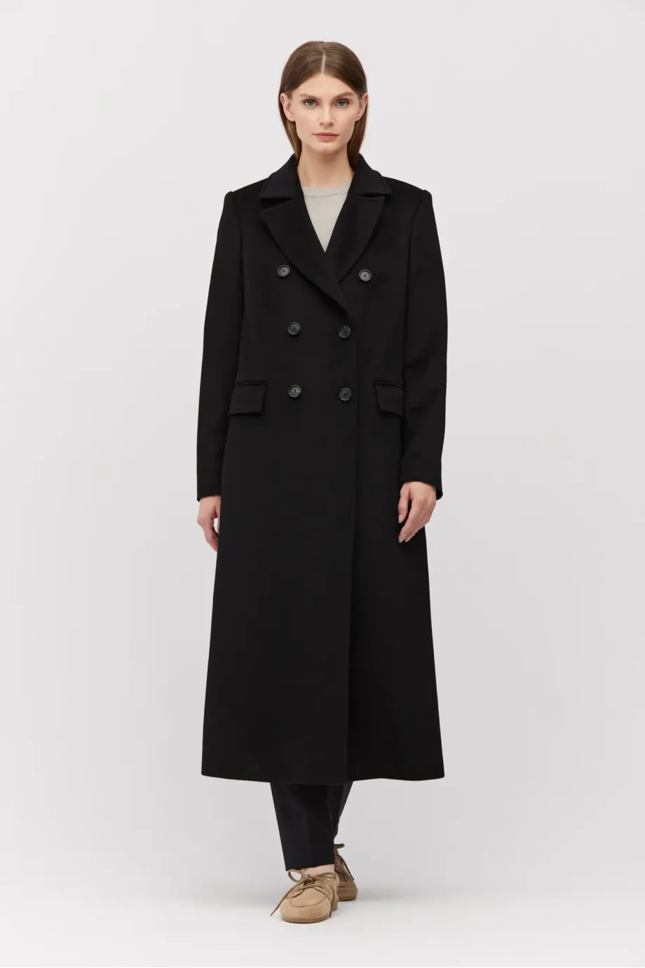 Černý dvouřadý kabát s příměsí hedvábí a kašmíru. Na podšívce, s ozdobným prošíváním. Klasický límec a rozparek vzadu. Dvouřadé zapínání s knoflíky z přírodního rohu na vnějším a přírodního ořechu na vnitřním. Kapsy.