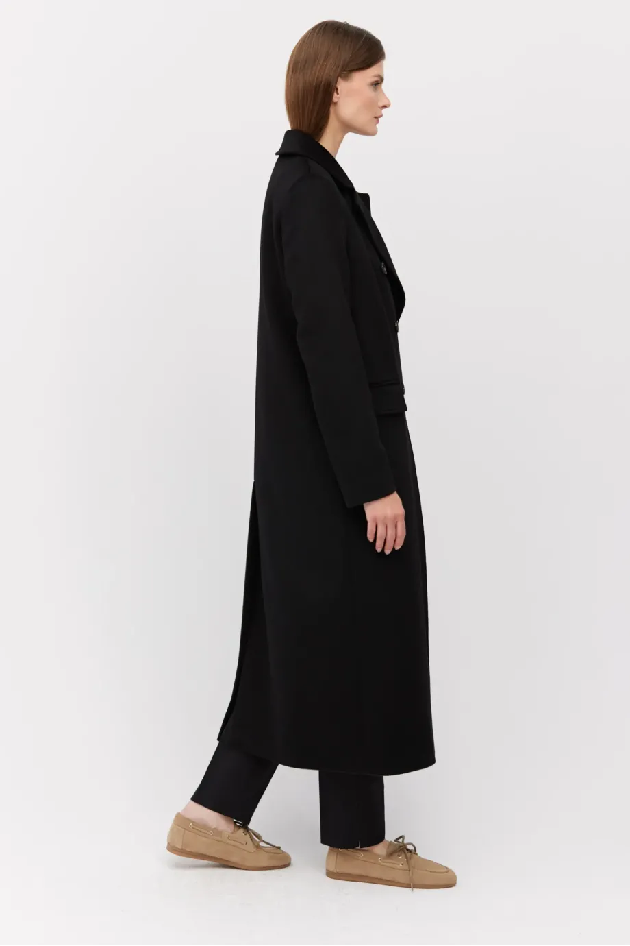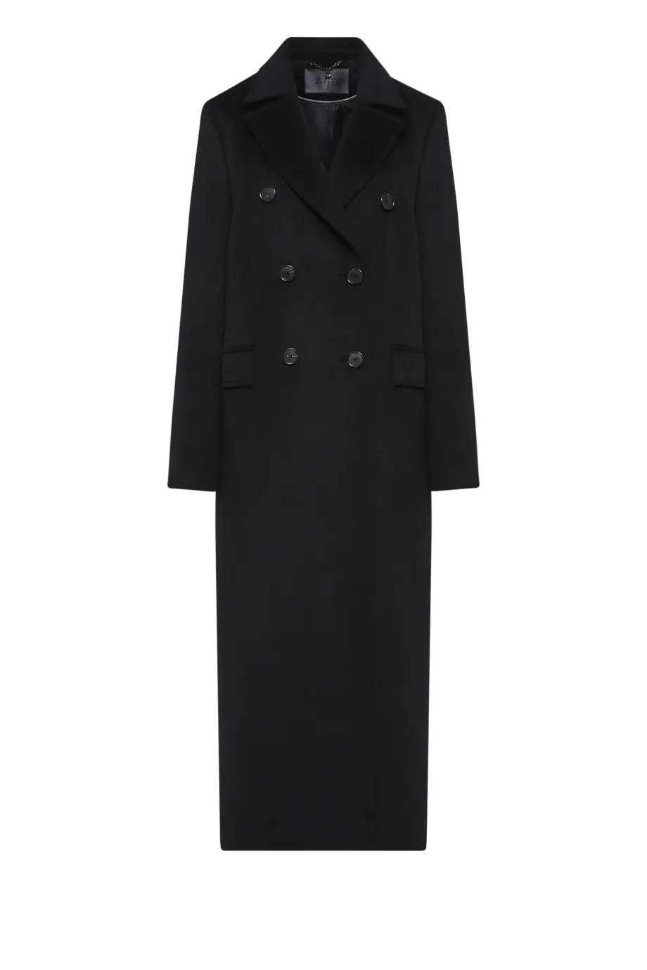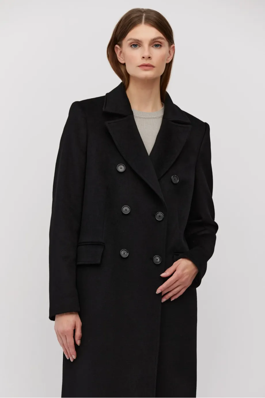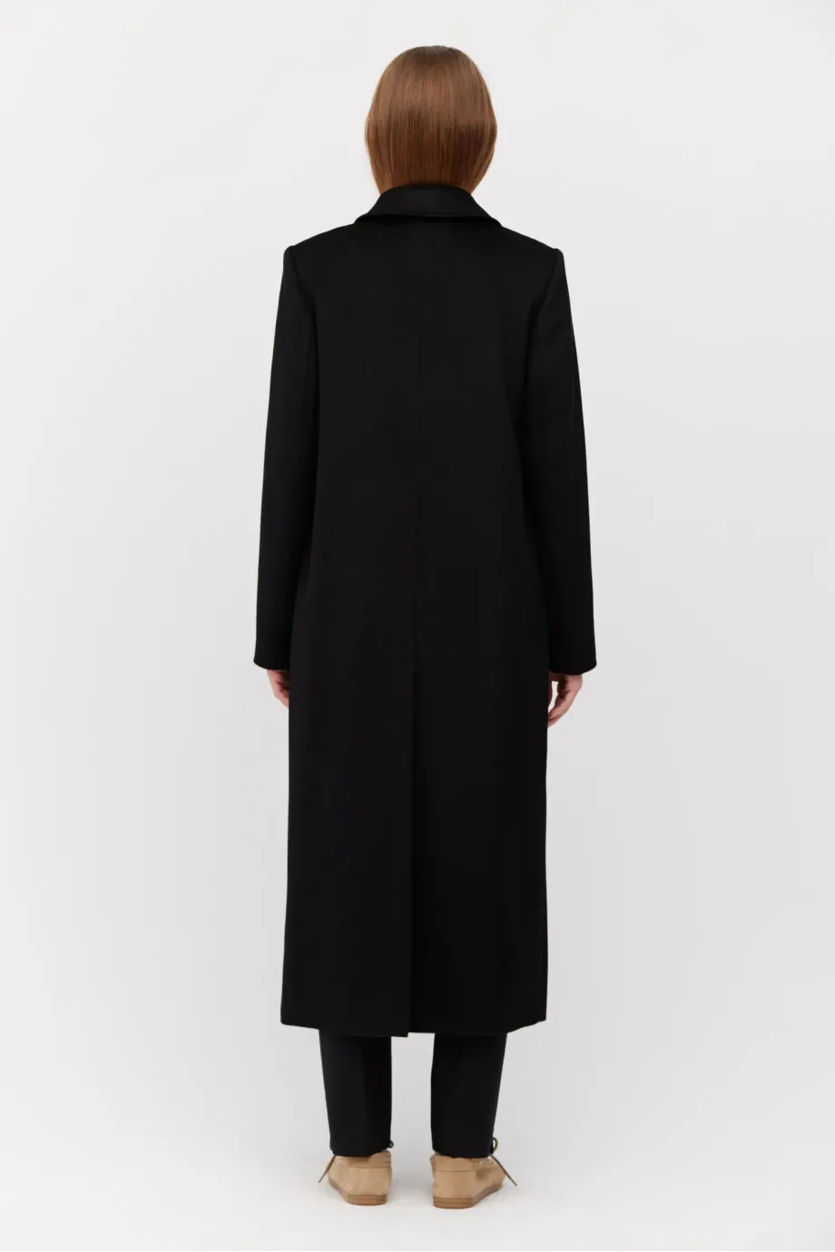Černý dvouřadý kabát s příměsí hedvábí a kašmíru. Na podšívce, s ozdobným prošíváním. Klasický límec a rozparek vzadu. Dvouřadé zapínání s knoflíky z přírodního rohu na vnějším a přírodního ořechu na vnitřním. Kapsy.