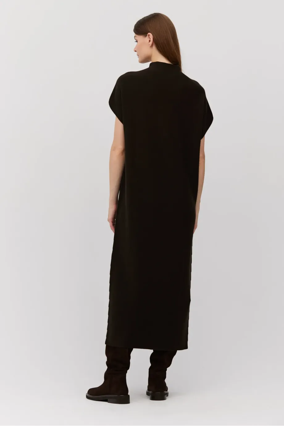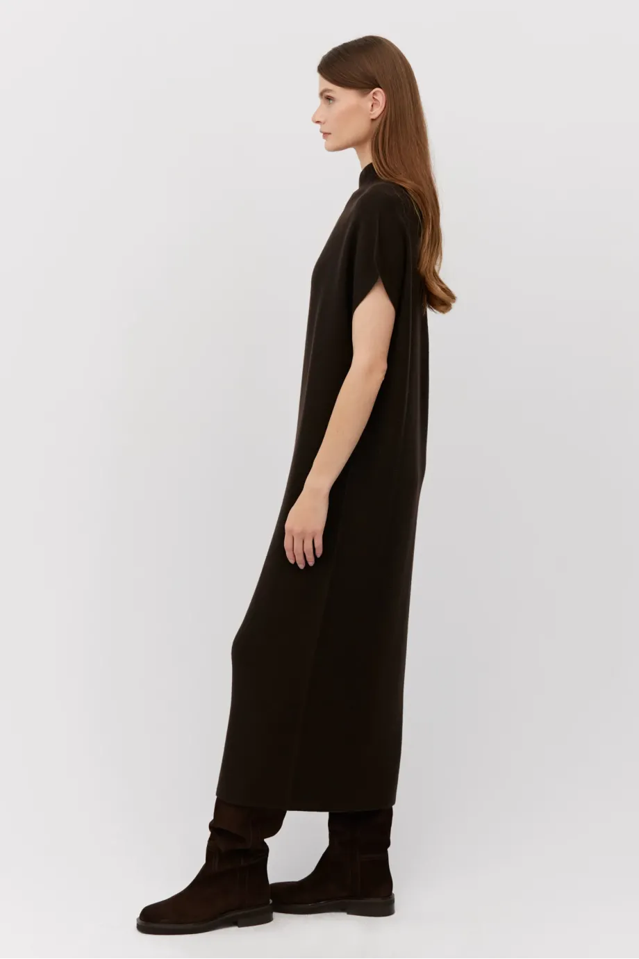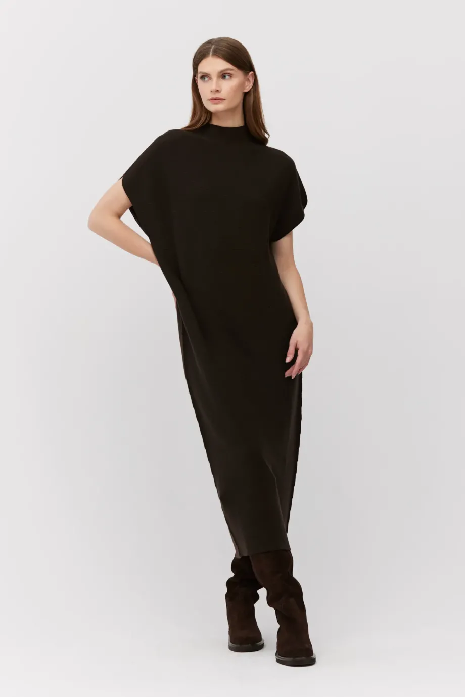 Midi šaty v barvě tmavě hnědé, s jednoduchým, volným střihem, krátkým, klesajícím rukávem a jemným límečkem. Vyrobeno z vlny, prošívané linkovým stehem na stroji s hustotou 15 GG. Minimalistické.