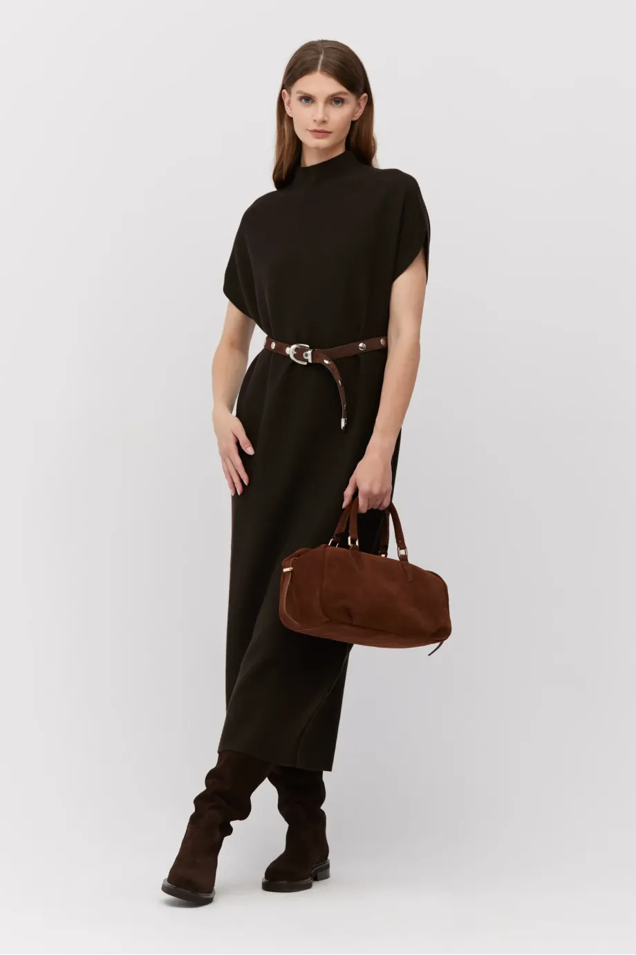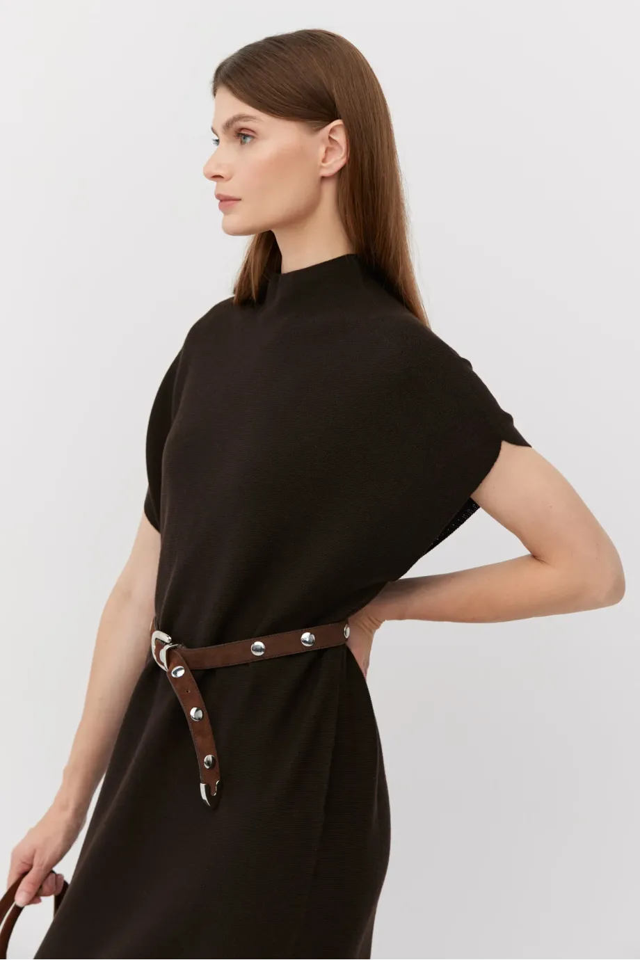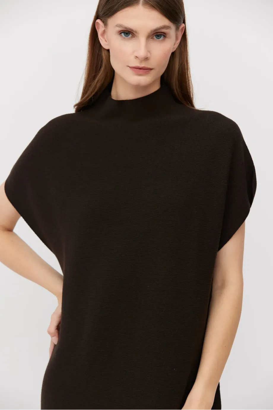 Midi šaty v barvě tmavě hnědé, s jednoduchým, volným střihem, krátkým, klesajícím rukávem a jemným límečkem. Vyrobeno z vlny, prošívané linkovým stehem na stroji s hustotou 15 GG. Minimalistické.