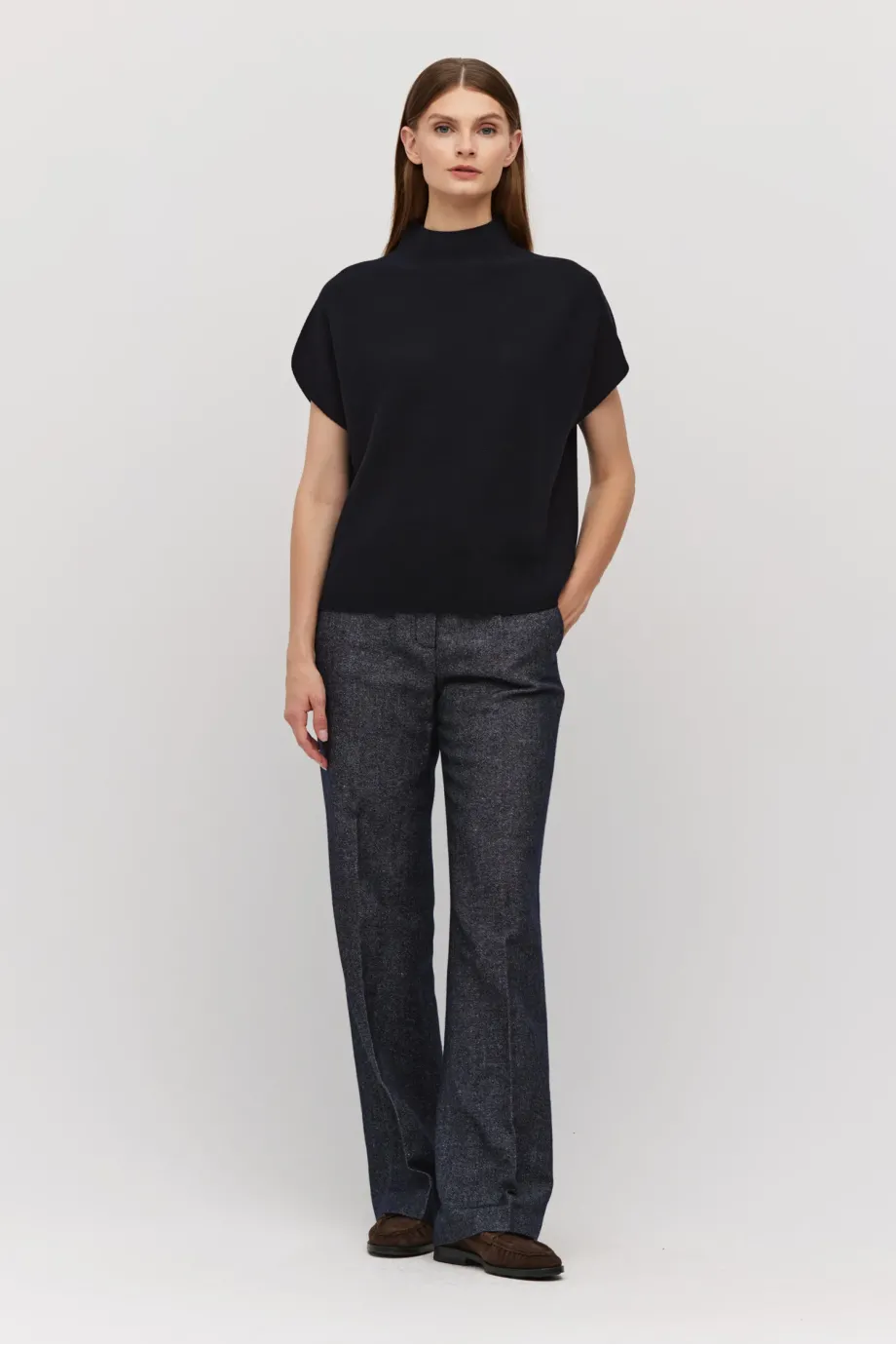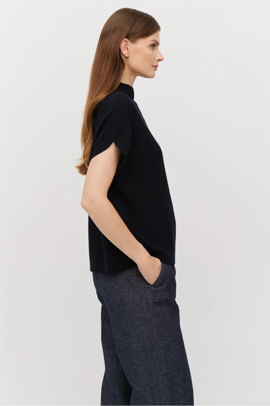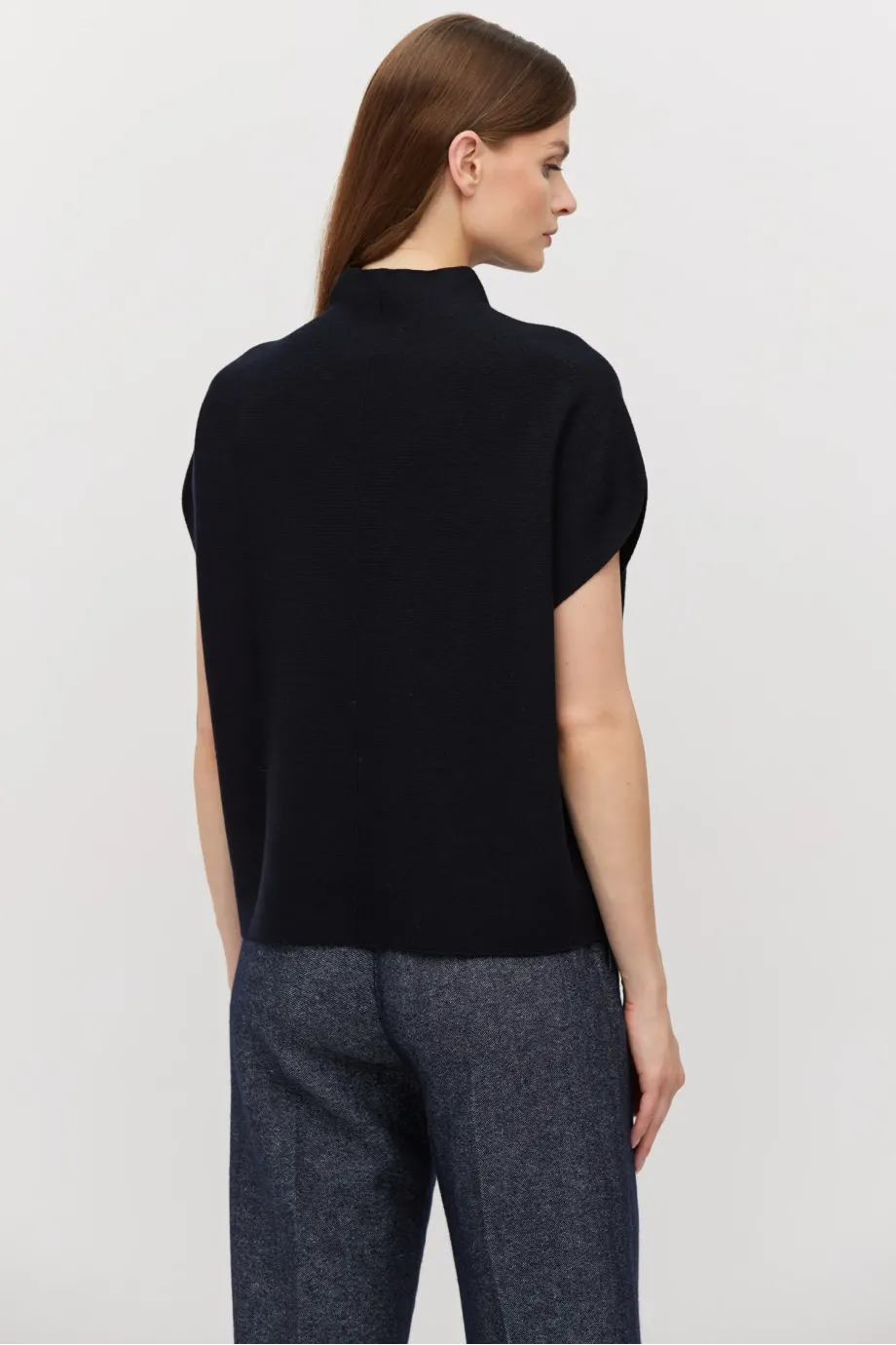 Volná vlněná blůza jednoduchého střihu. Lehce klesající rukáv. Masivní pletenina s linkovým vzorem, připravená na stroji s 15 GG. Barva tmavě modrá.
