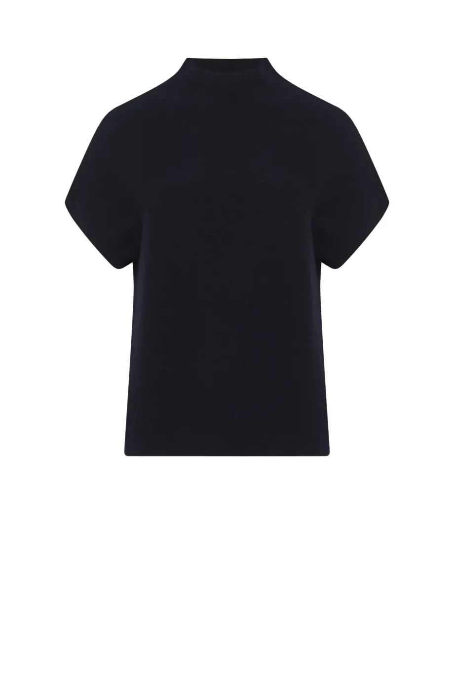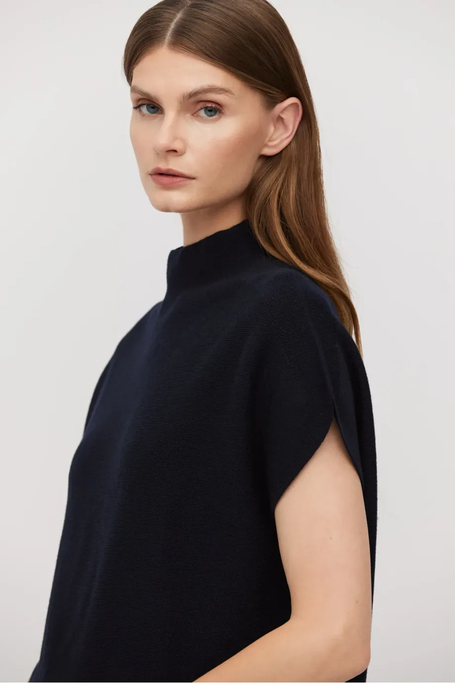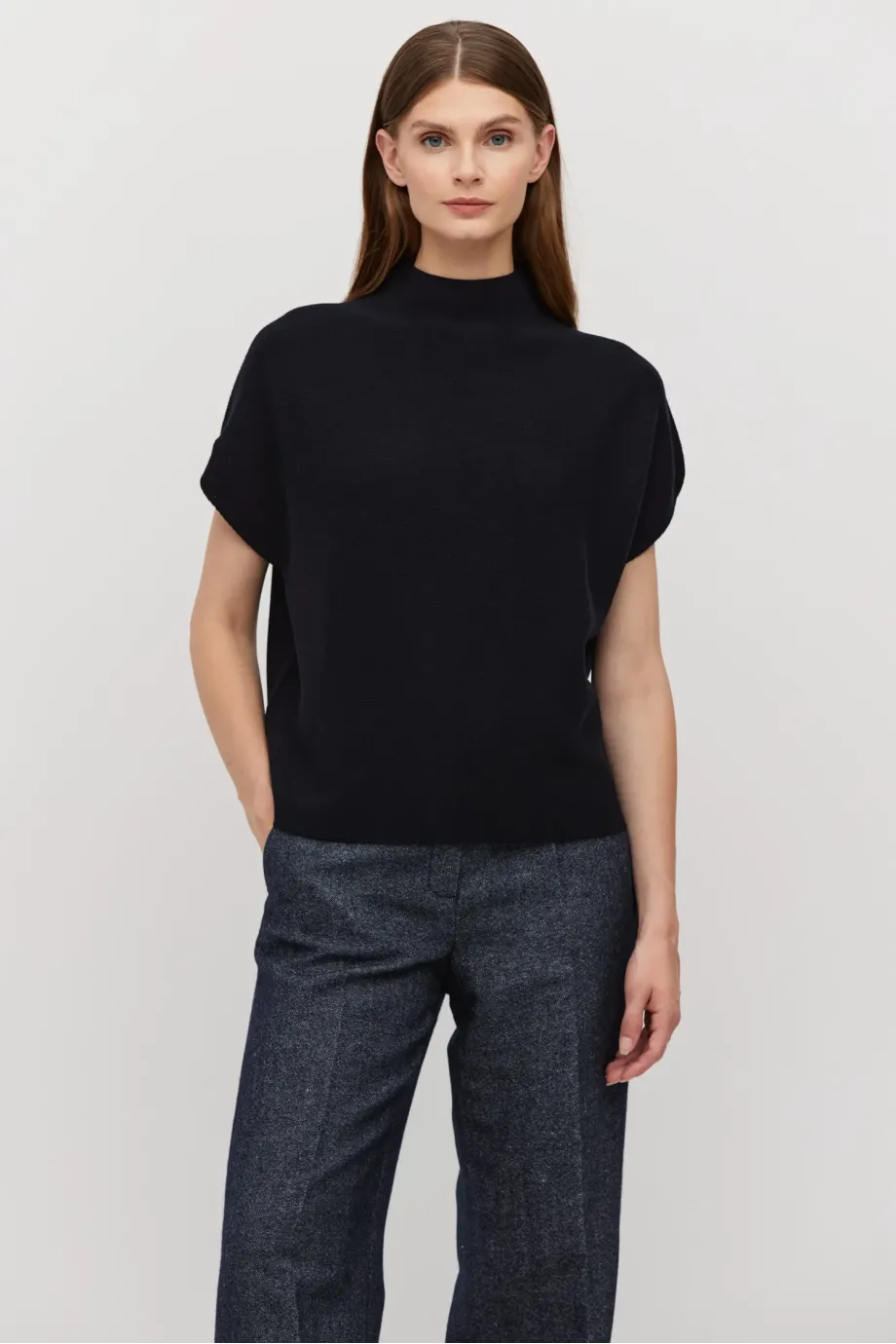 Volná vlněná blůza jednoduchého střihu. Lehce klesající rukáv. Masivní pletenina s linkovým vzorem, připravená na stroji s 15 GG. Barva tmavě modrá.