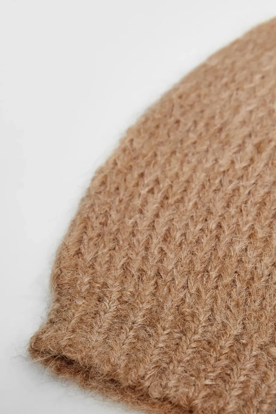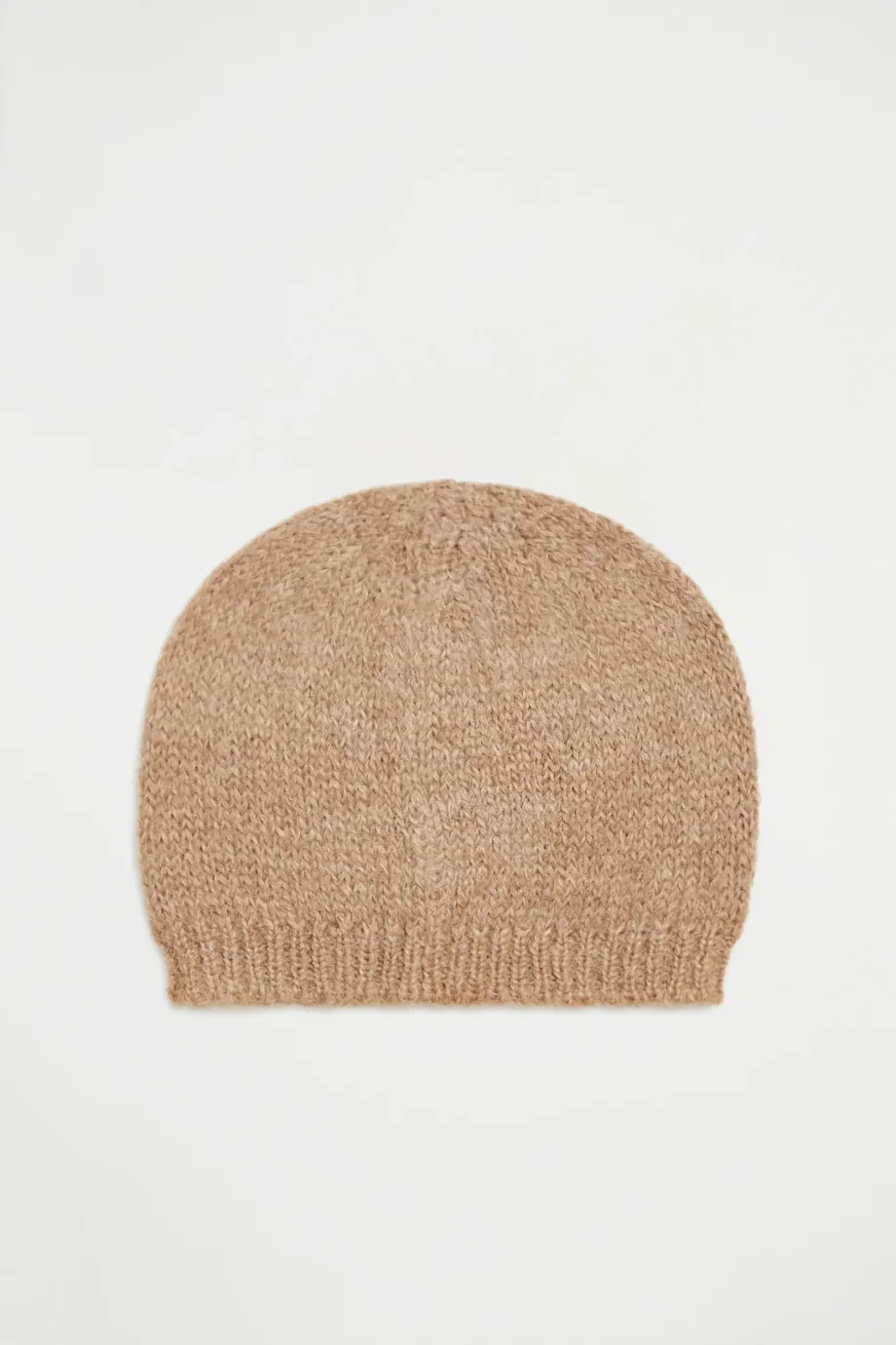 Čepice z směsi merino vlny a suri alpaky. Teplá pletenina s volným opletením single jersey, vyrobená na stroji o uiglení 3 GG. Barva camel.