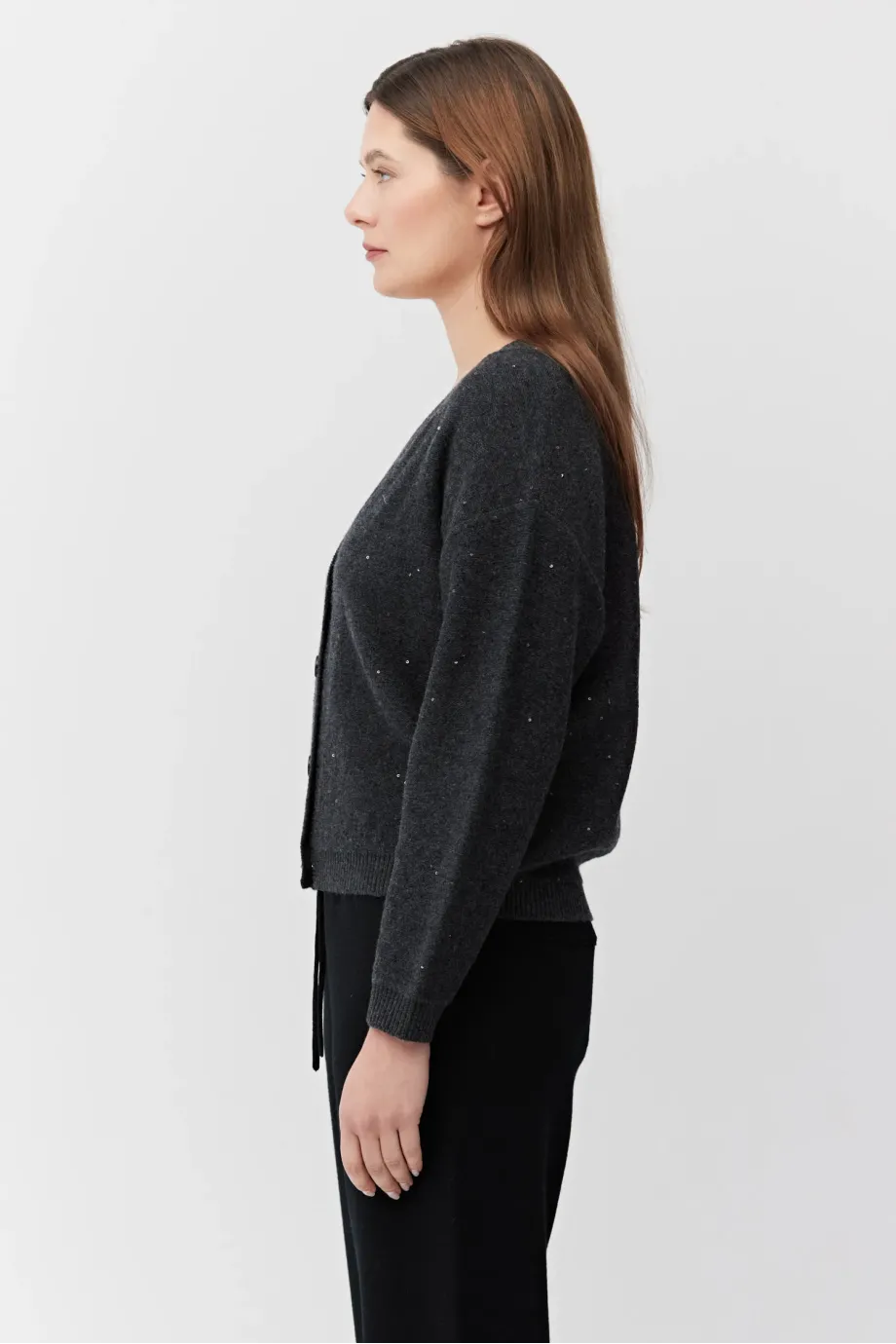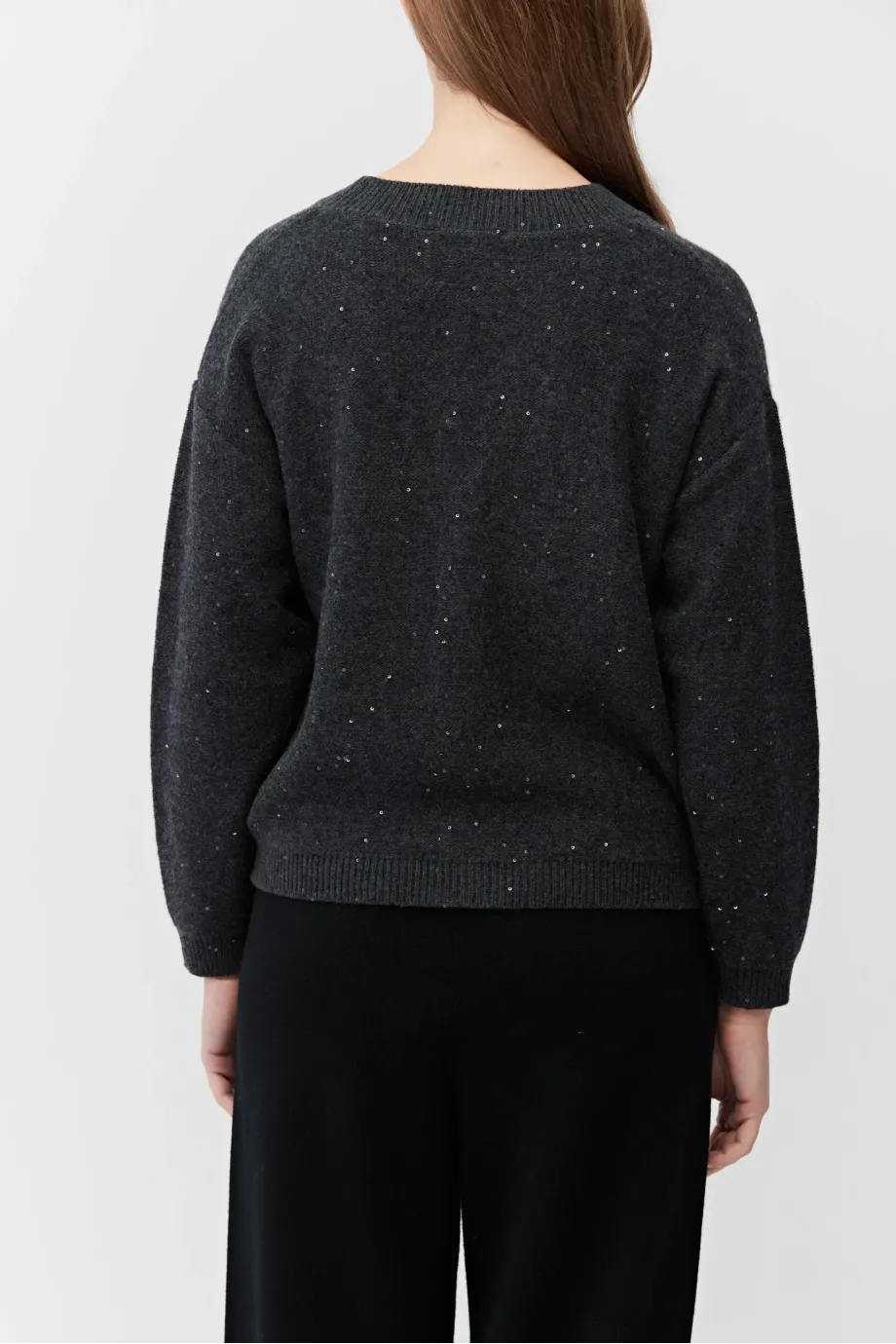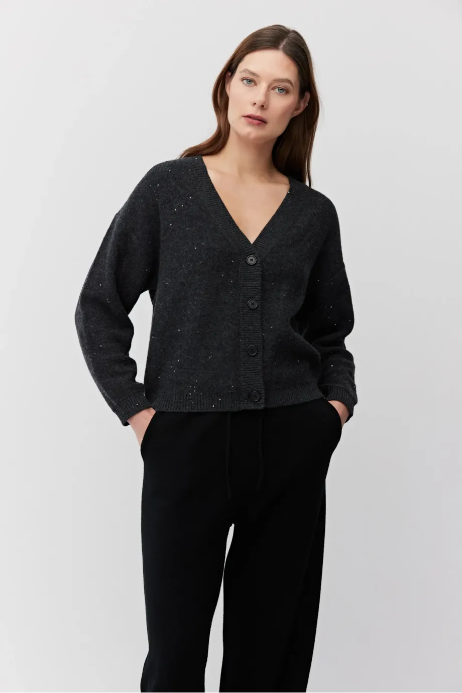Kardigan z směsi vlny. Zapínání na přírodní knoflíky. Dlouhý rukáv, výstřih do V. Volně vetkané flitry v barvě stříbra. Měkká pletenina, s úpletem reverse jersey, vyrobená na stroji s uiglením 7 GG. Barva tmavě šedá.