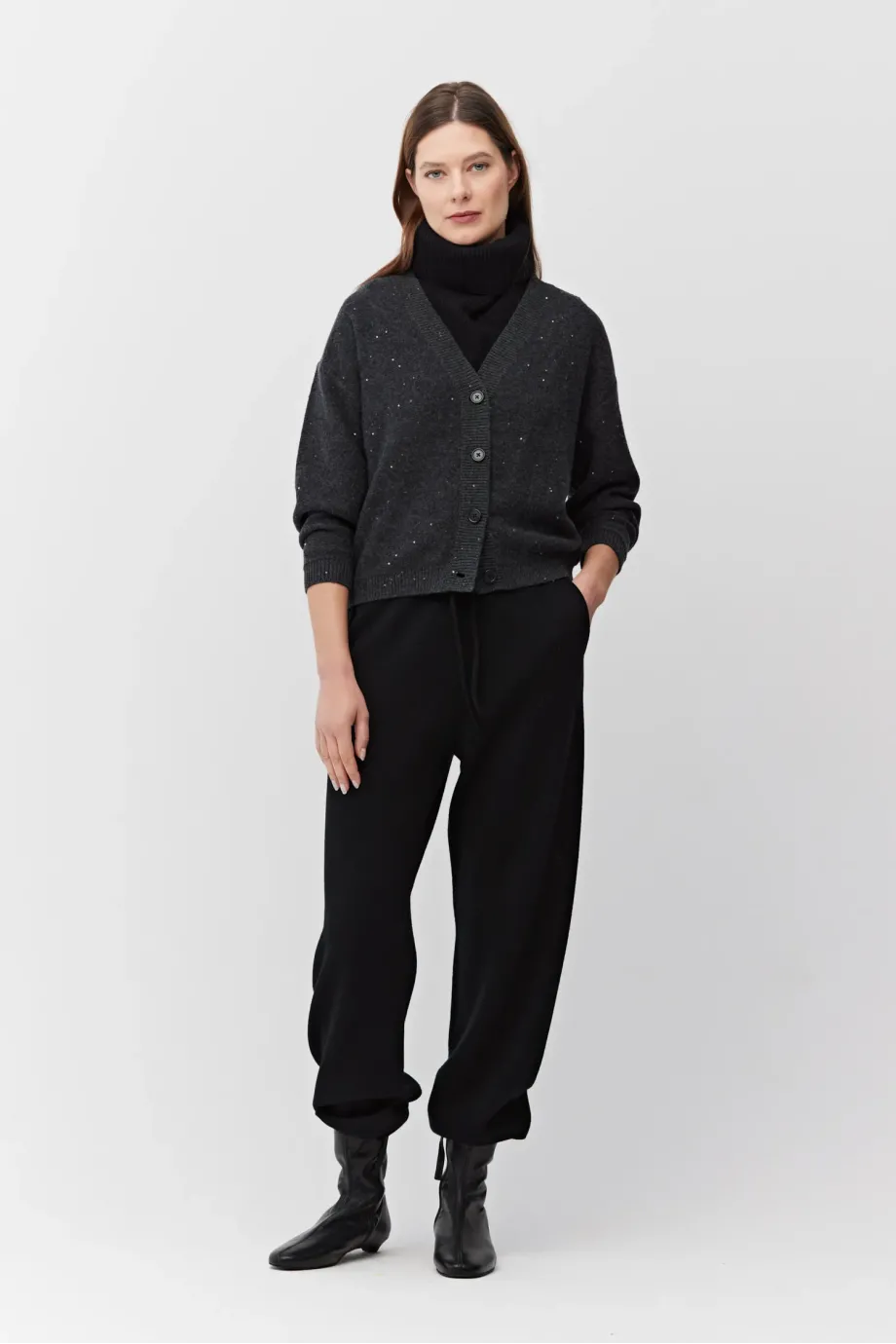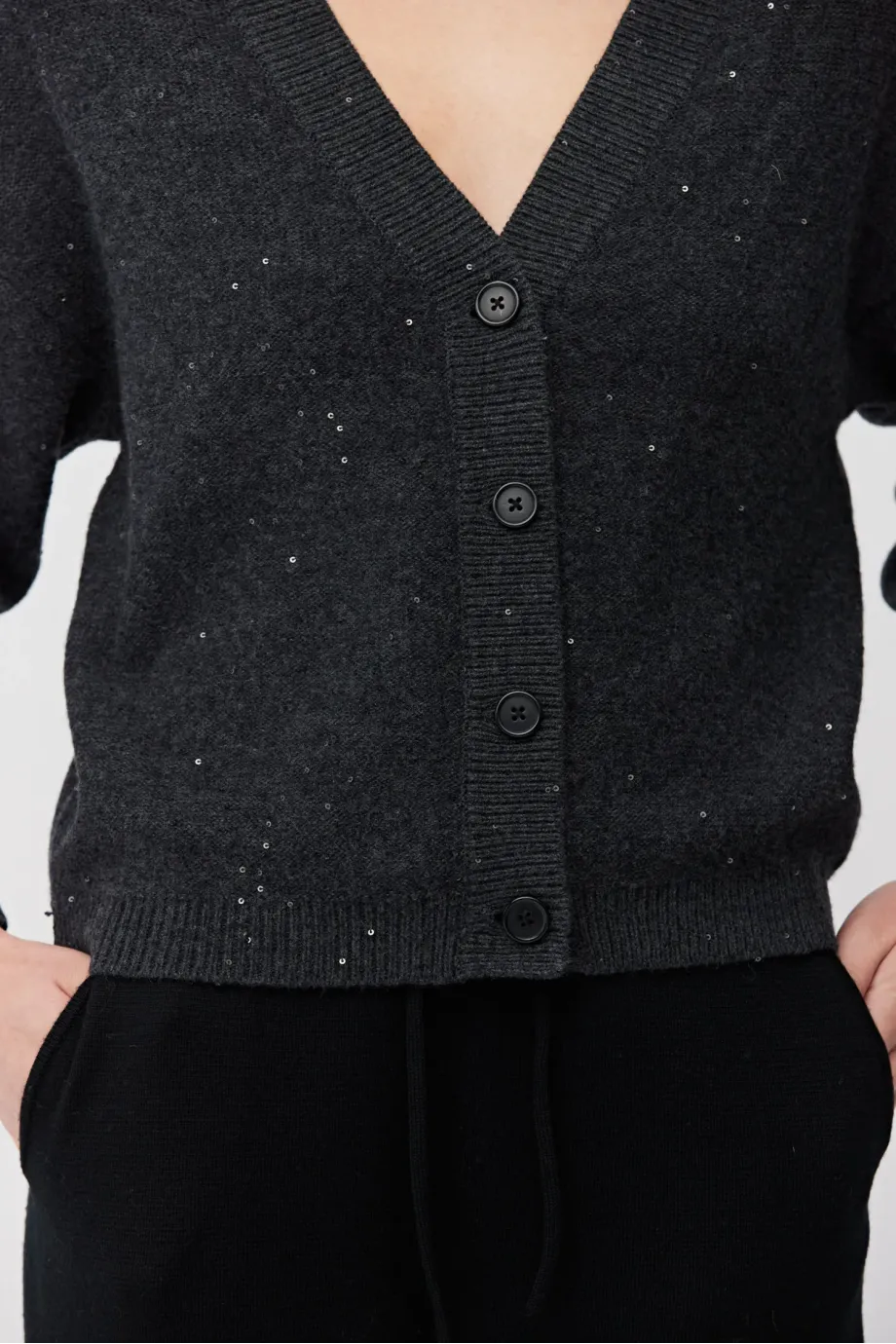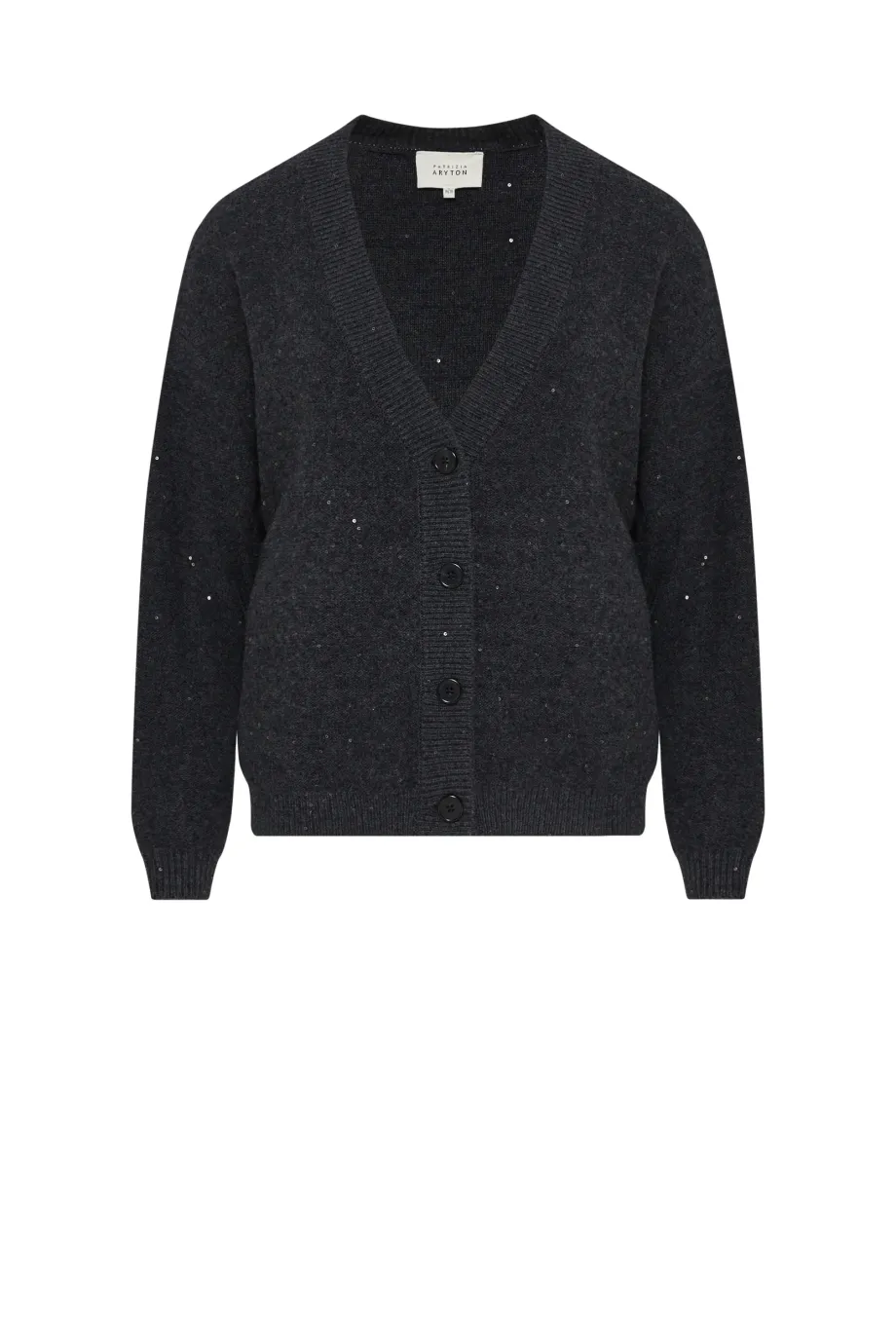 Kardigan z směsi vlny. Zapínání na přírodní knoflíky. Dlouhý rukáv, výstřih do V. Volně vetkané flitry v barvě stříbra. Měkká pletenina, s úpletem reverse jersey, vyrobená na stroji s uiglením 7 GG. Barva tmavě šedá.