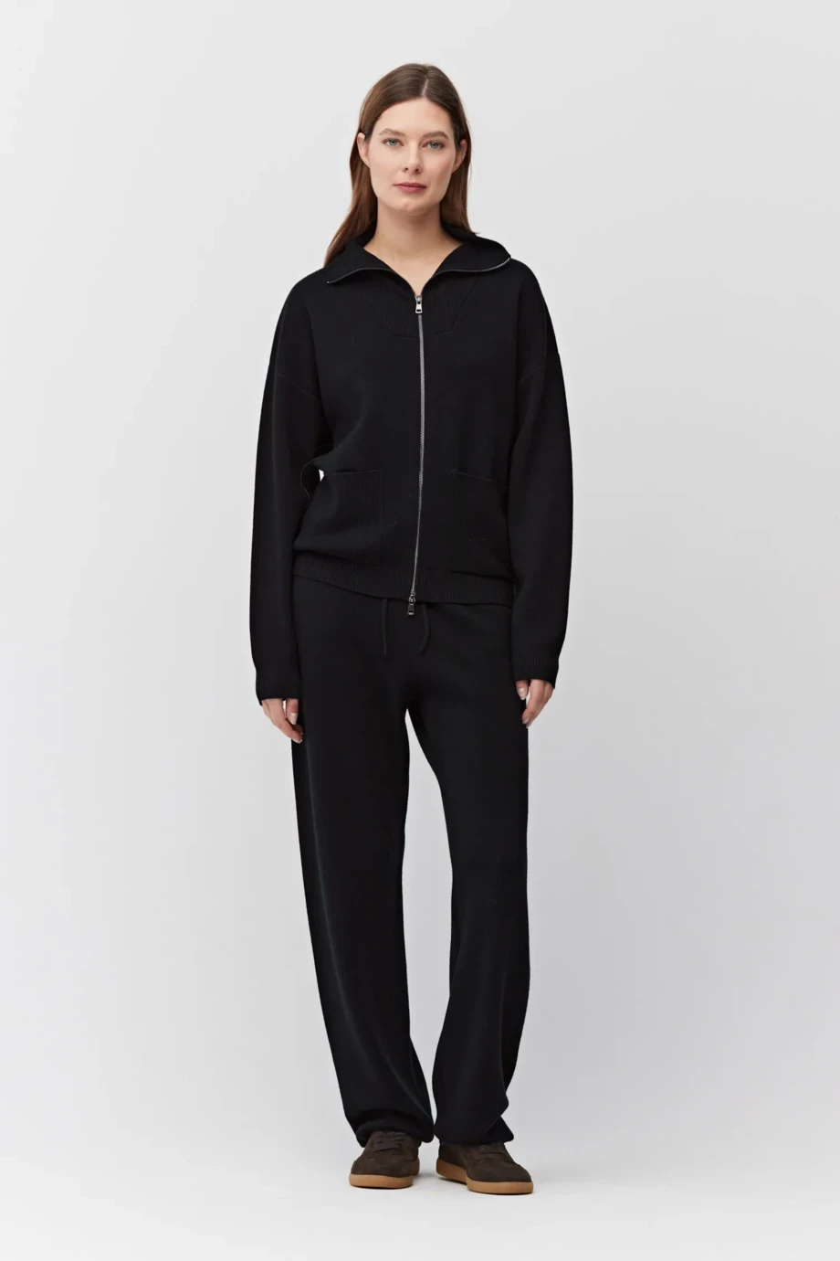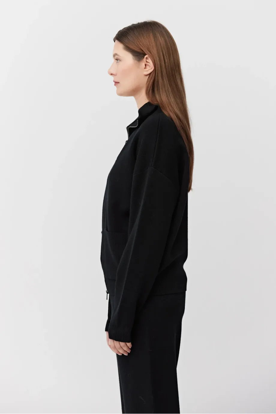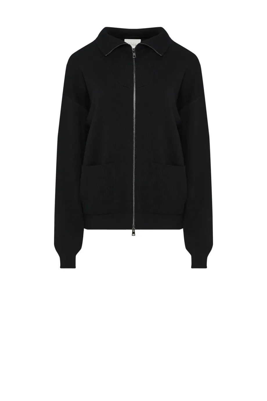 Svetr z merino vlny. Zapínání na dvoucestný zip v barvě stříbra. Dlouhý rukáv, límec, kapsy. Styl rovný, volný. Měkká pletenina s milánským vzorem, připravená na stroji s uigením 12 GG. Barva černá. K doplnění sady kalhoty.