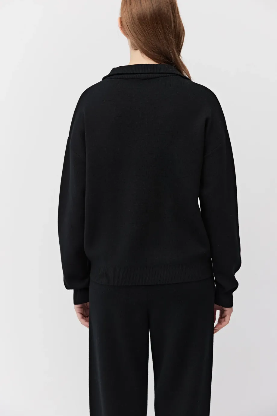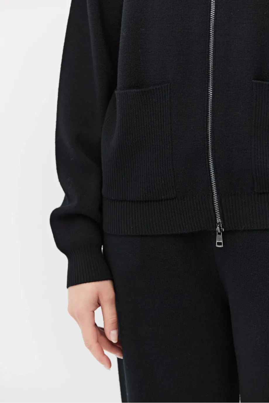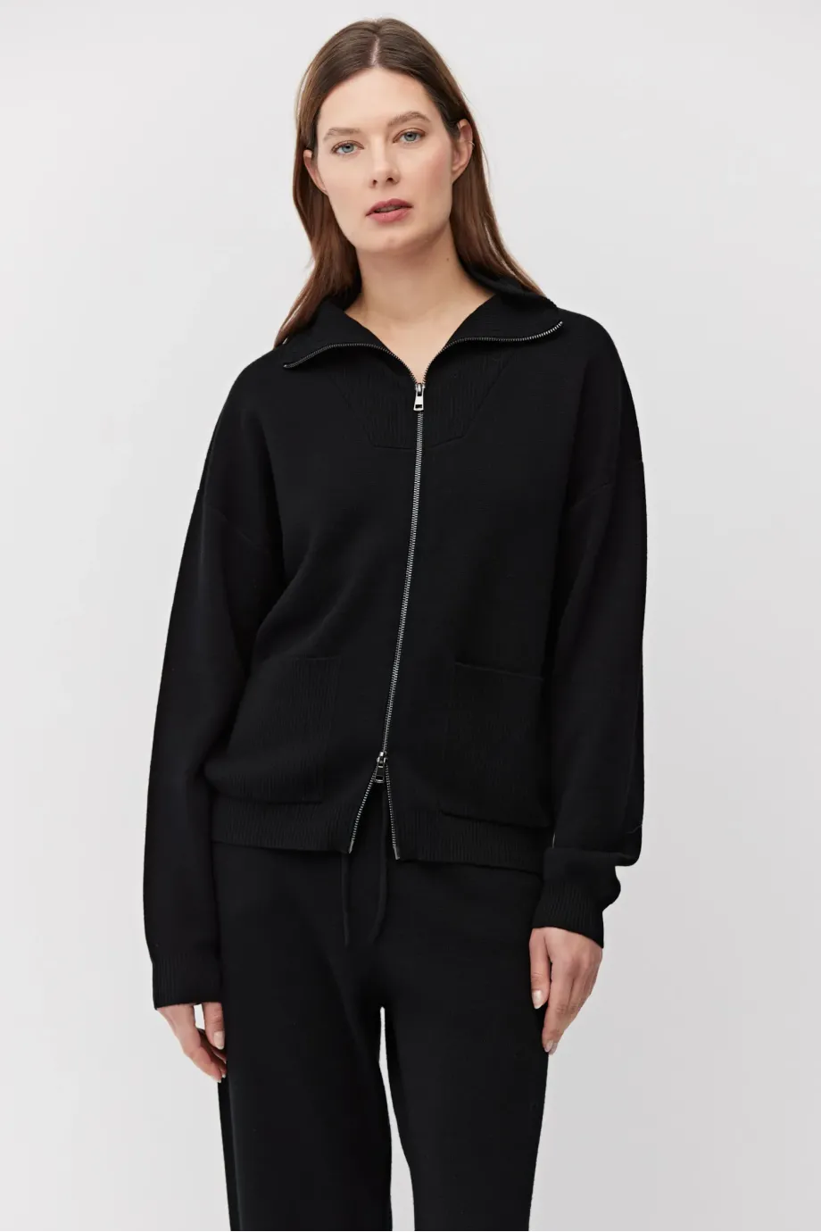Svetr z merino vlny. Zapínání na dvoucestný zip v barvě stříbra. Dlouhý rukáv, límec, kapsy. Styl rovný, volný. Měkká pletenina s milánským vzorem, připravená na stroji s uigením 12 GG. Barva černá. K doplnění sady kalhoty.