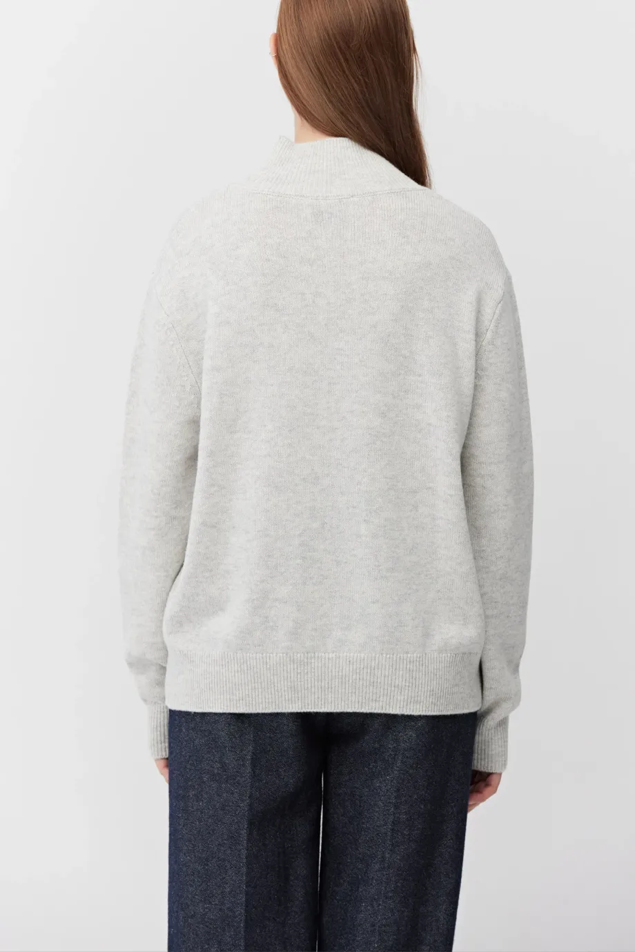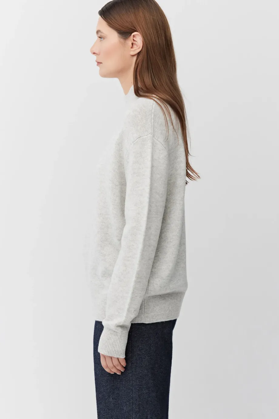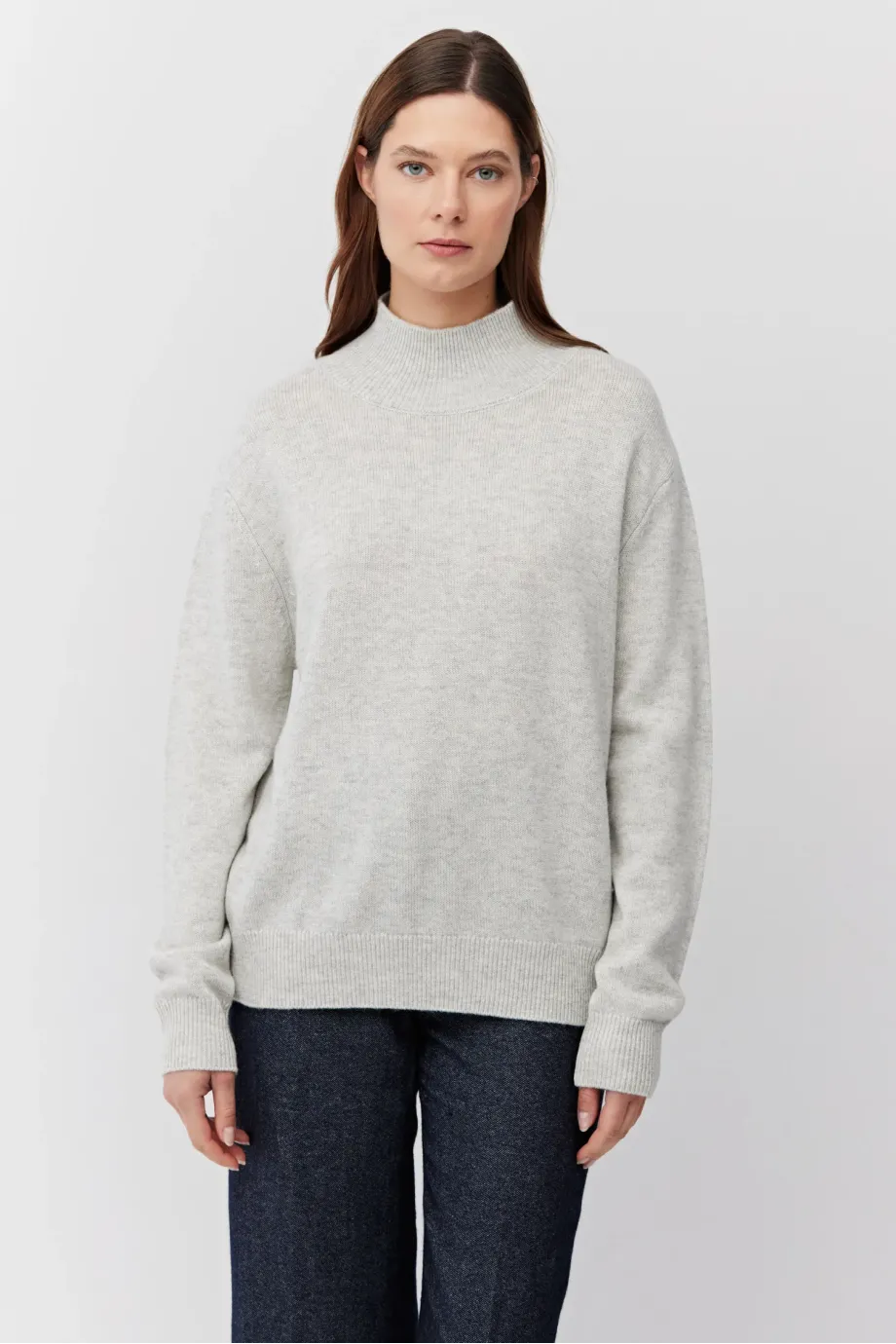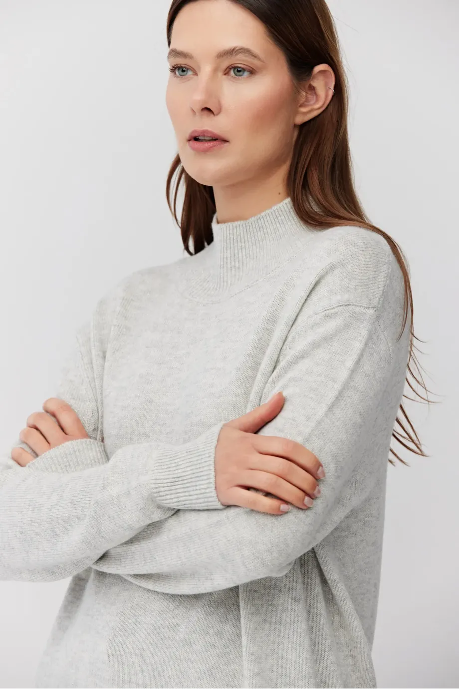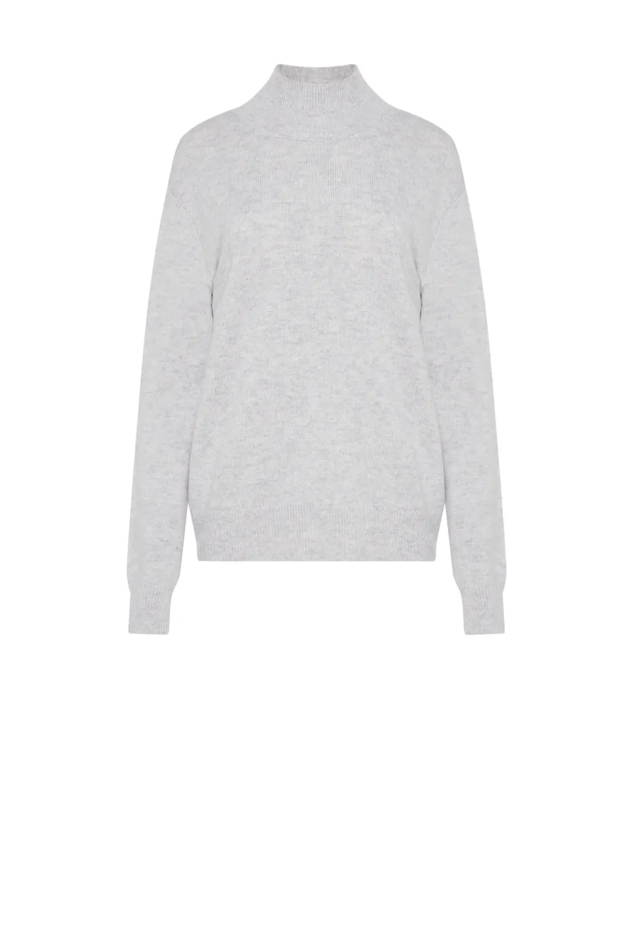 Svetr z merinovlny a kašmíru. Poloviční rolák, dlouhý rukáv. Měkká pletenina v úpletu single jersey, připravená na stroji s upletem 7 GG. Barva světle šedá.