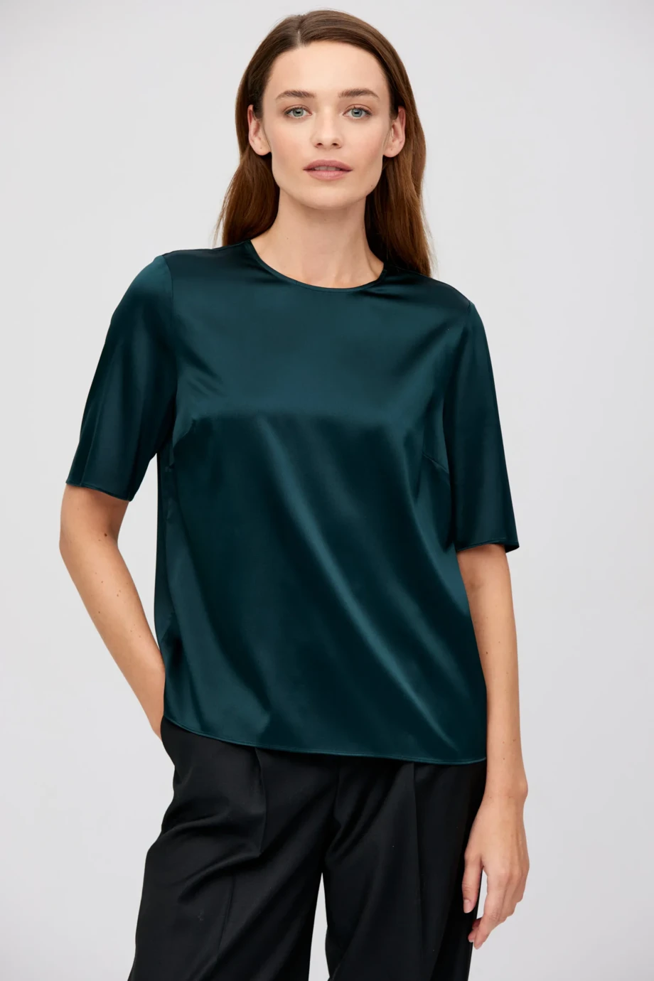 Smaragdová blůza z hedvábí. Krátký rukáv, kulatý výstřih, jednoduchý střih. Na zadní straně zapínání na knoflík. Model je k dispozici také v černé barvě.