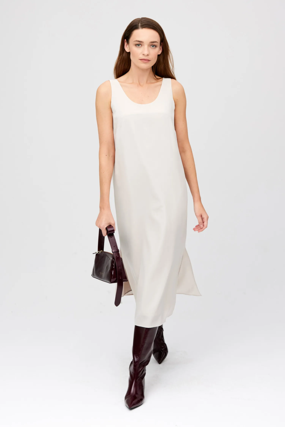 Šaty z hedvábí. Široká ramínka, kulatý výstřih. Délka midi. Barva béžová.