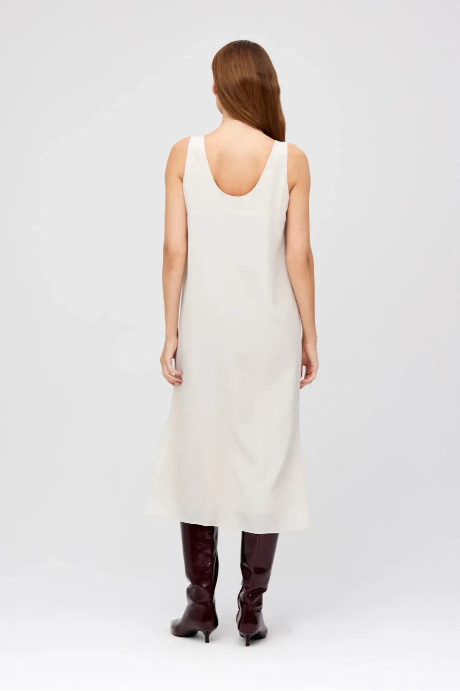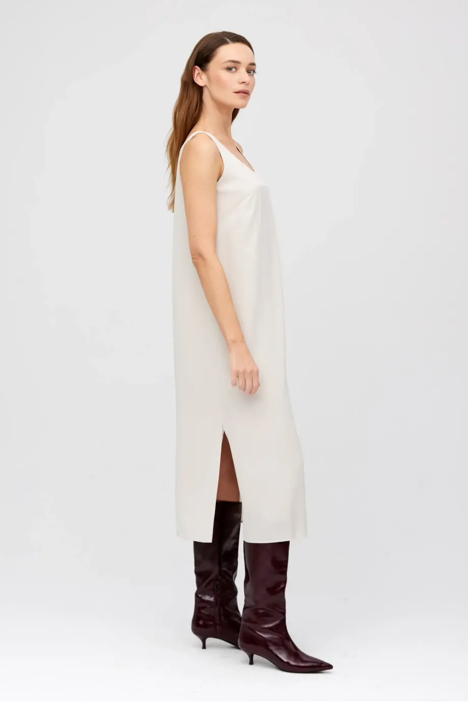 Šaty z hedvábí. Široká ramínka, kulatý výstřih. Délka midi. Barva béžová.