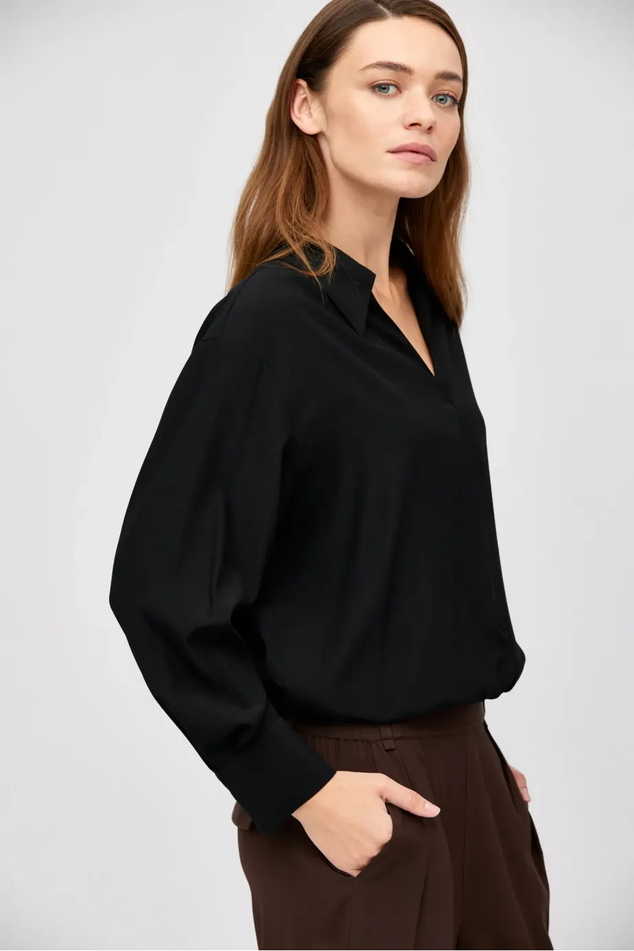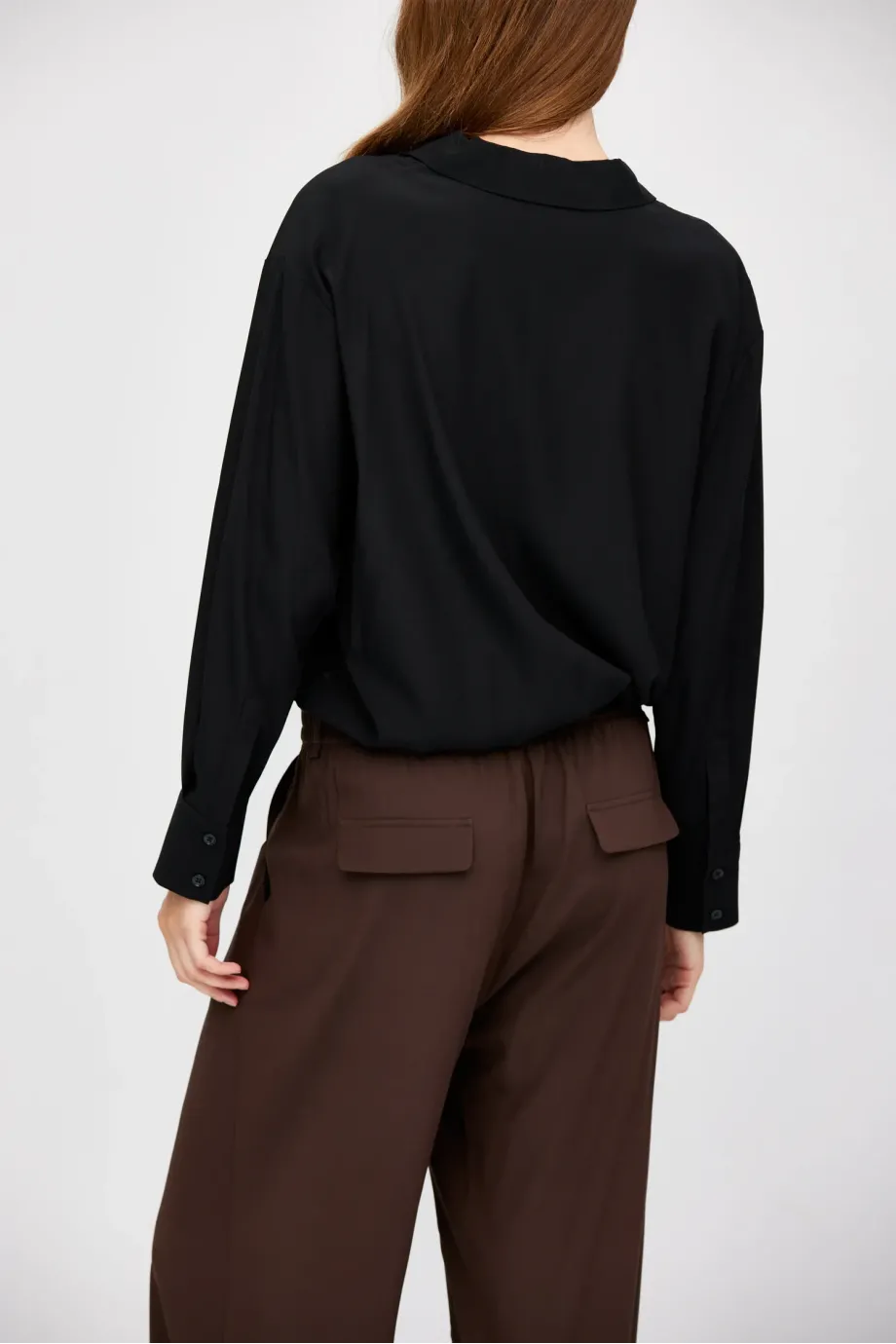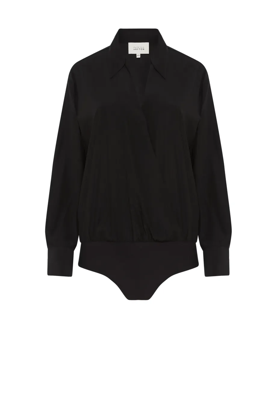 Černé body z hedvábí. Dlouhý rukáv s manžetou, límeček. Vrchní část volná, zavinovací.