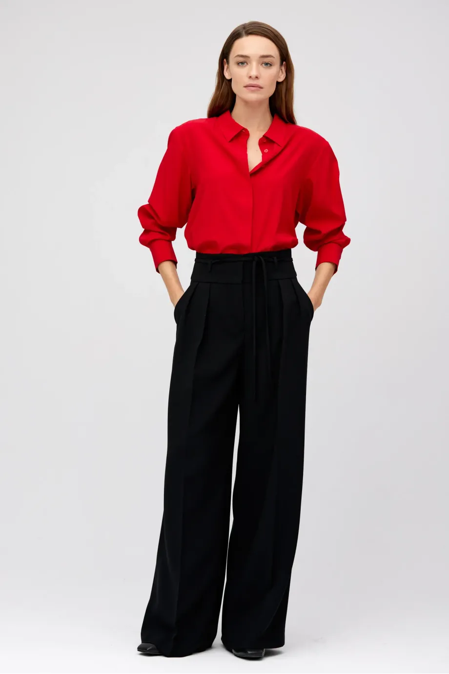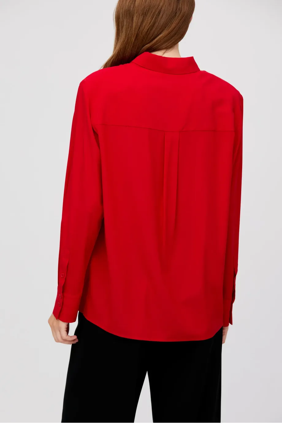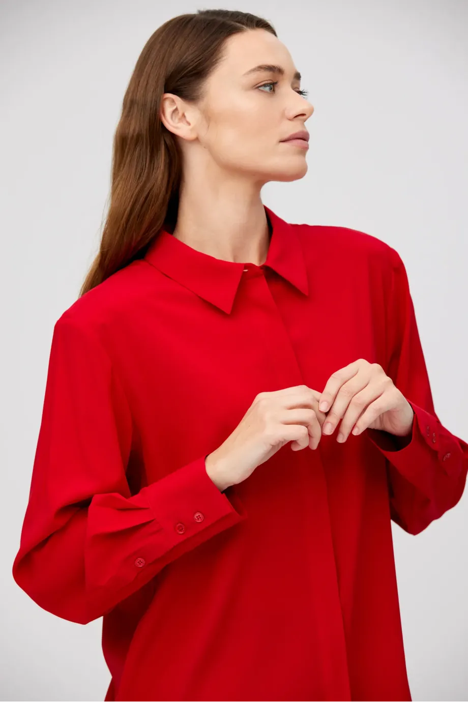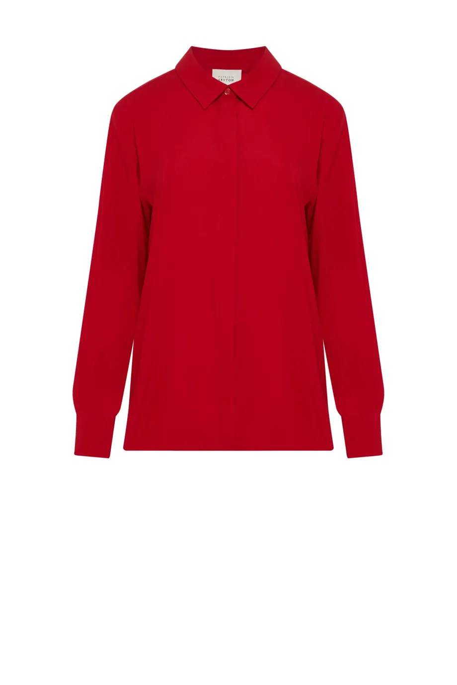 Hedvábná košile. Dlouhý rukáv, zapínání na knoflíky z perleťové mušle. Rovný střih, vzadu s kontrafaldou. Barva červená.