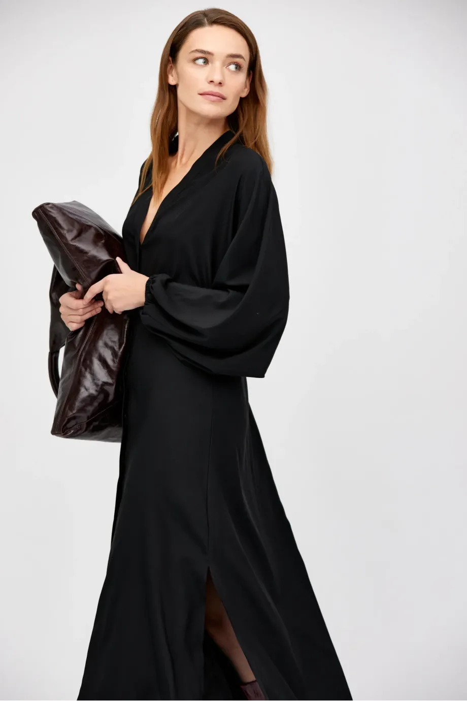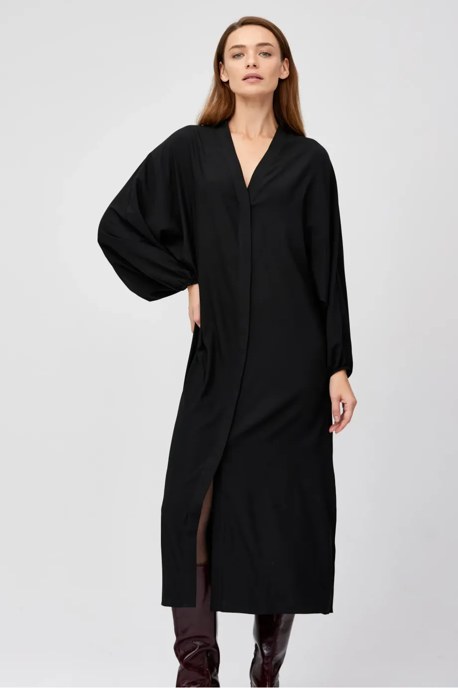 Šaty z hedvábí. Výstřih do špičky. Dlouhý, volný rukáv. Midi délka. Barva černá.
