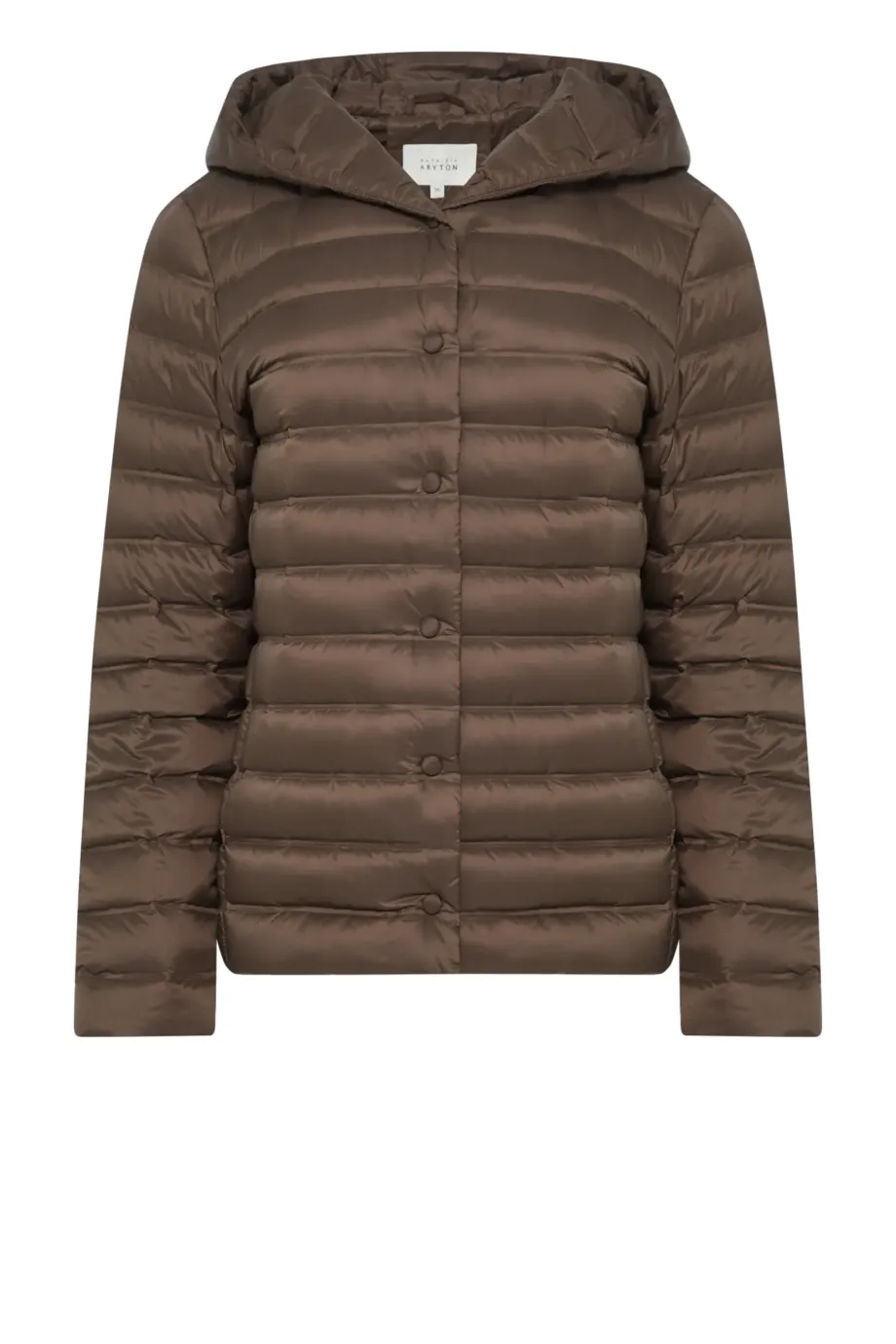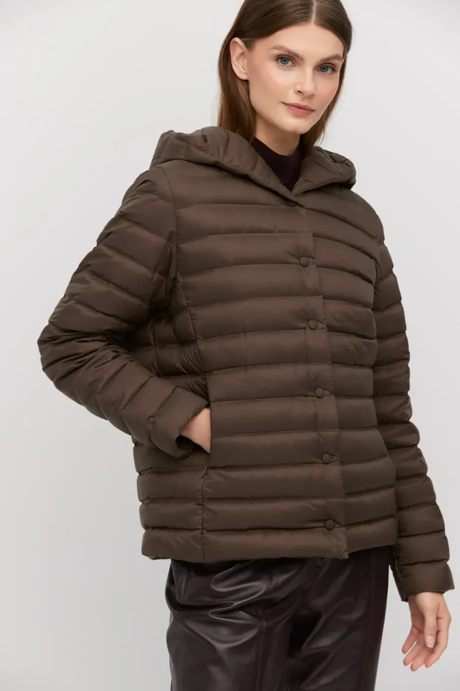 Krátká bunda s kapucí v chladném odstínu hnědé, s přírodním péřovým vyplněním. Lehká, se zapínáním na patentky a praktickými kapsami. Na nošení samostatně nebo jako přitápění pod kabát.
