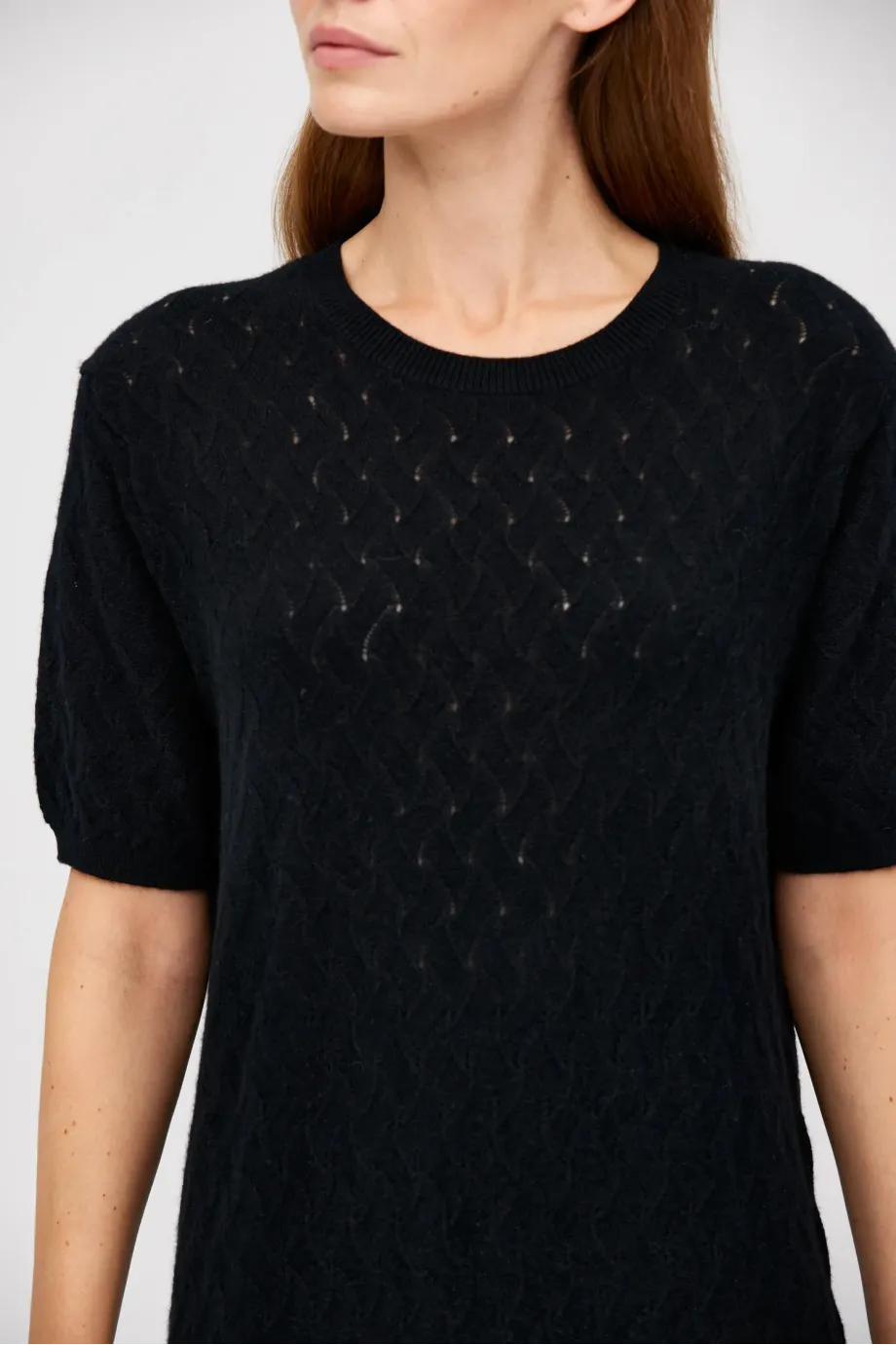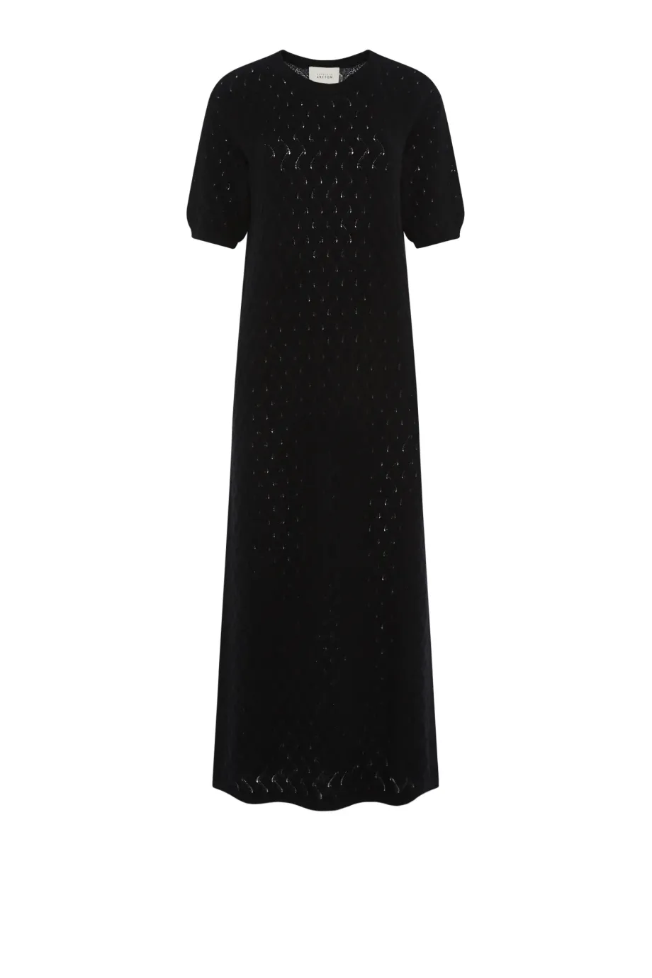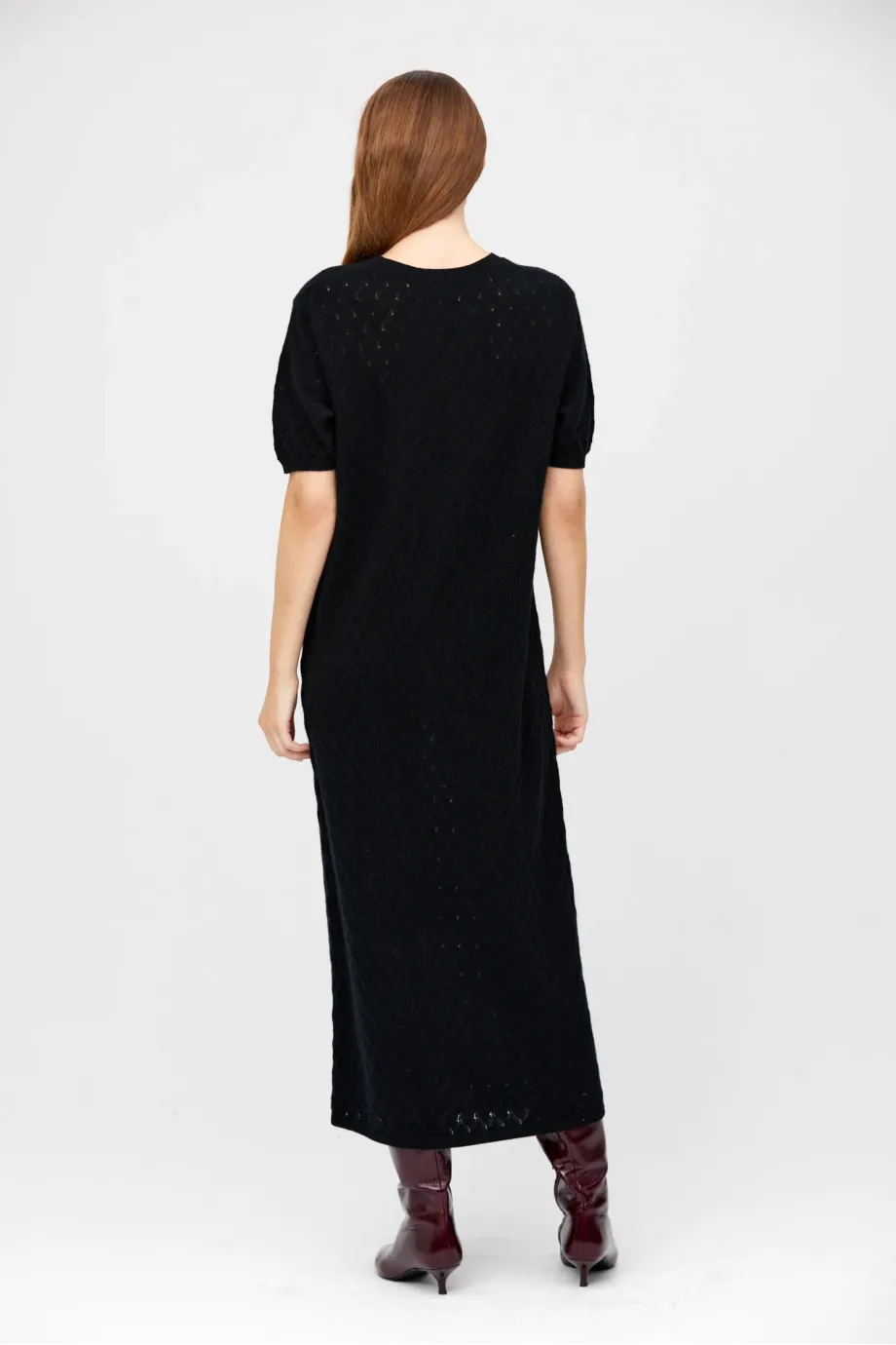 Šaty z merino vlny a příměsi alpaky. Kulatý výstřih, krátký rukáv, jednoduchý střih. Délka midi. Barva černá.