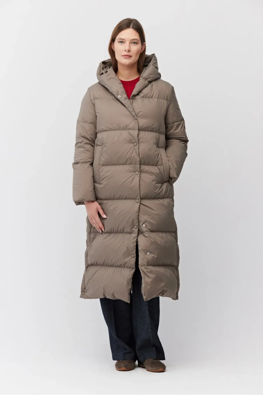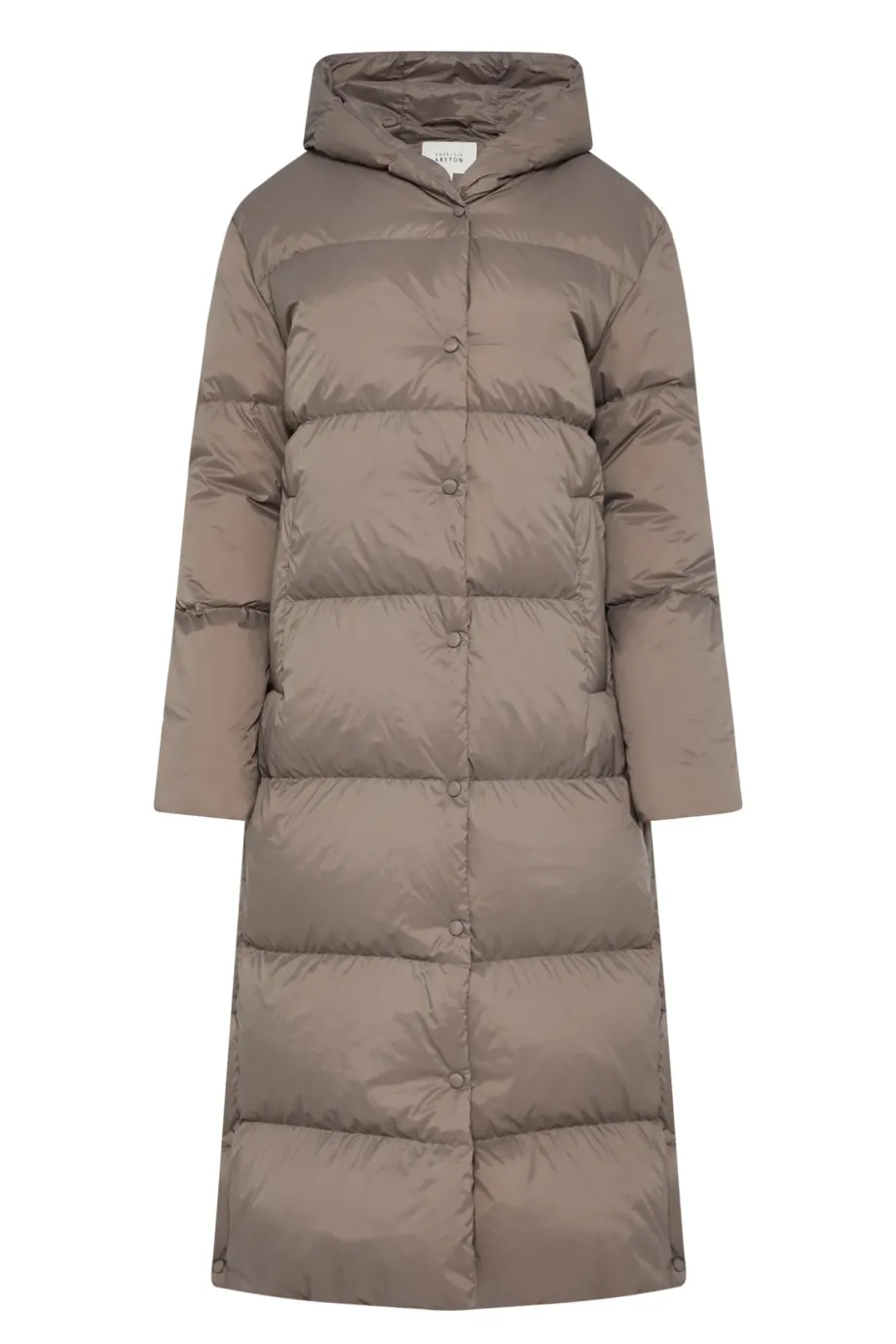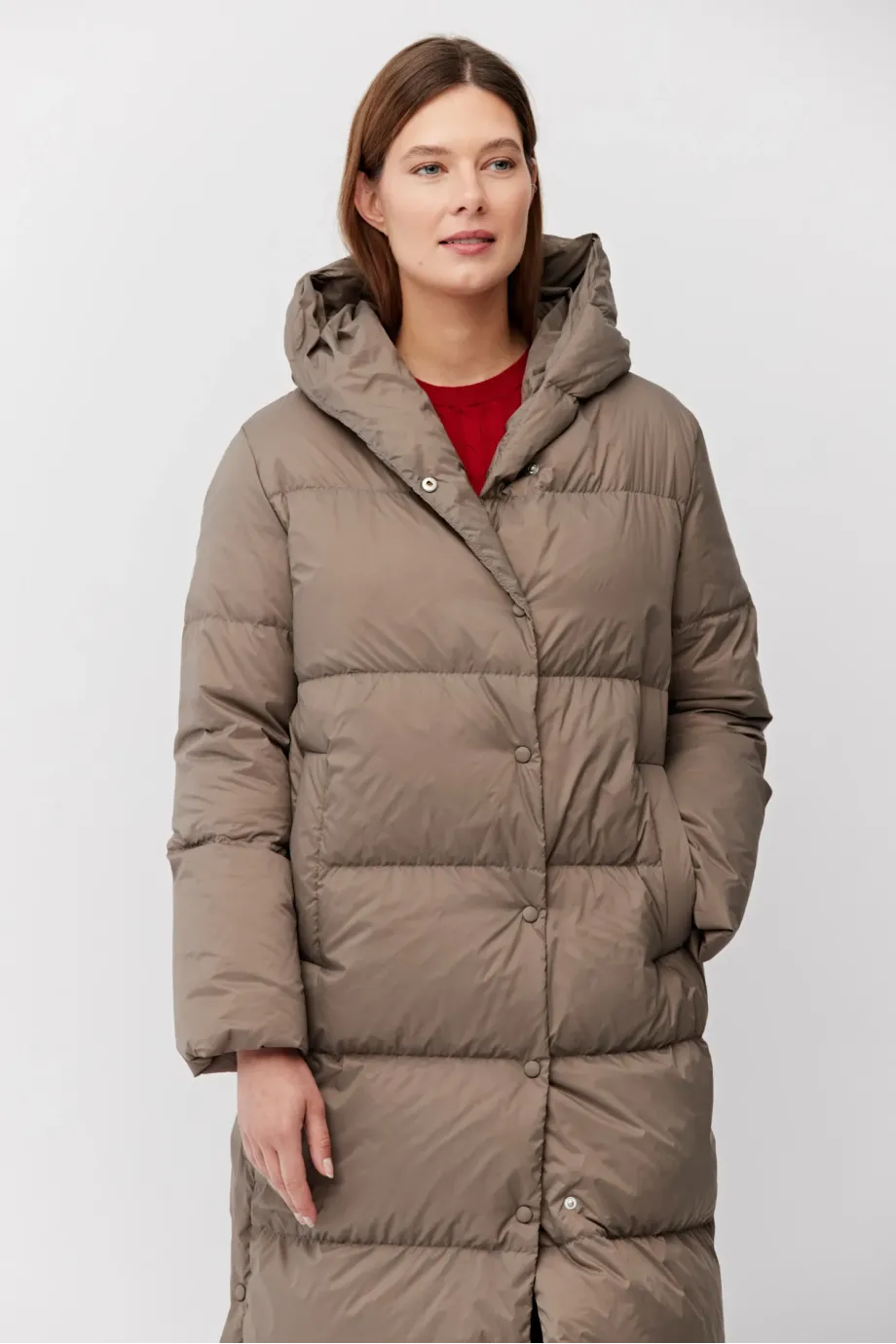 Bunda s kapucí vyplněná přírodním peřím. Volný střih, zapínání na patentky, kapuce, kapsy. Barva béžová.