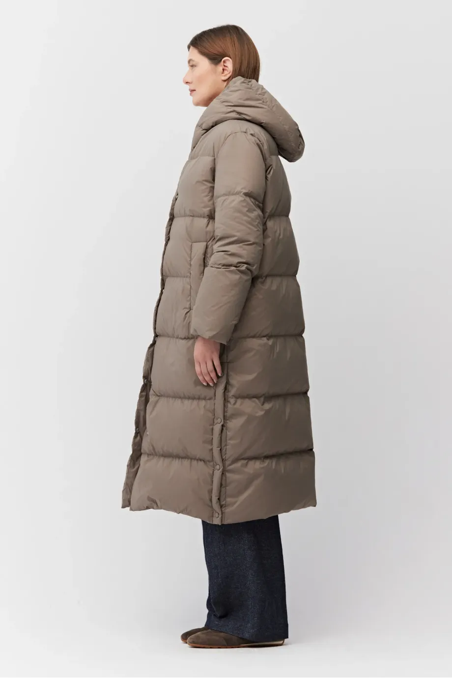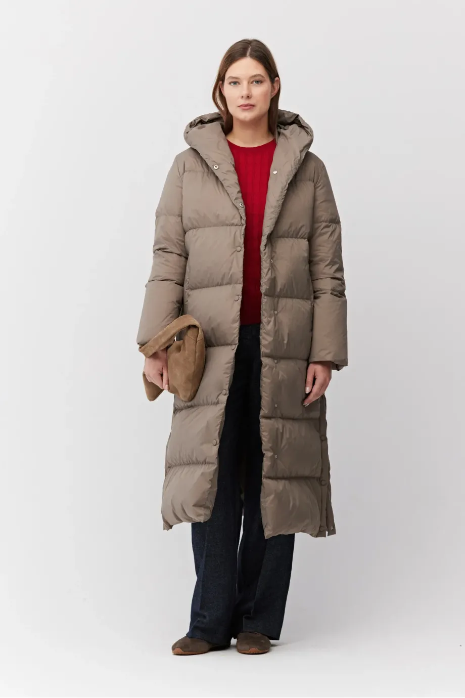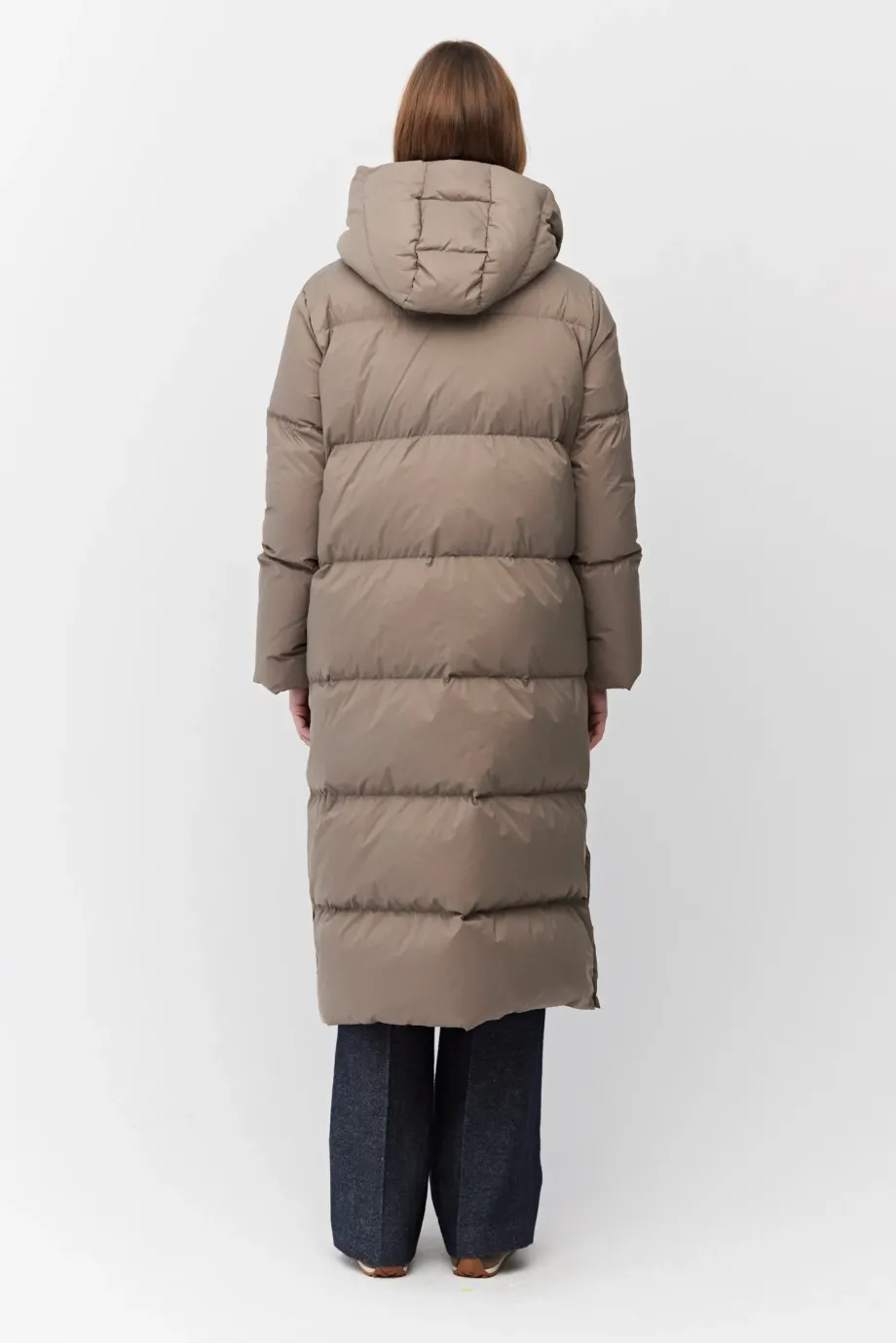 Bunda s kapucí vyplněná přírodním peřím. Volný střih, zapínání na patentky, kapuce, kapsy. Barva béžová.