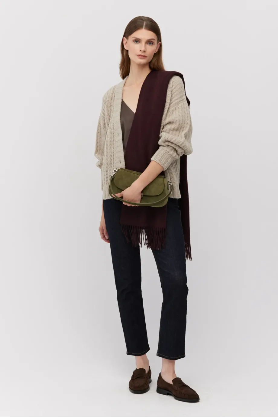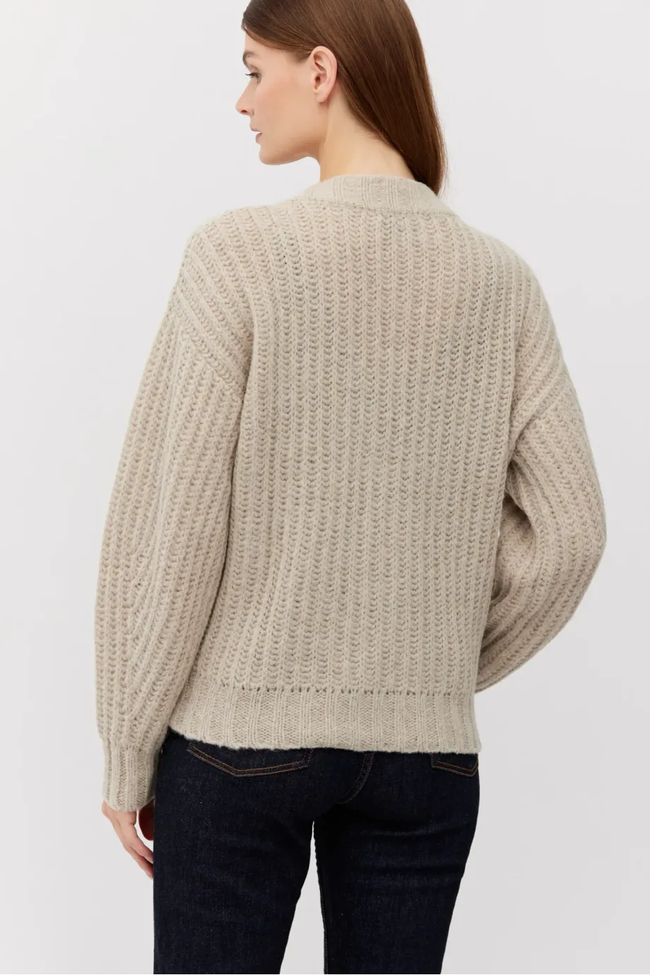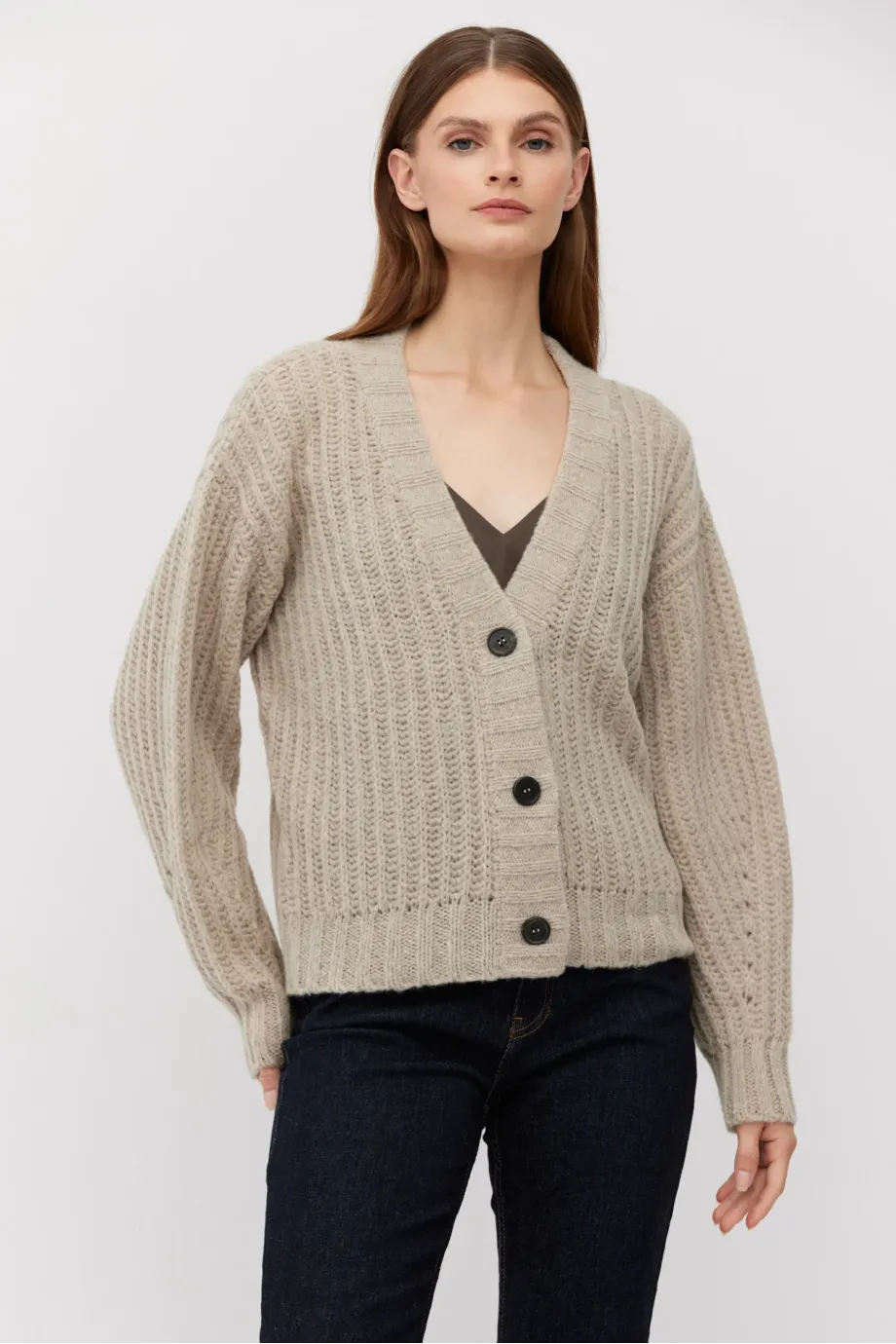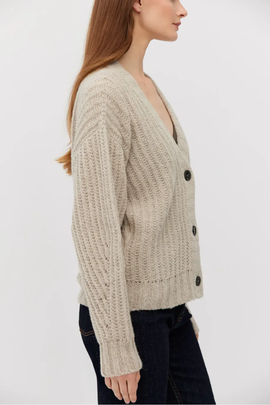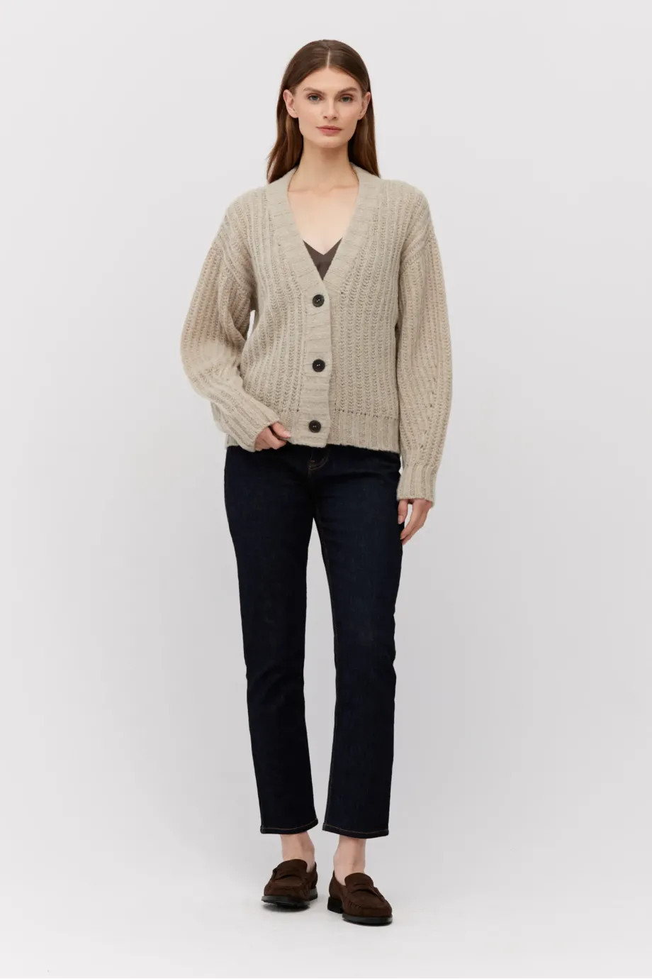 Kardigan z baby alpakou. Zapínání na knoflíky, s dlouhým rukávem. Měkká pletenina s volným úpletem anglického žerzeje, vyrobená na stroji s uiglením 3 GG. Střih je volný.
