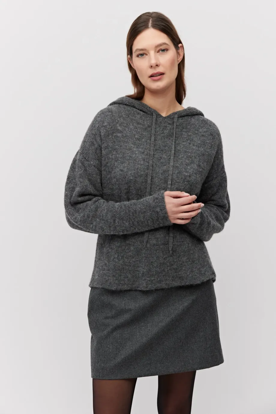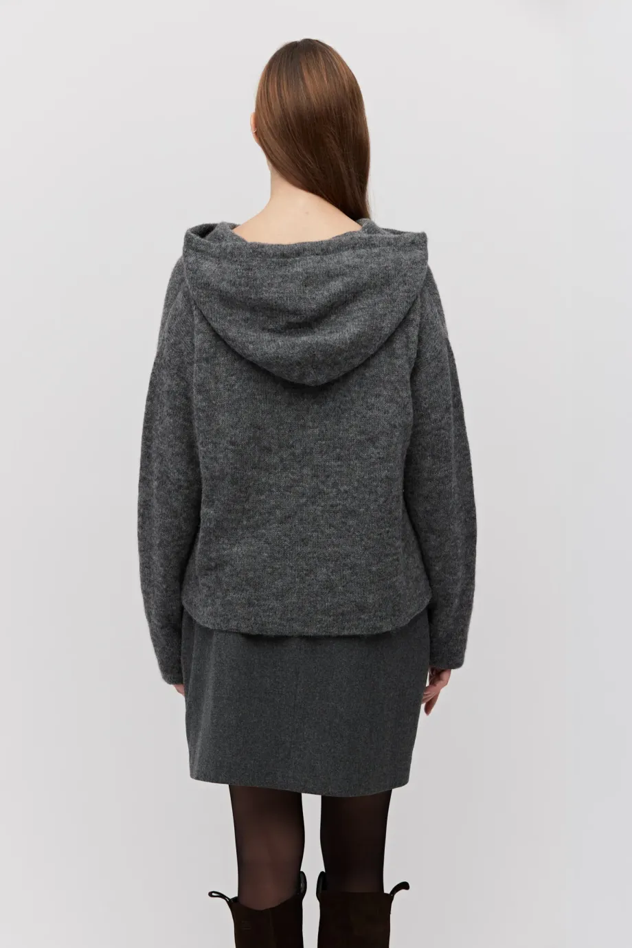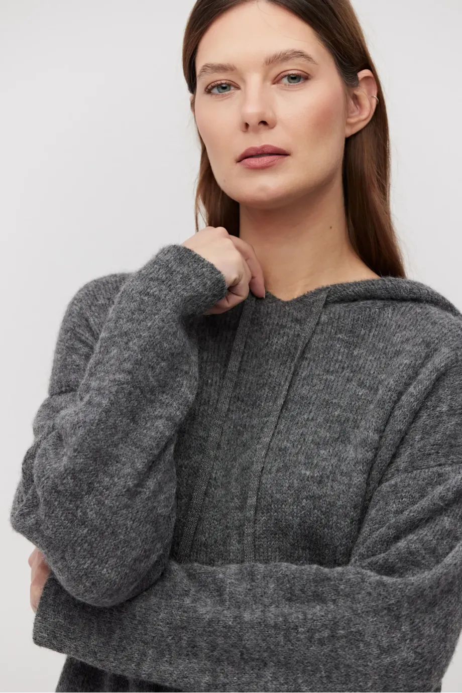 Mikina s kapucí z vlny baby alpaky. Masivní, teplá pletenina s volnou vazbou double sided knit, vyrobená na stroji s uiglením 5 GG. Jednoduchý střih, dlouhý rukáv, nastavitelná kapuce. Barva tmavě šedá.